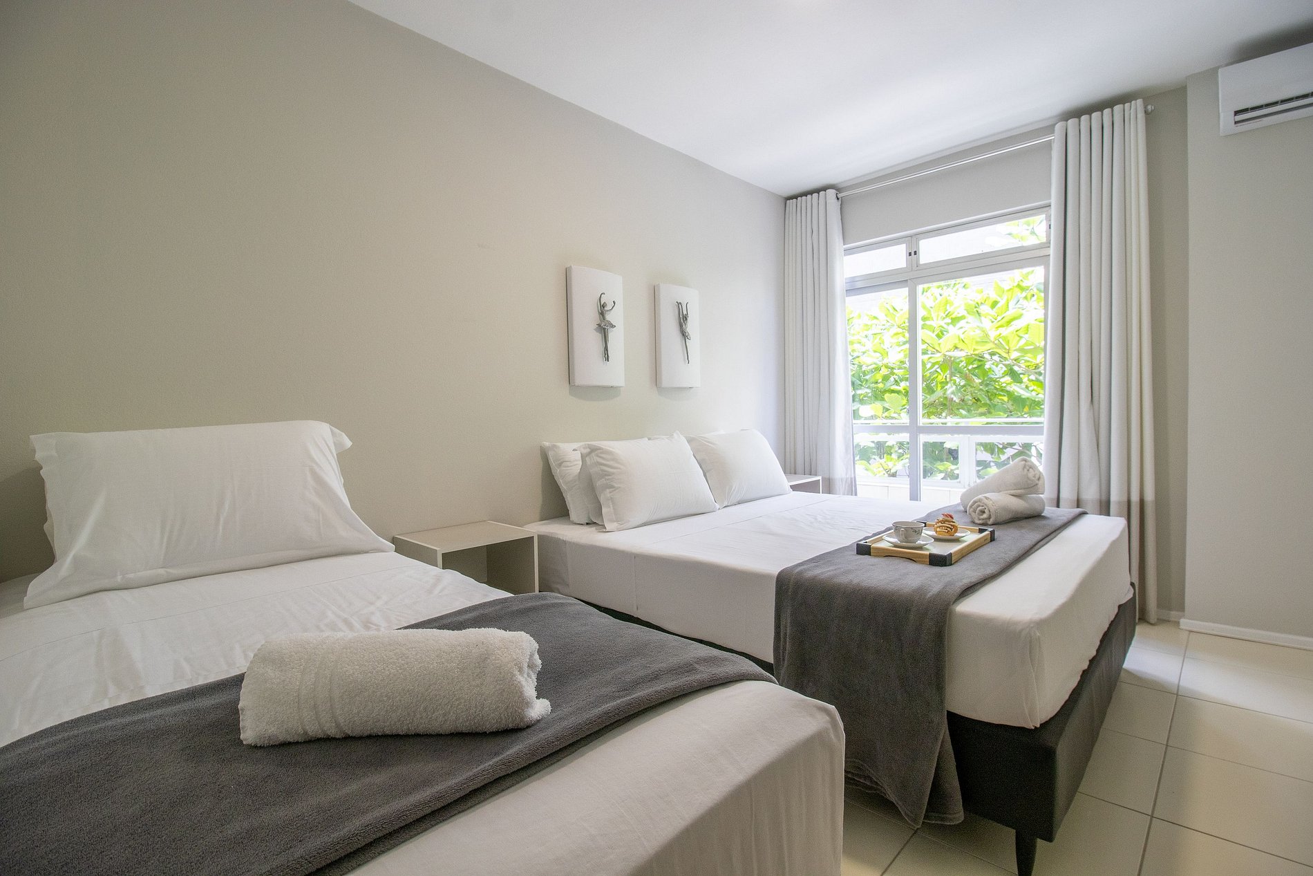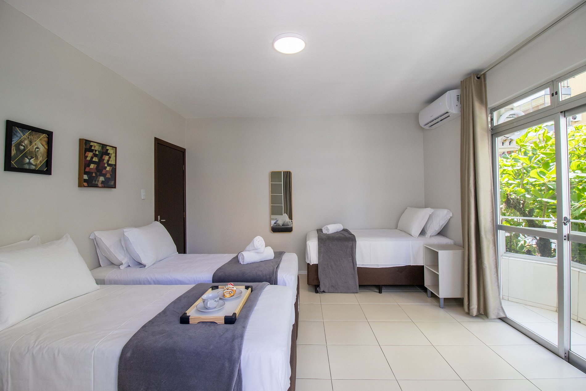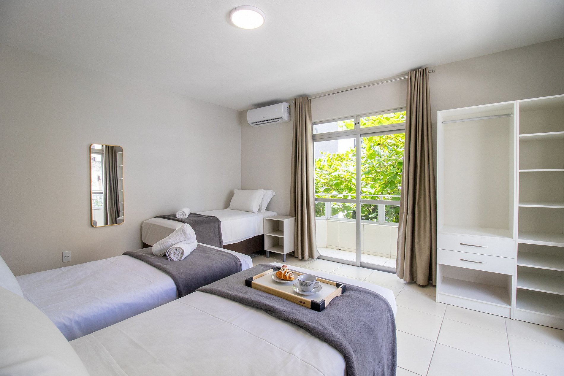 O espaço possui três ares condicionados split, apenas na função resfriamento, sendo um em cada dormitório.