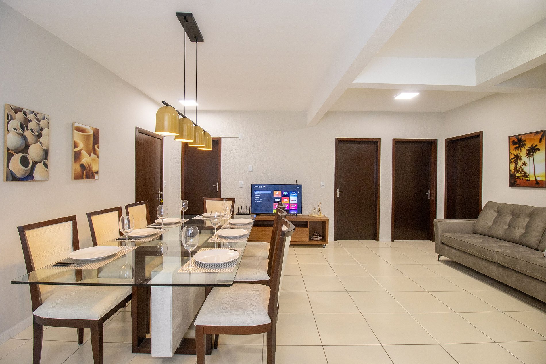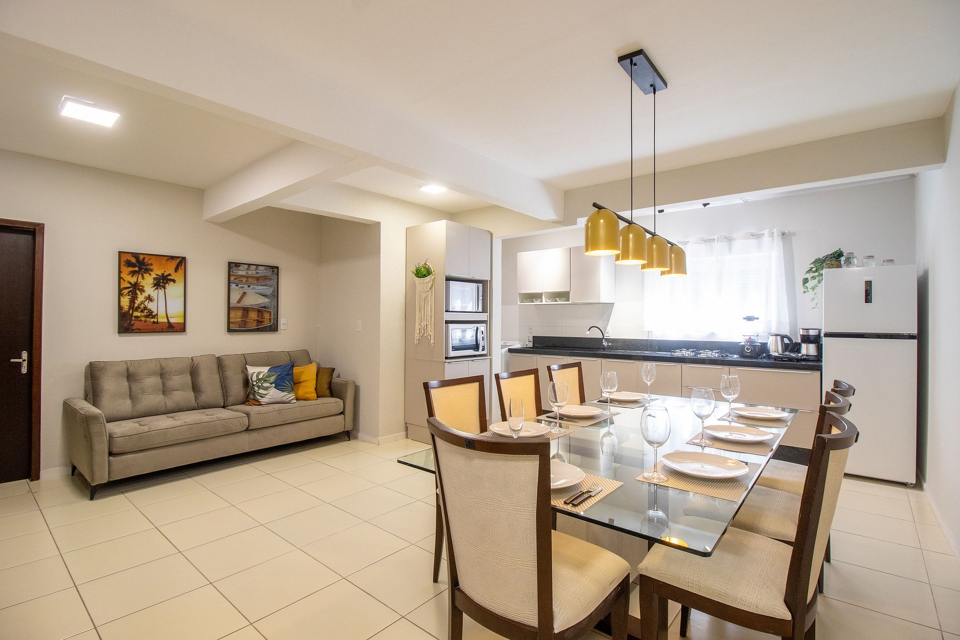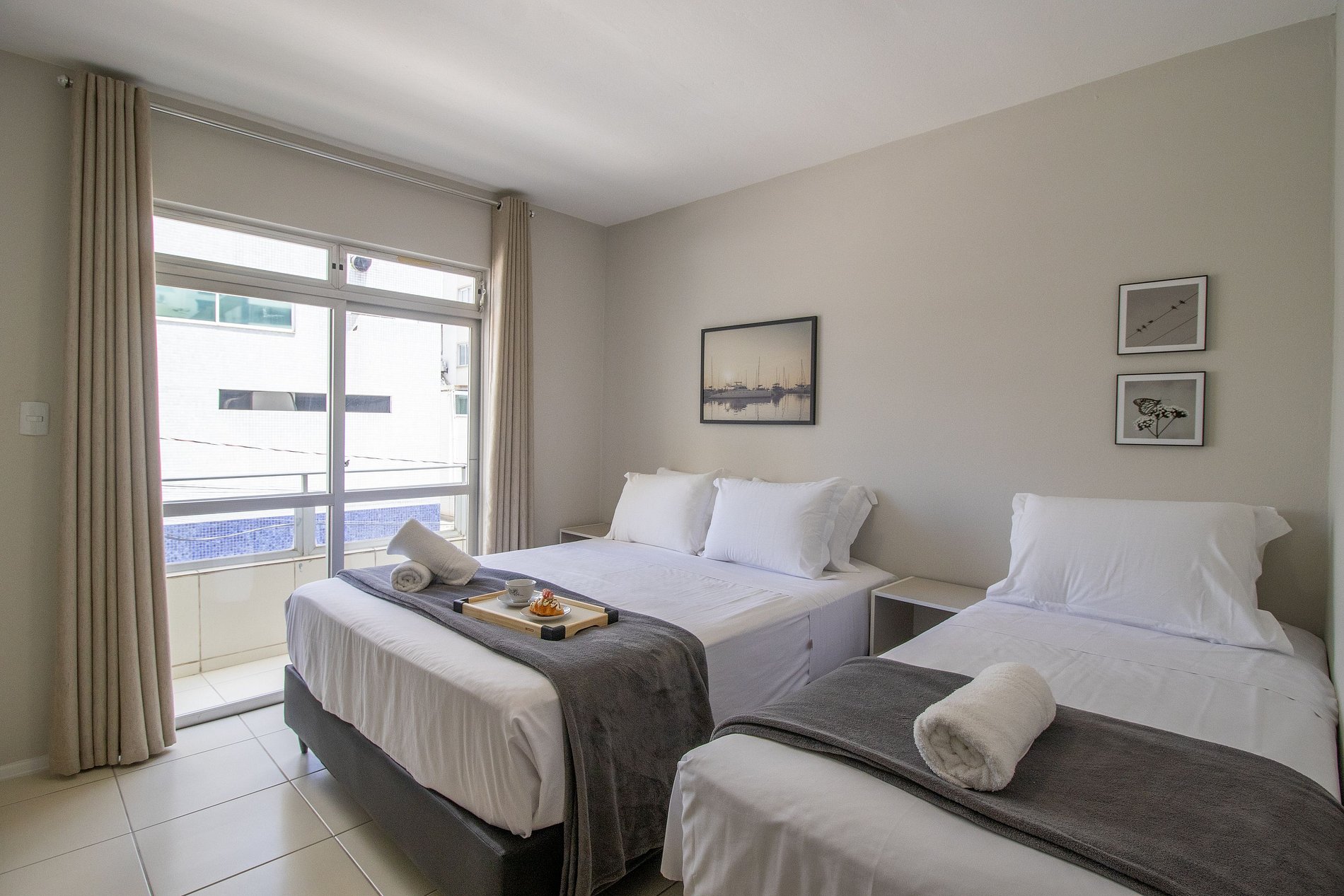 O apartamento conta com três dormitórios com sacada. O primeiro dormitório possui uma cama queen e uma cama de solteiro; o segundo dormitório possui três camas de solteiro e uma cama auxiliar; e o terceiro dormitório conta com uma cama queen e uma cama de solteiro. Acomodando até 10 pessoas confortavelmente. Há dois banheiros sociais com chuveiros elétricos. A sala de estar é aconchegante com TV smart, sala de jantar com uma mesa que acomoda 7 pessoas. A cozinha é equipada com utensílios para o preparo de refeições básicas, microondas, liquidificador, cafeteira e sanduicheira e chaleira elétrica. Temos também ferro de passar roupas e secador de cabelos.