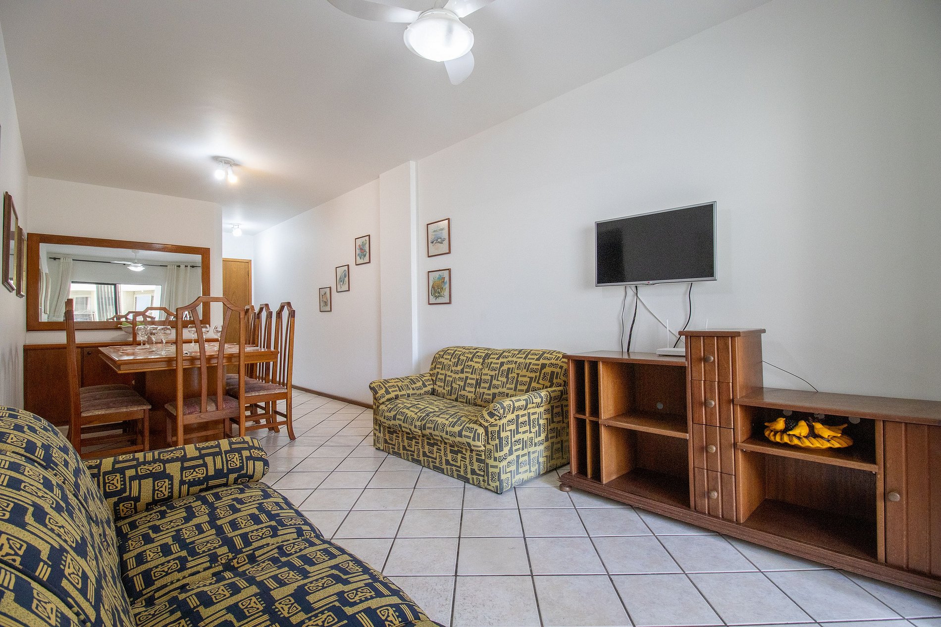 O apartamento conta com uma suíte e mais dois dormitórios, ao total temos uma cama de casal, uma cama queen, duas camas de solteiro e dois colchões de solteiro avulso. Conta com dois banheiros com chuveiros elétricos. Sala com TV e uma mesa de jantar que acomoda até 8 pessoas confortavelmente. A cozinha conta com microondas, cafeteira, liquidificador, sanduicheira, chaleira elétrica, e utensílios básicos para realizar refeições deliciosas. Além disso, o espaço conta com ferro de passar roupa, secador de cabelo, máquina de lavar e varal para sua comodidade.