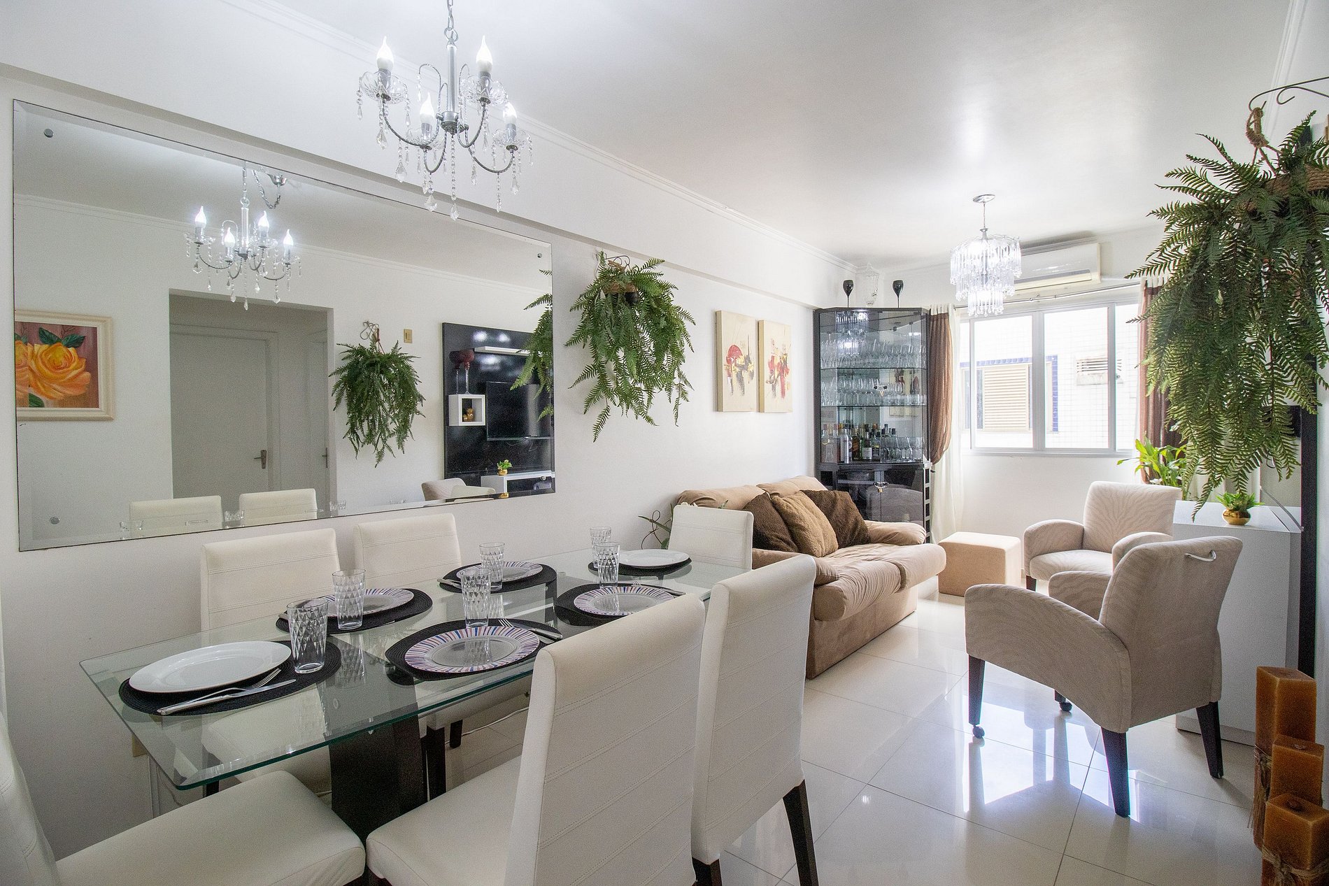 Esse apartamento é super prático e confortável! Possui um quarto com cama de casal e um banheiro social. A sala é bem agradável, com sofá cama e TV, e é conectada com a área de jantar, que tem mesa e cadeiras. A cozinha tem tudo o que você precisa, com fogão, geladeira, forno, microondas, além de liquidificador, sanduicheira e cafeteira elétrica. E ainda conta com máquina de lavar, secador de cabelo e ferro de passar, pra facilitar a sua vida.