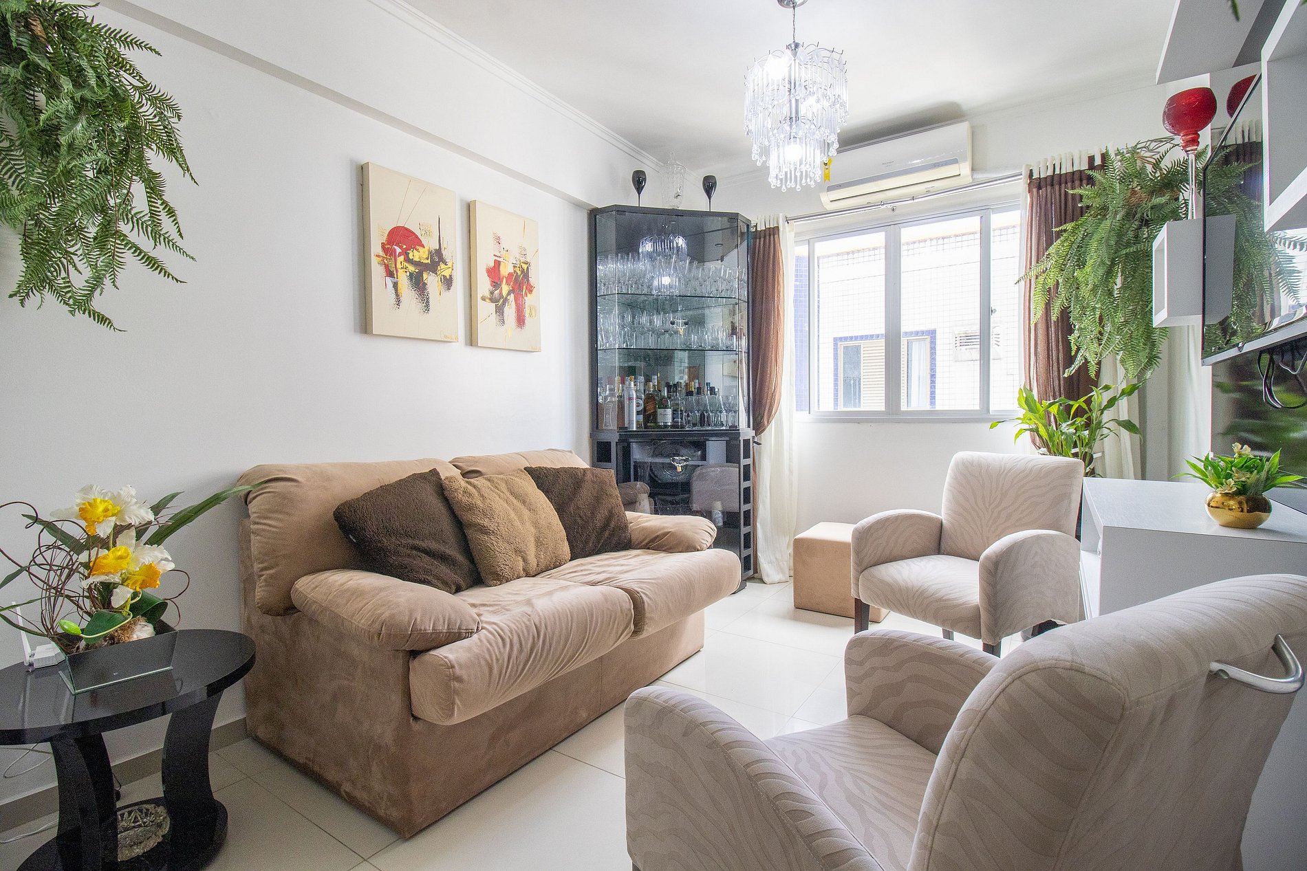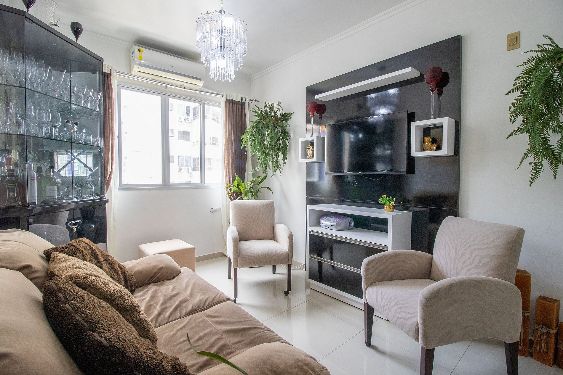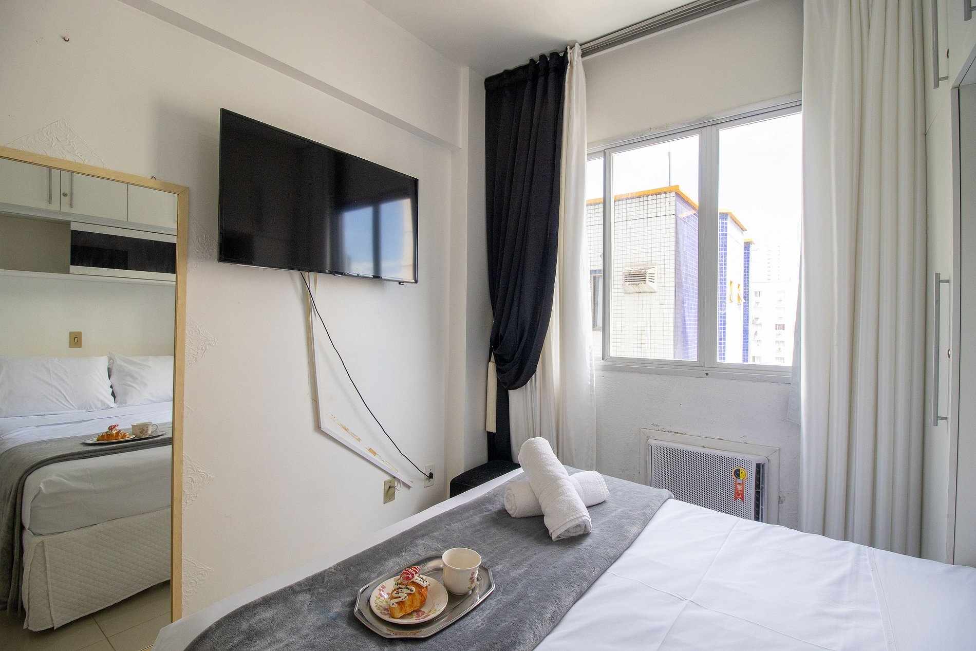 O apartamento conta com um ar condicionado split na sala, oferecendo as funções quente e frio, e um ar condicionado de gaveta no quarto, que possui apenas a função frio, garantindo conforto térmico conforme a sua necessidade.