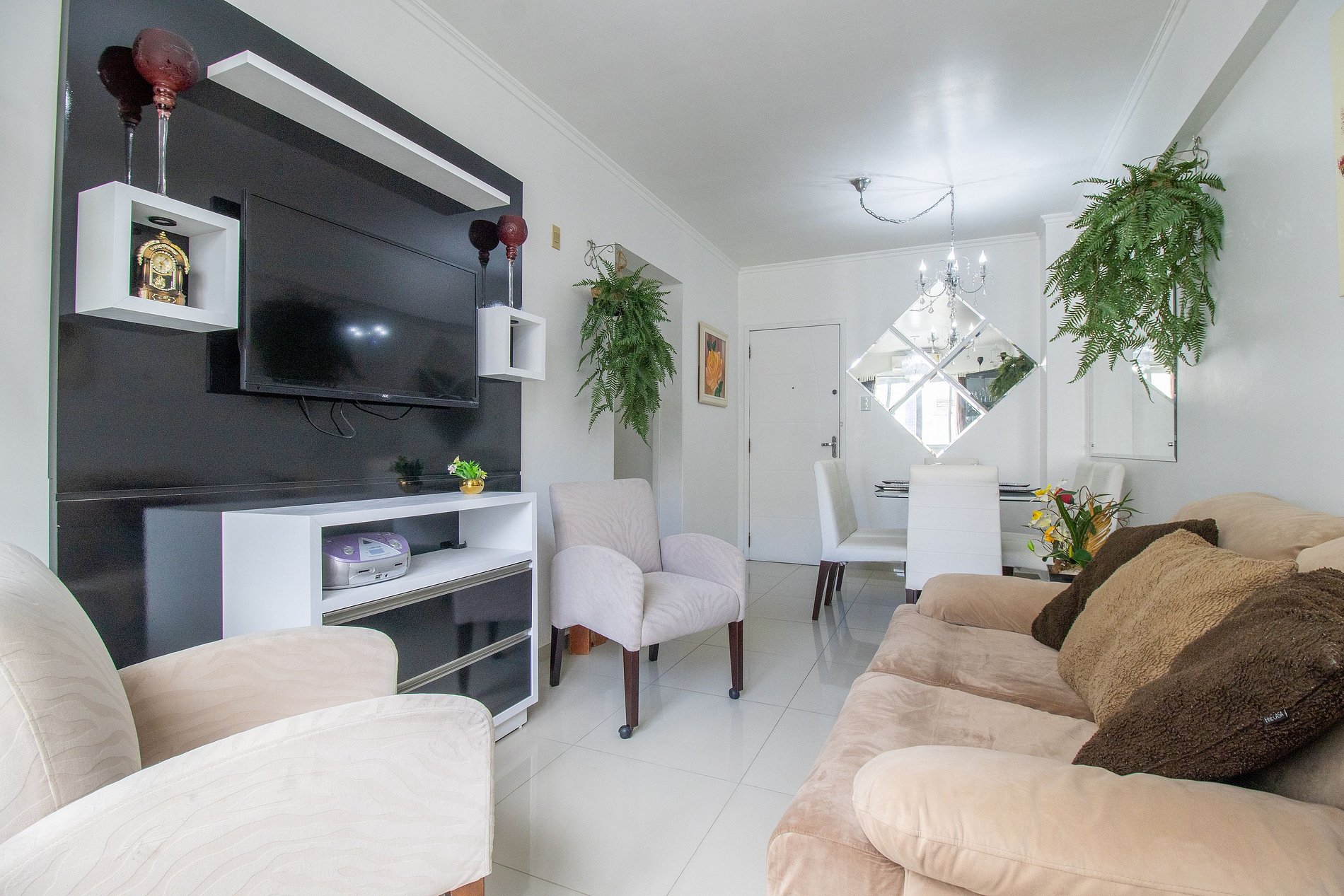 Esse apartamento é super prático e confortável! Possui um quarto com cama de casal e um banheiro social. A sala é bem agradável, com sofá cama e TV, e é conectada com a área de jantar, que tem mesa e cadeiras. A cozinha tem tudo o que você precisa, com fogão, geladeira, forno, microondas, além de liquidificador, sanduicheira e cafeteira elétrica. E ainda conta com máquina de lavar, secador de cabelo e ferro de passar, pra facilitar a sua vida.