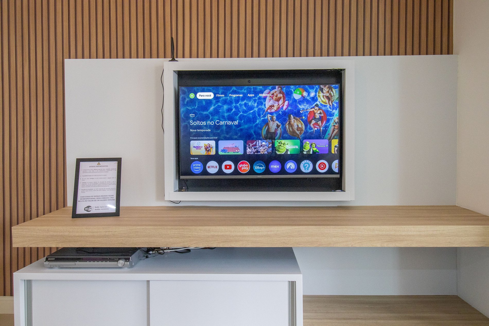 Conectividade garantida com internet Wi-Fi própria do apartamento, com TV Smart na sala. A TV não possui acesso aos canais abertos.