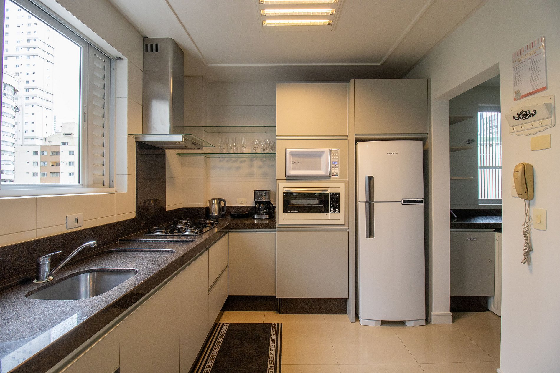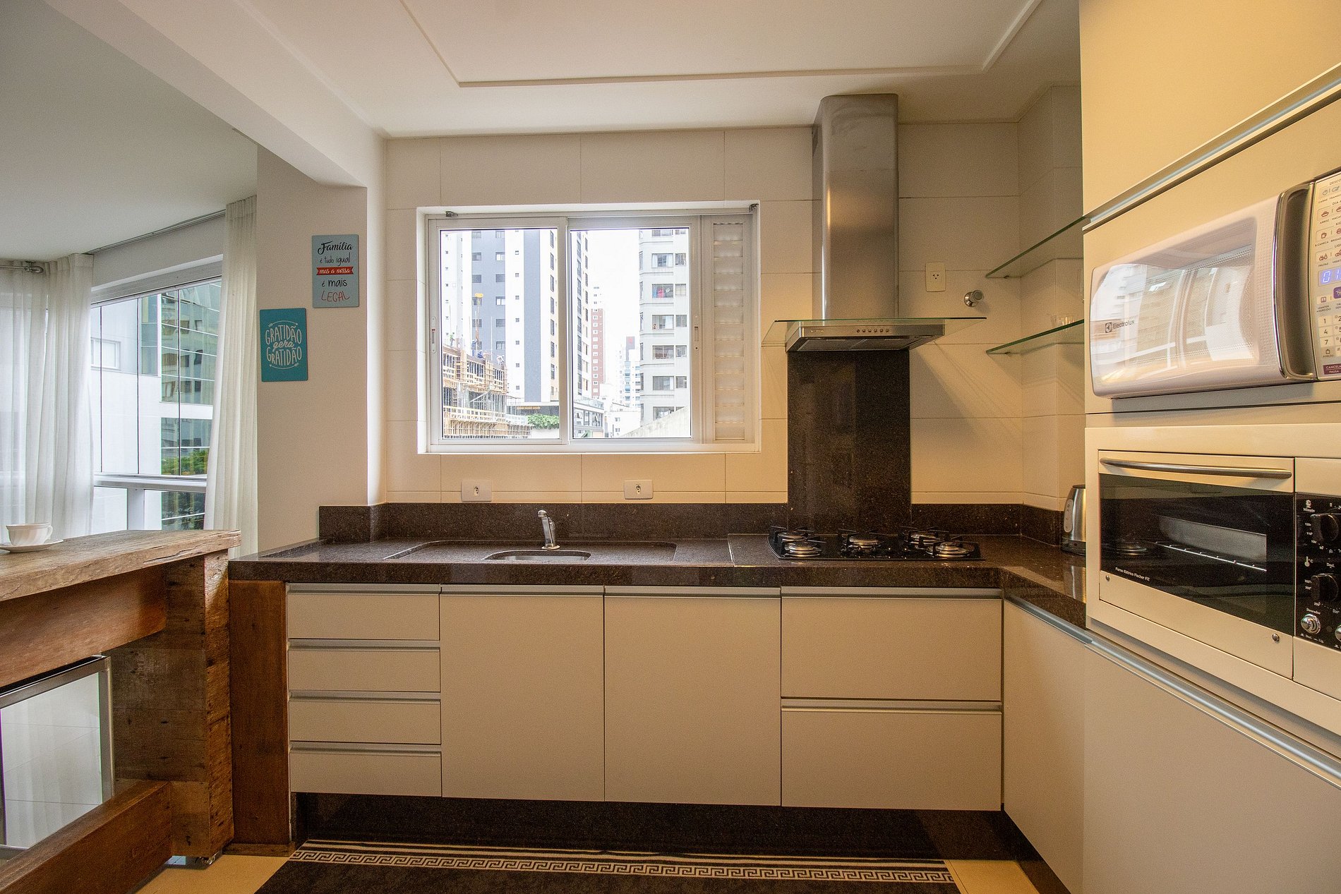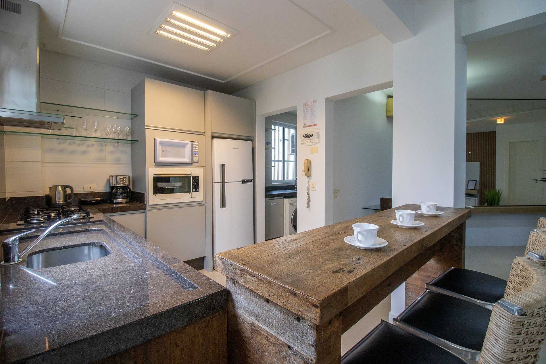 A cozinha completa com balcão americano tem tudo o que você precisa: geladeira, fogão, forno elétrico, microondas, liquidificador, sanduicheira e cafeteira. E para sua conveniência, o apartamento ainda conta com máquina lava e seca, ferro de passar e secador de cabelo. Este apartamento é o lugar ideal para aproveitar sua viagem com conforto e praticidade.