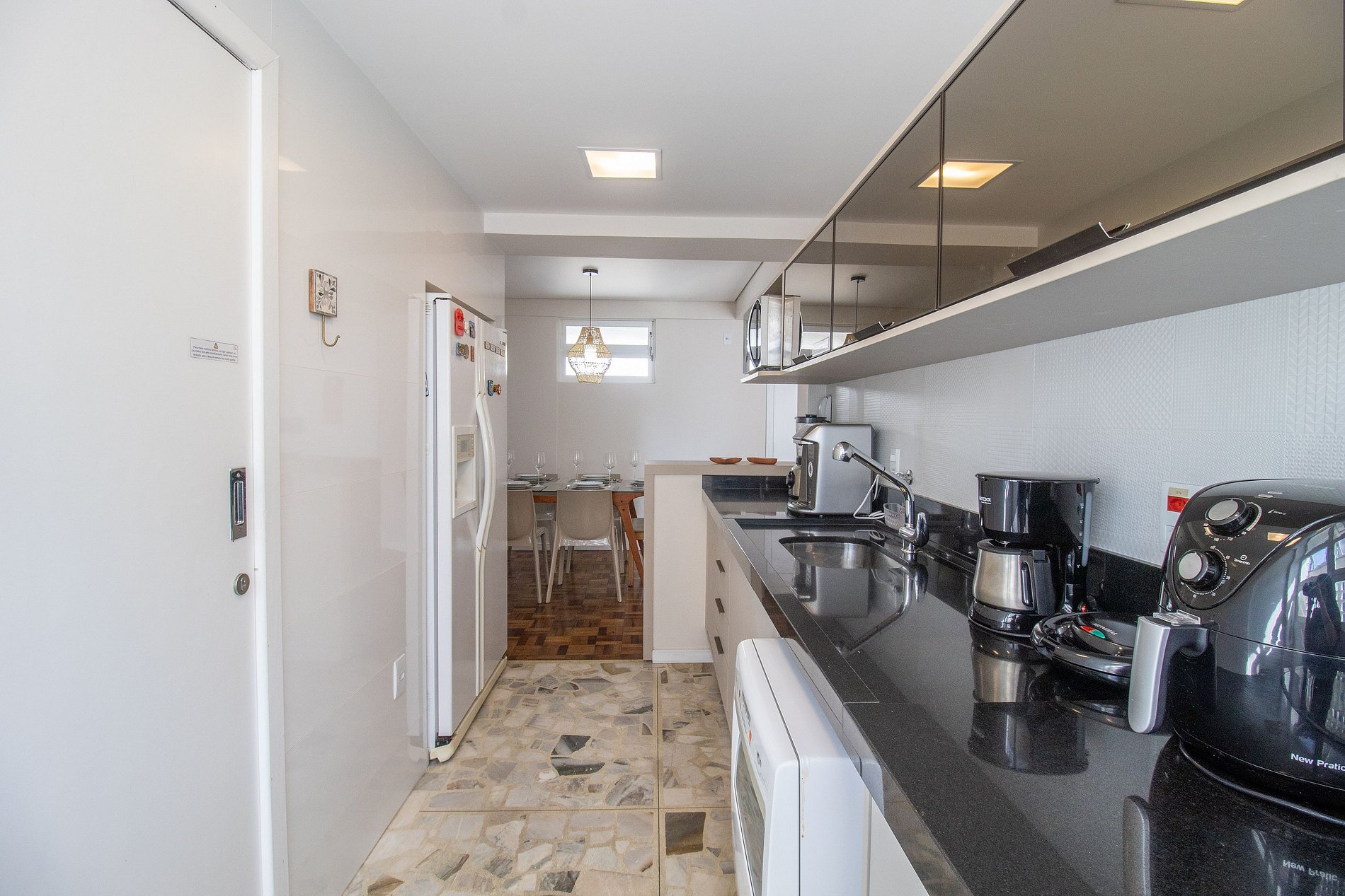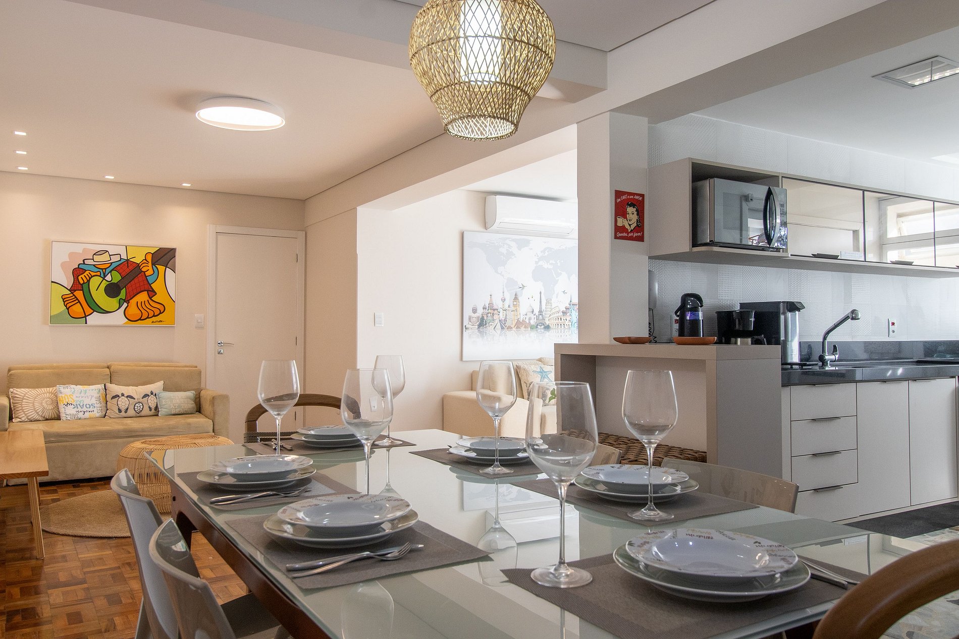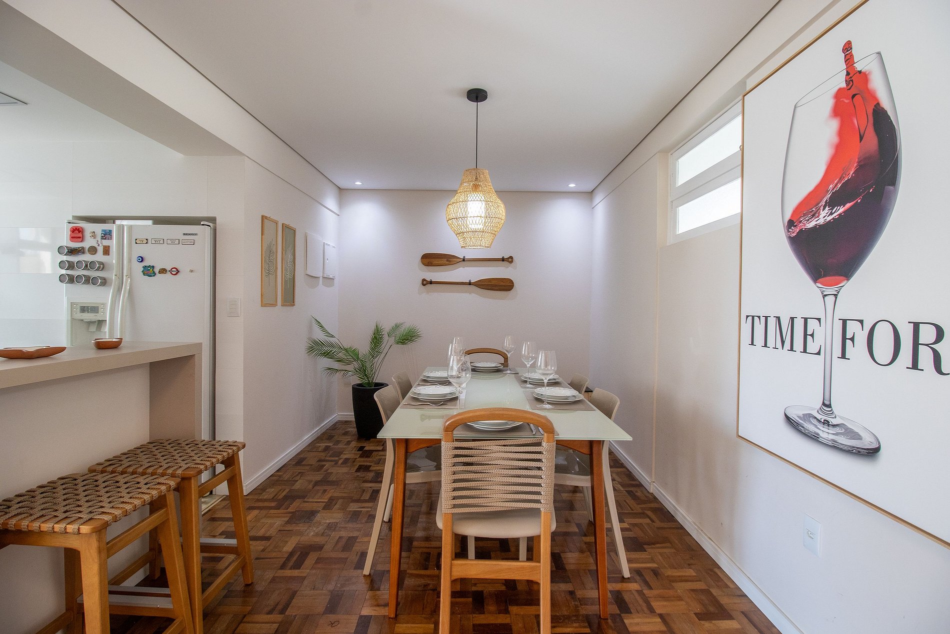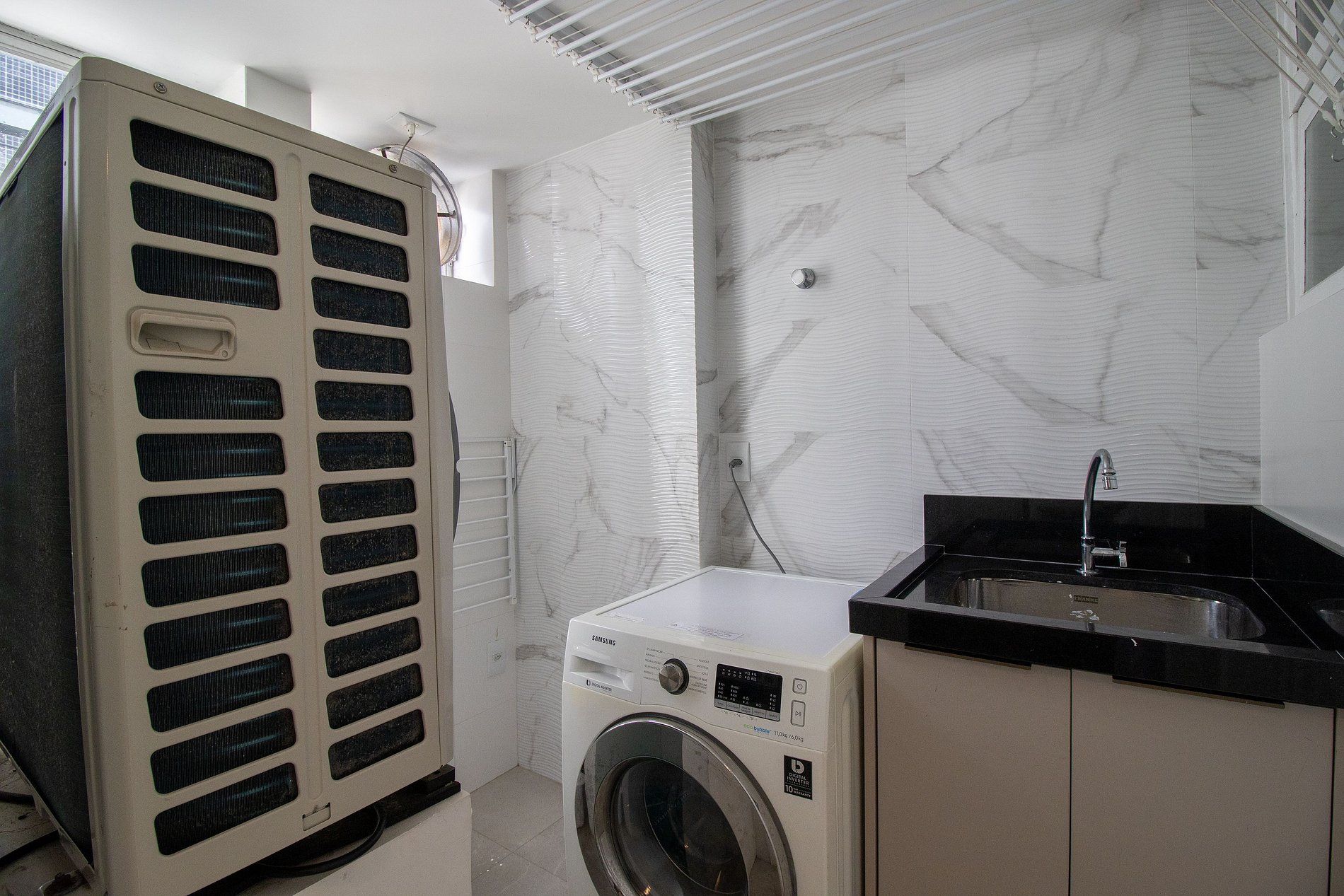 A sala de estar, com dois ambientes, tem dois sofás super confortáveis, TV Smart e uma varanda com rede de proteção, onde você pode relaxar enquanto curte uma linda vista da cidade. A cozinha, integrada à sala de jantar, é totalmente equipada com geladeira, fogão de indução, forno, microondas, liquidificador, cafeteira elétrica, airfryer, sanduicheira e todos os utensílios básicos para preparar suas refeições com facilidade. Para tornar sua estadia ainda mais prática, a área de serviço conta com máquina lava e seca, ferro de passar e secador de cabelo. Um espaço completo para você curtir Balneário Camboriú da melhor forma!