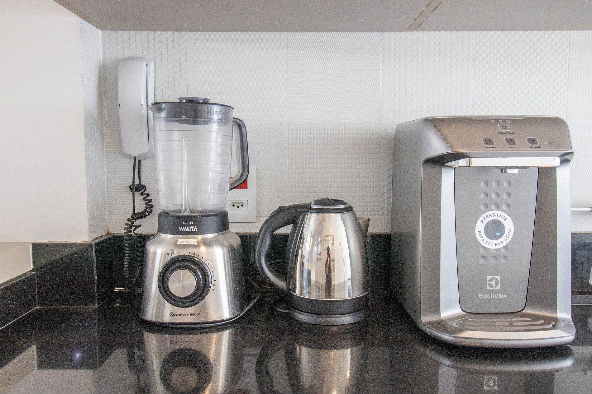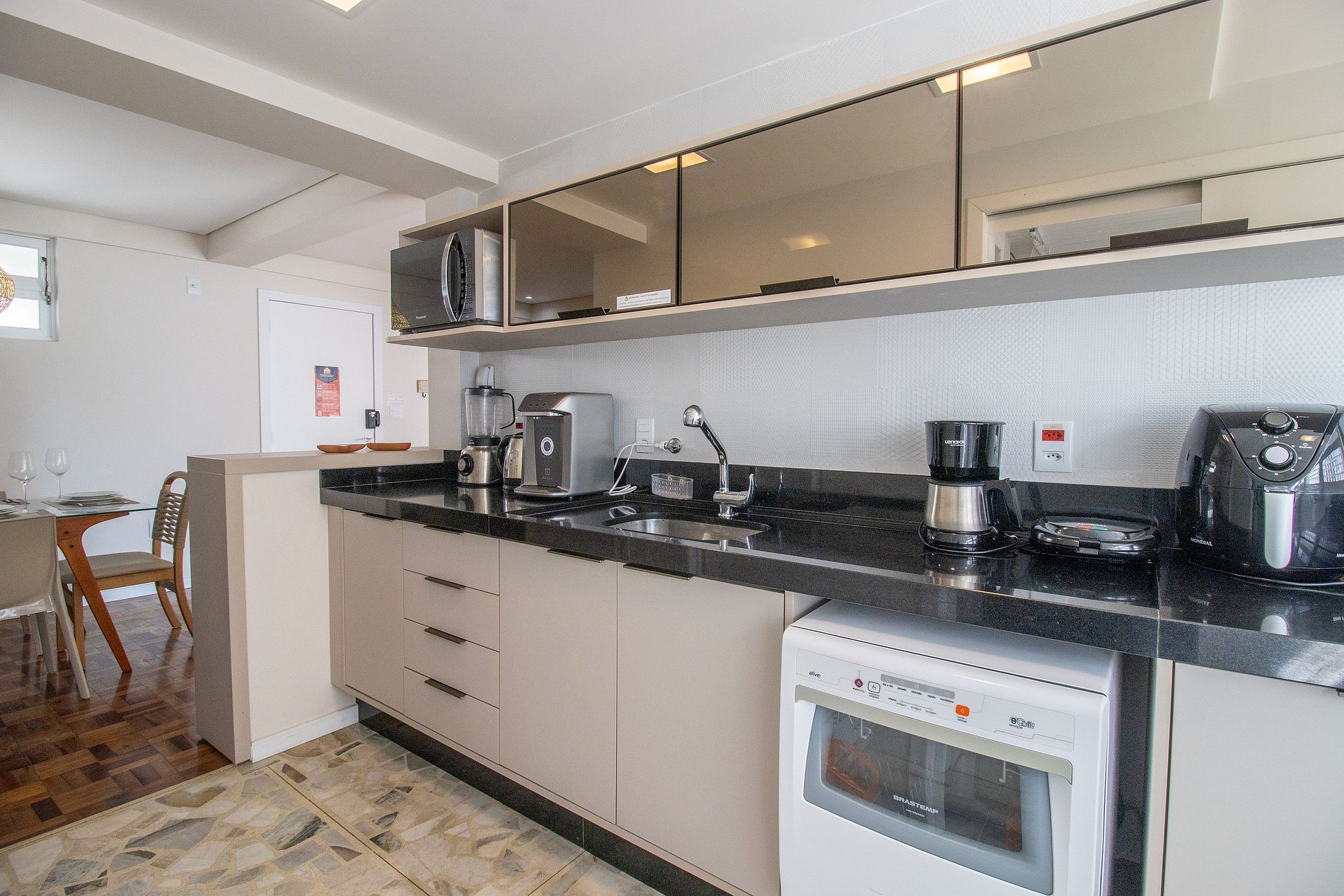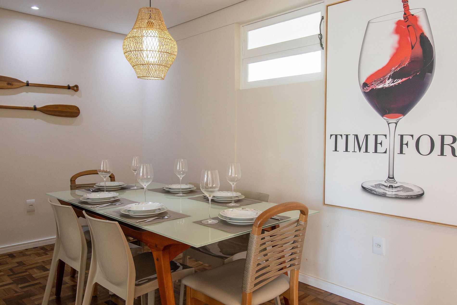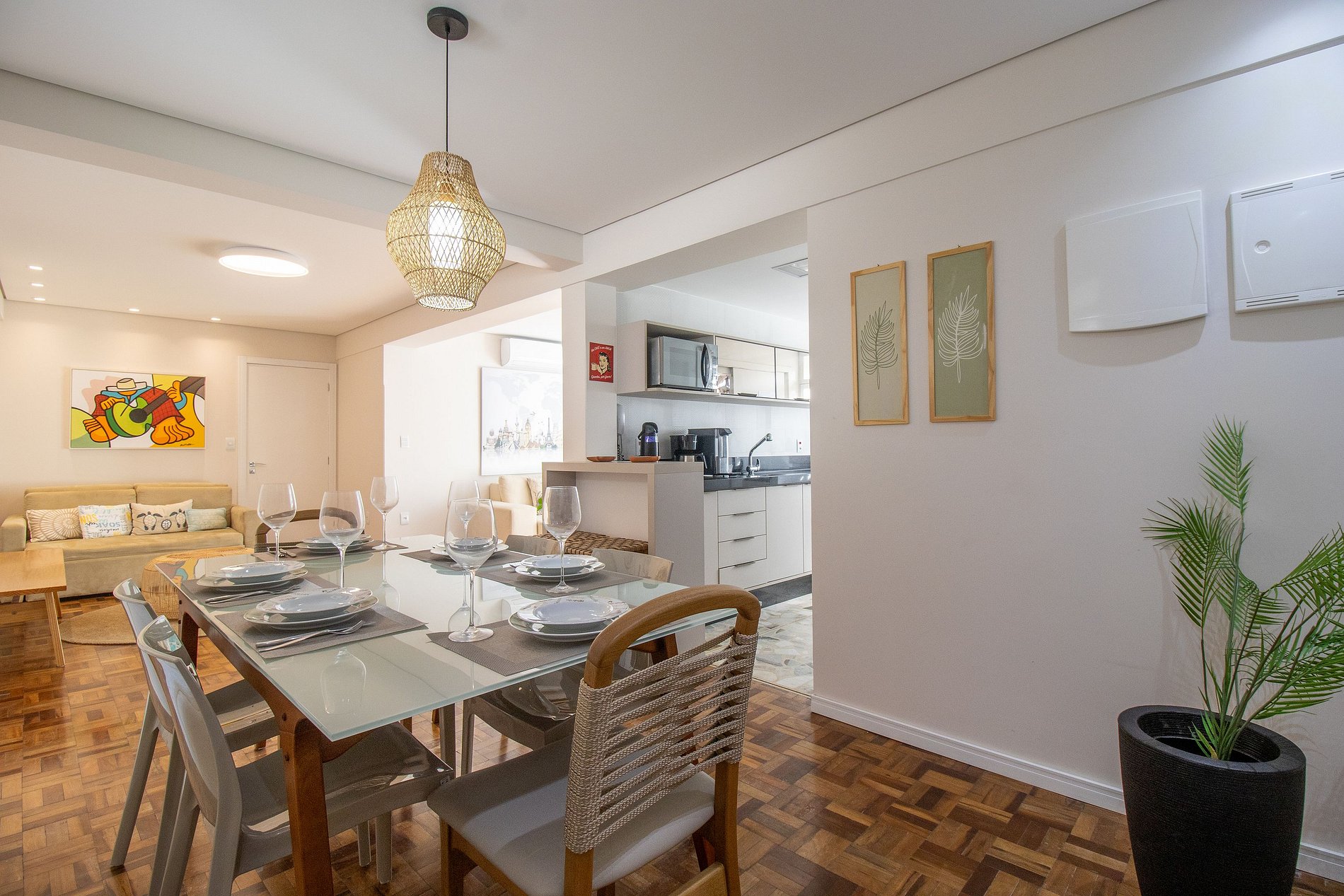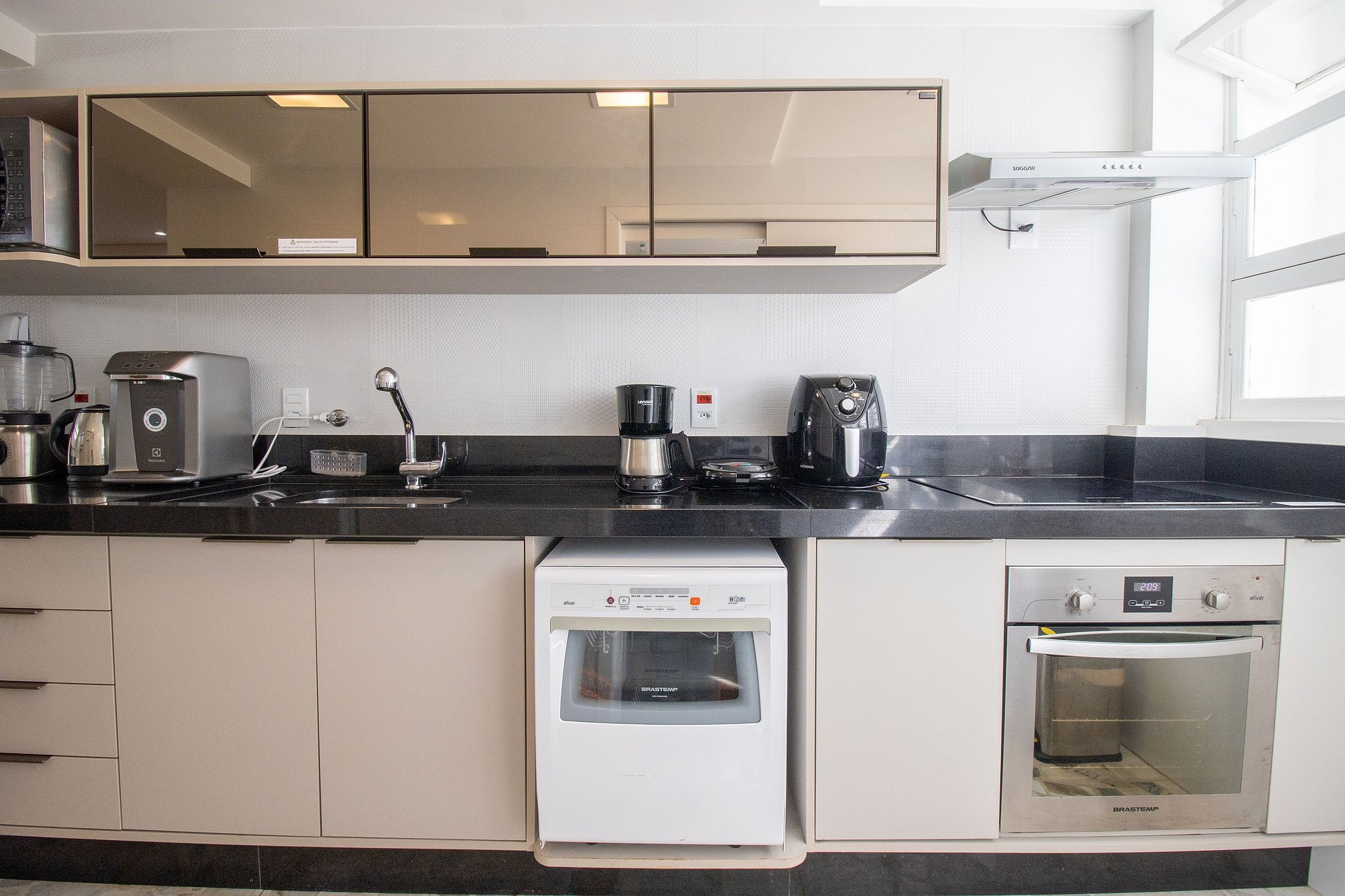 A sala de estar, com dois ambientes, tem dois sofás super confortáveis, TV Smart e uma varanda com rede de proteção, onde você pode relaxar enquanto curte uma linda vista da cidade. A cozinha, integrada à sala de jantar, é totalmente equipada com geladeira, fogão de indução, forno, microondas, liquidificador, cafeteira elétrica, airfryer, sanduicheira e todos os utensílios básicos para preparar suas refeições com facilidade. Para tornar sua estadia ainda mais prática, a área de serviço conta com máquina lava e seca, ferro de passar e secador de cabelo. Um espaço completo para você curtir Balneário Camboriú da melhor forma!