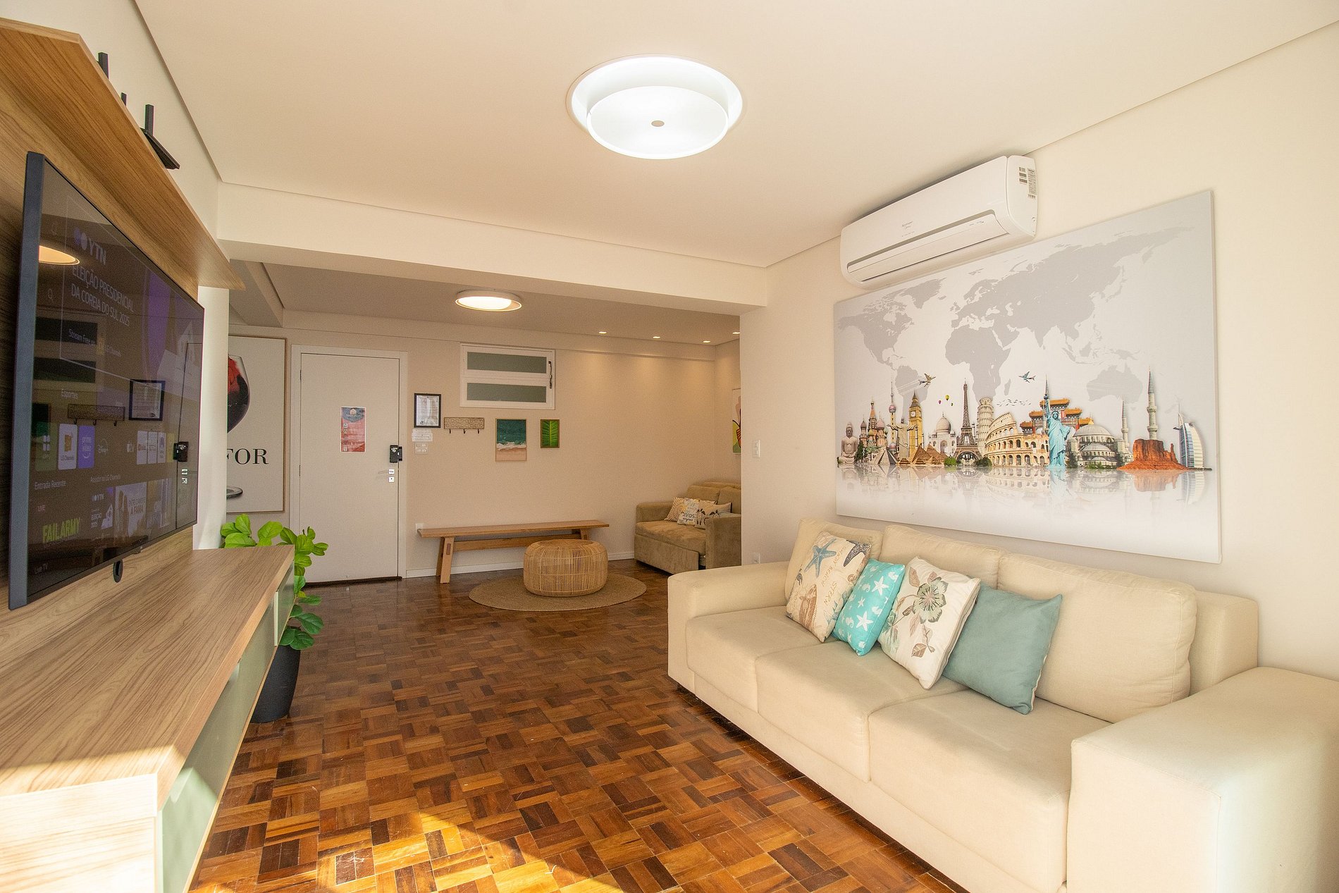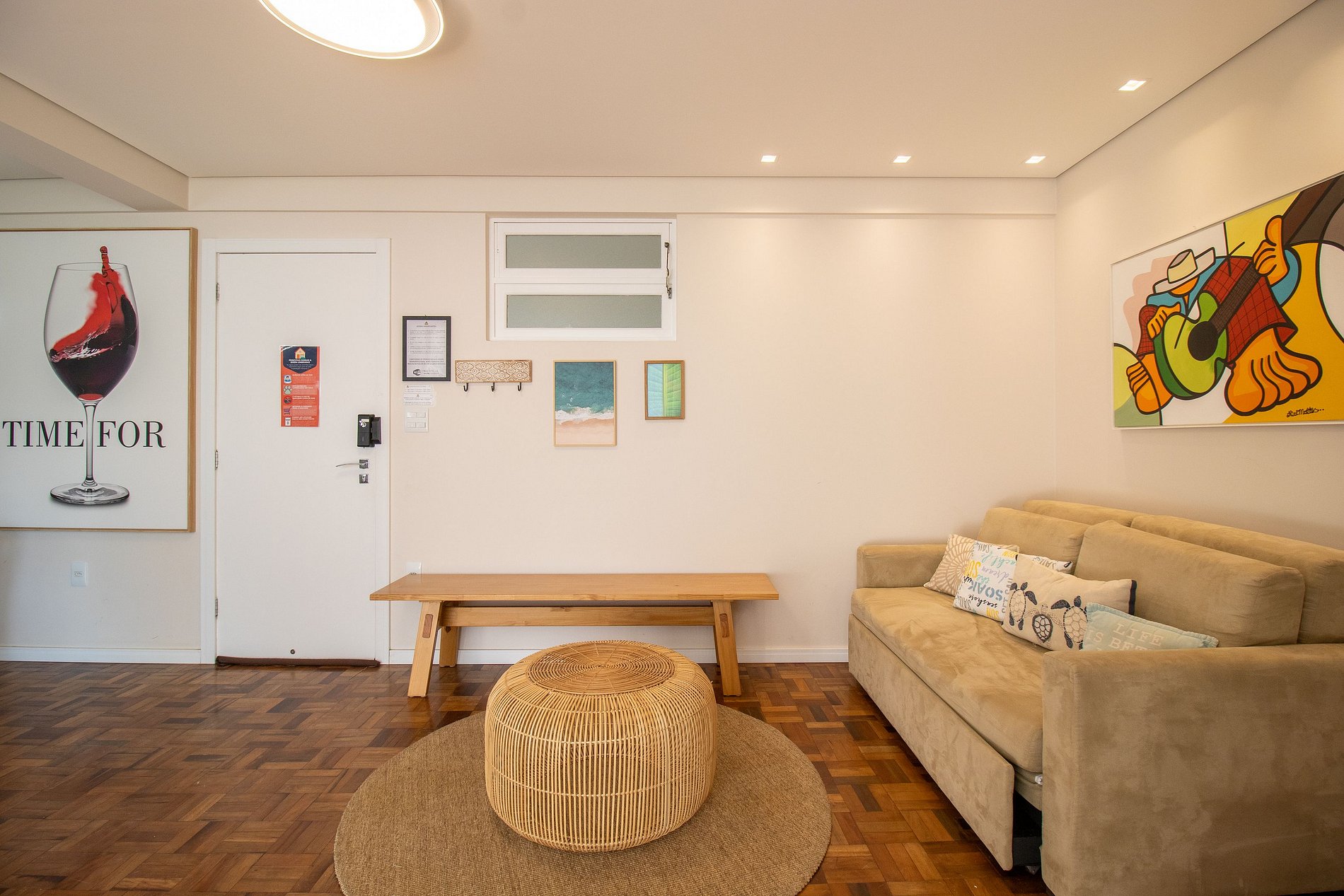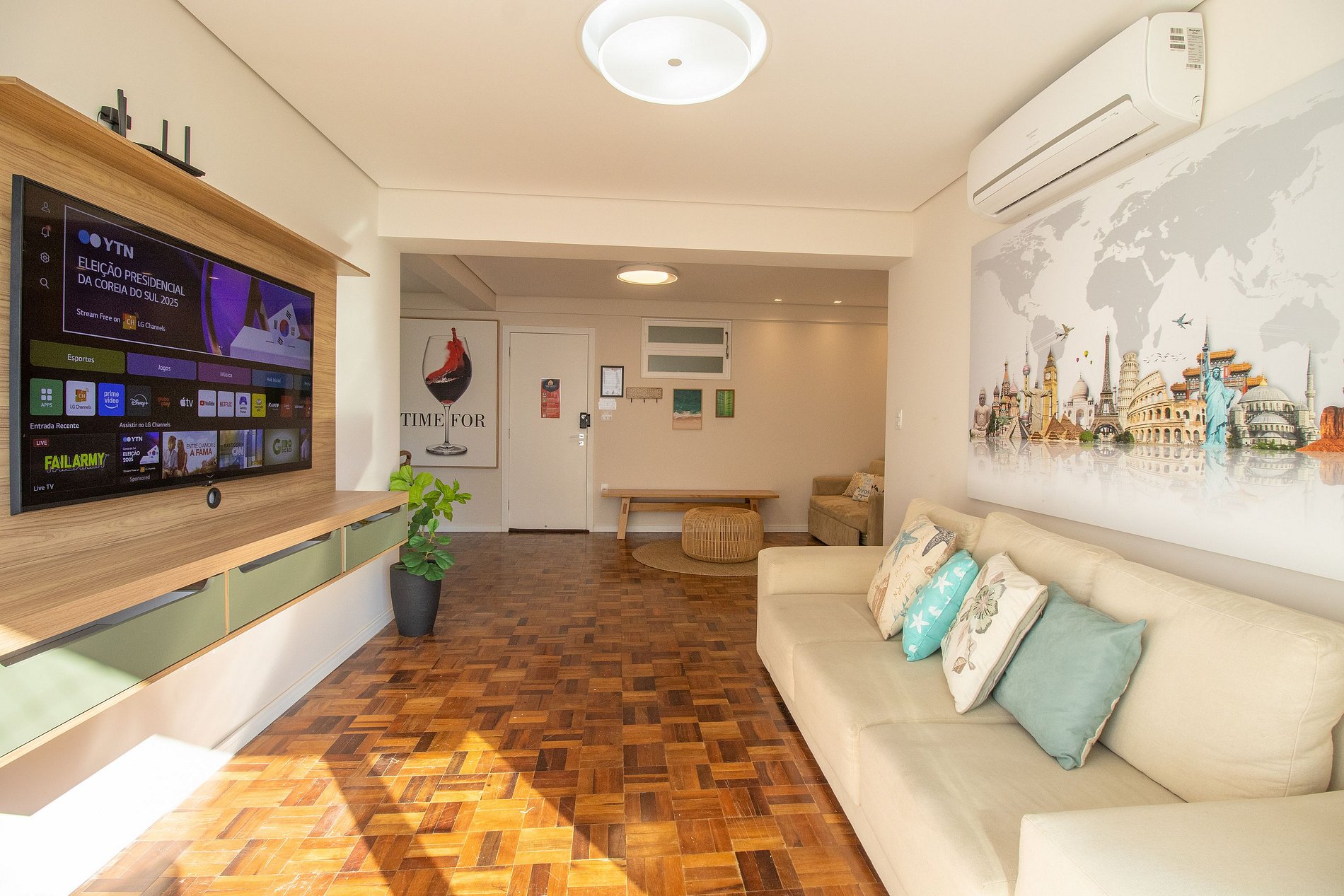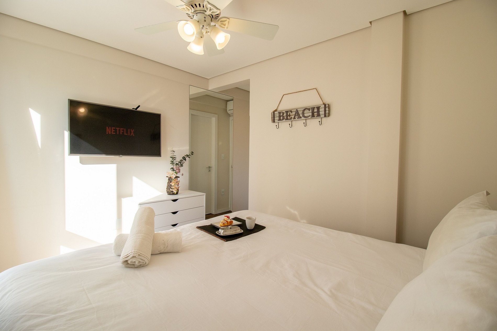 O apartamento conta com três dormitórios climatizados, sendo uma suíte, garantindo noites bem confortáveis. A suíte possui duas camas de solteiro que ficam uma ao lado da outra para formar uma cama só, o segundo quarto conta com uma cama king, e o terceiro tem uma cama queen. Além disso, há um sofá-cama e um colchão de solteiro avulso, acomodando até oito pessoas com todo o conforto.