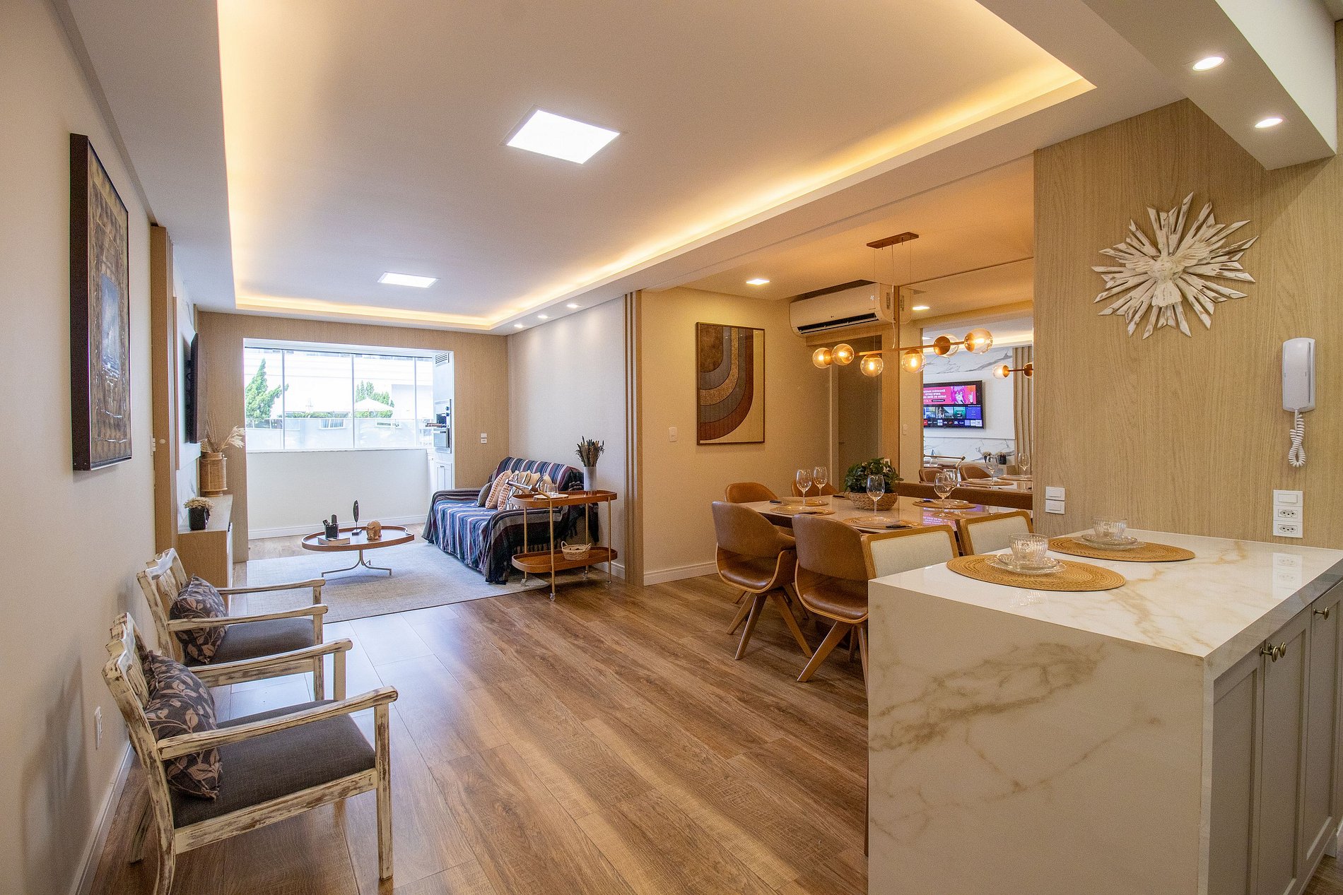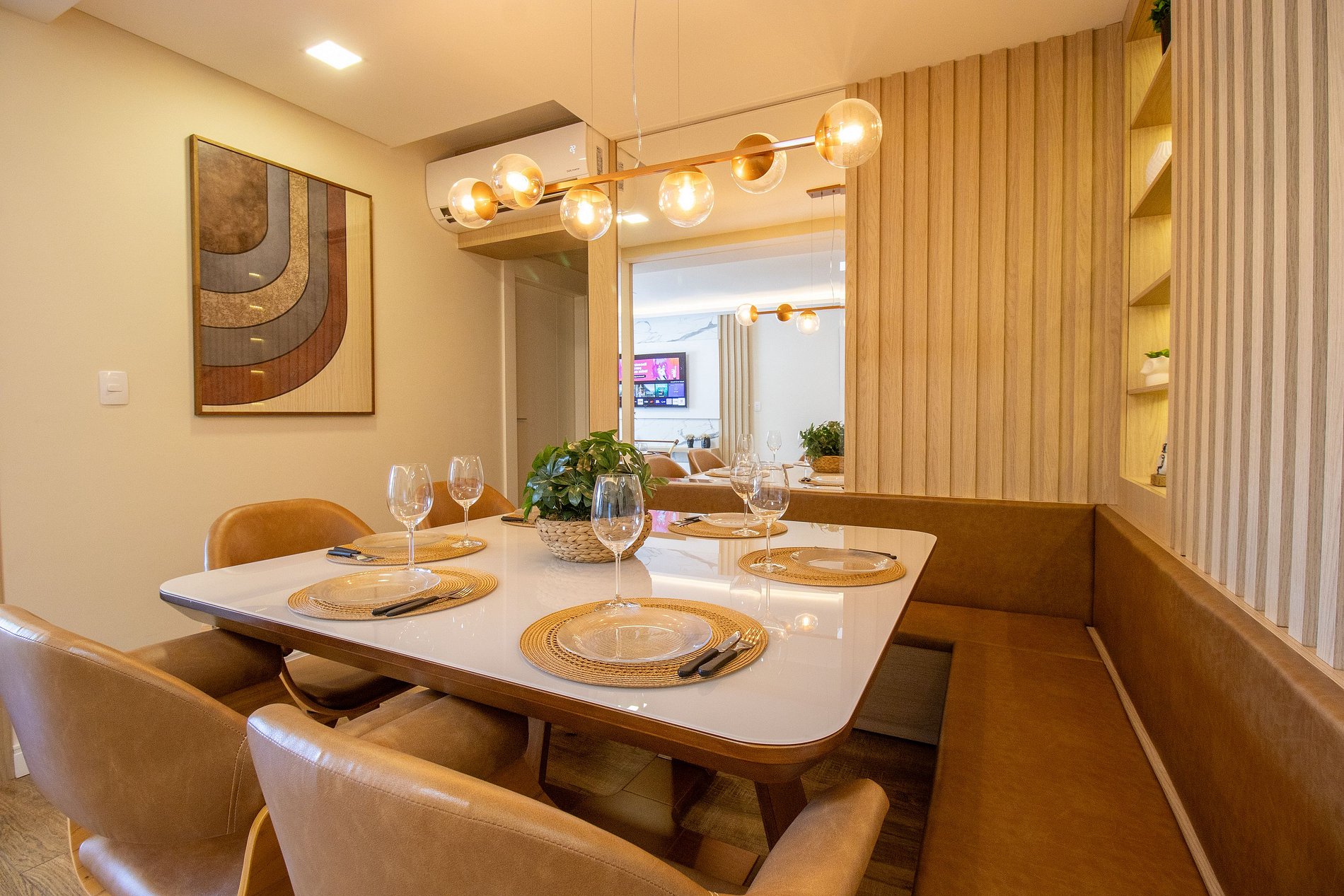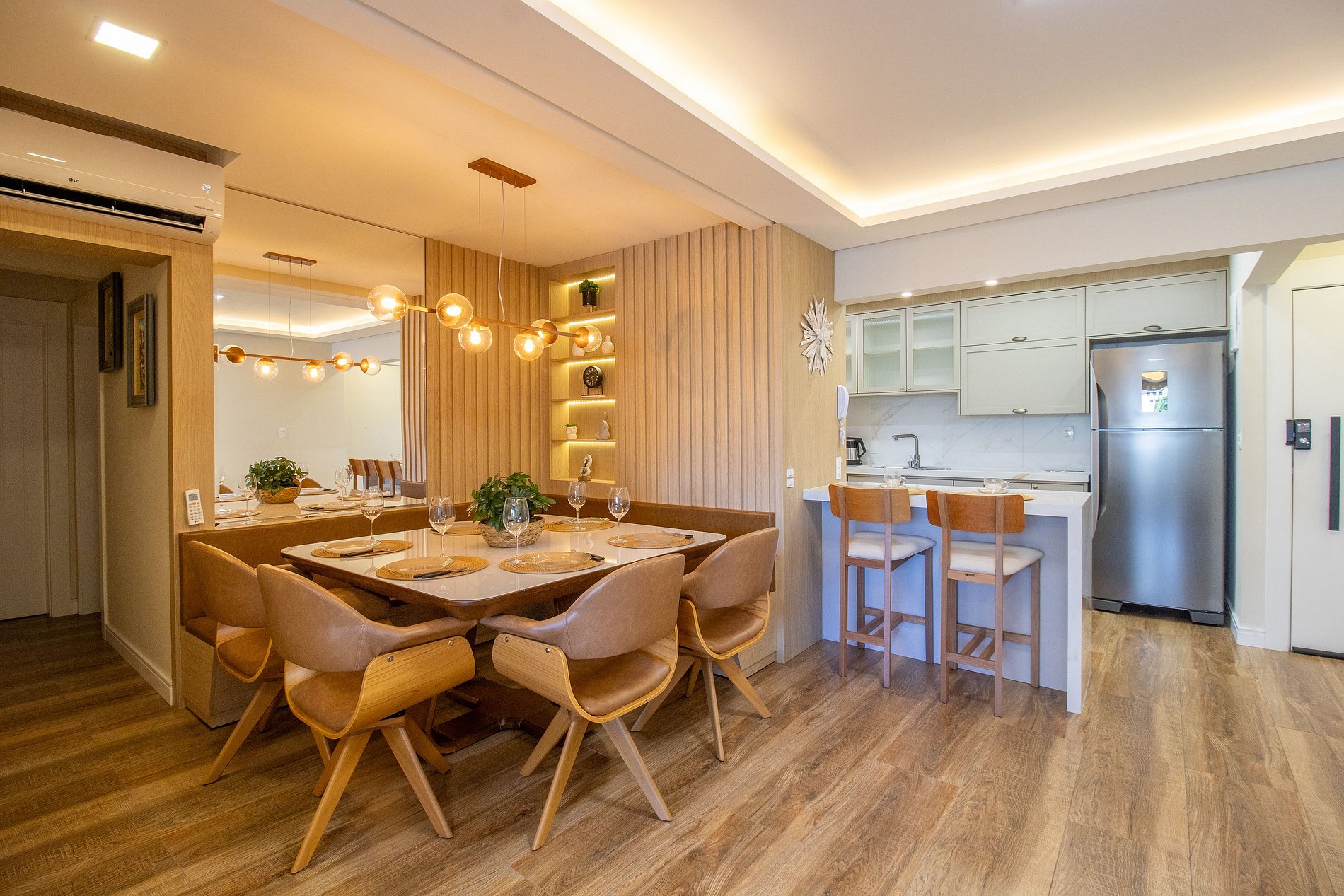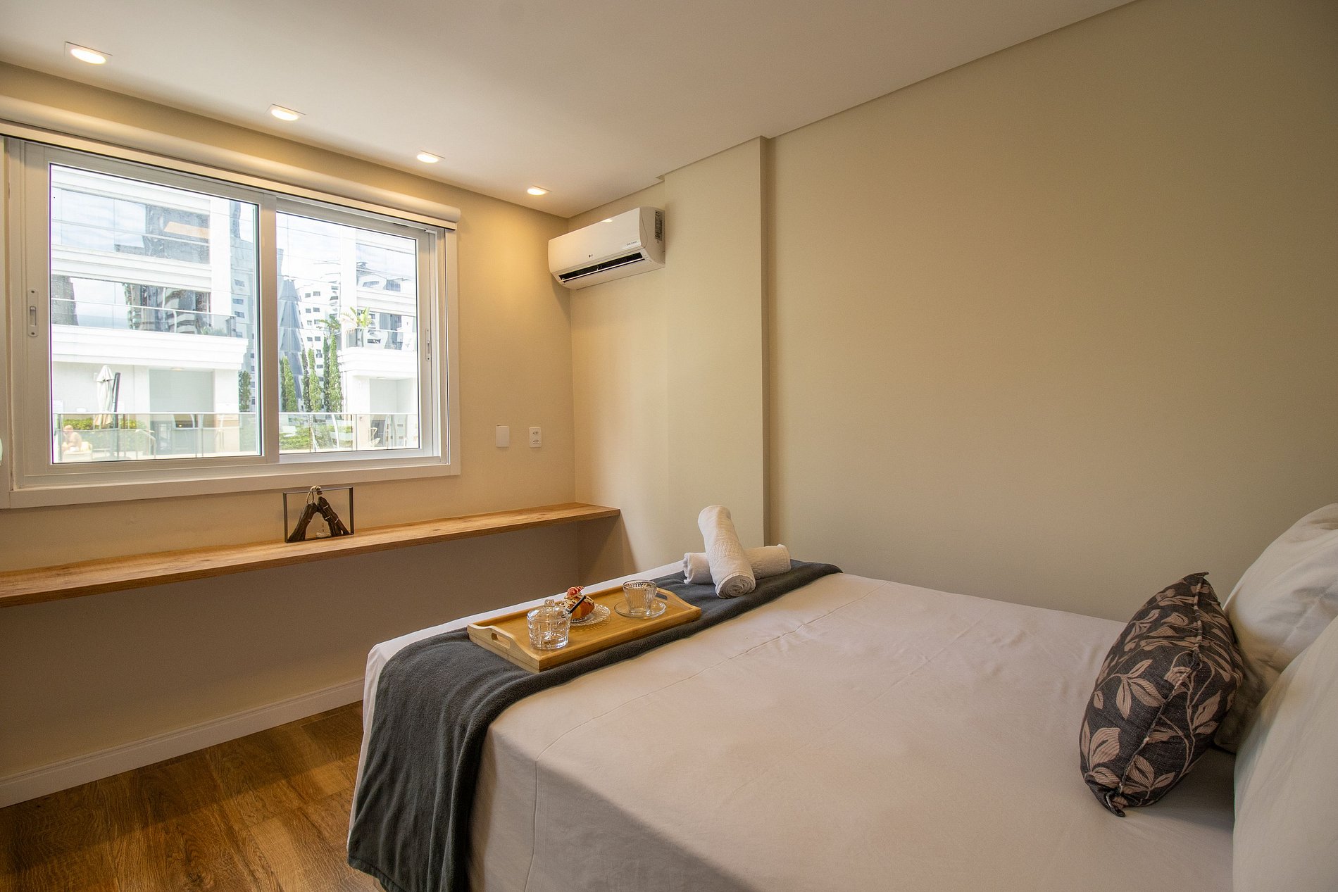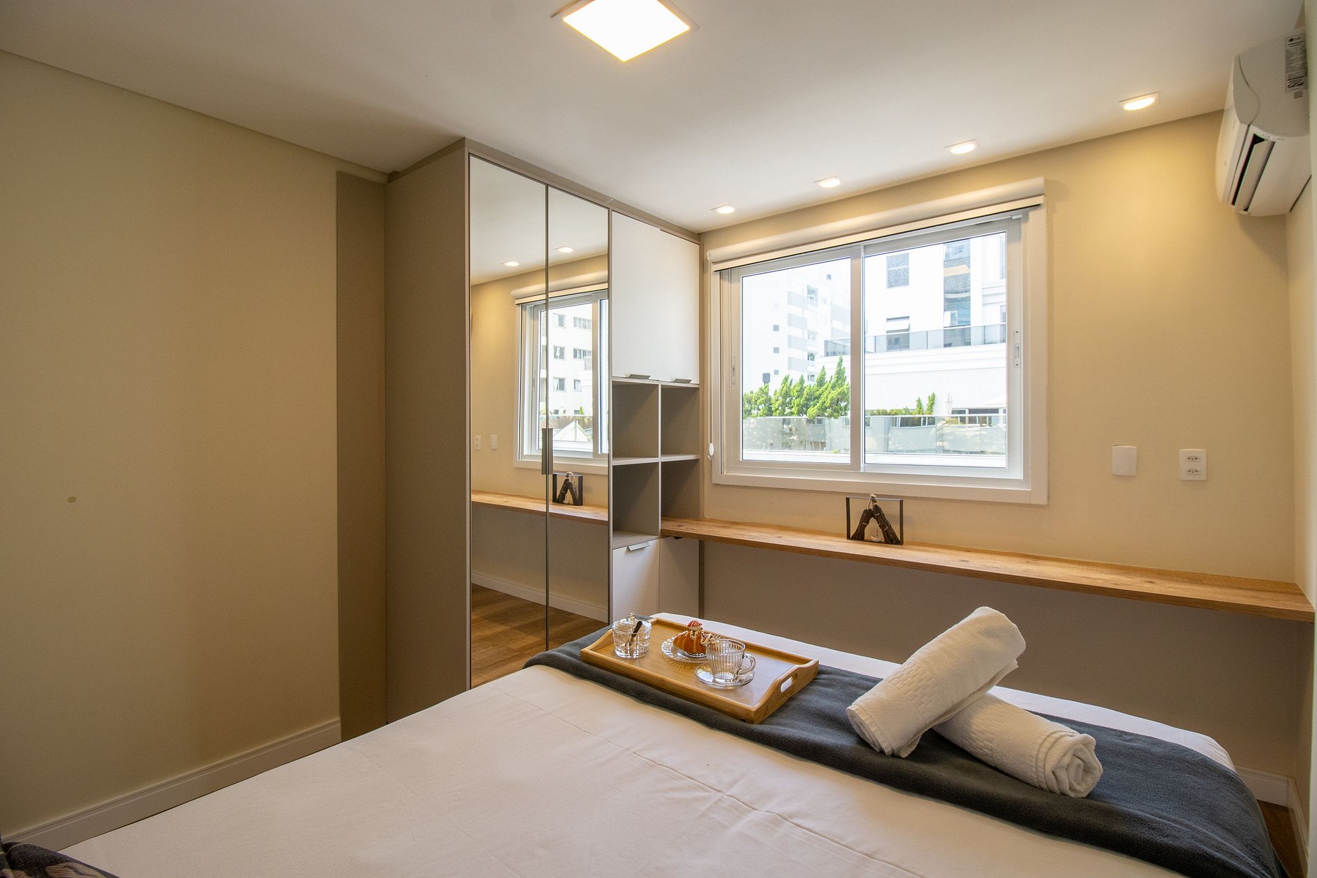 Há quatro ares condicionados split, sendo um na sala e em cada um dos quartos, garantindo um ambiente sempre agradável. Todos os aparelhos funcionam exclusivamente no modo de refrigeração, ideal para os dias quentes.