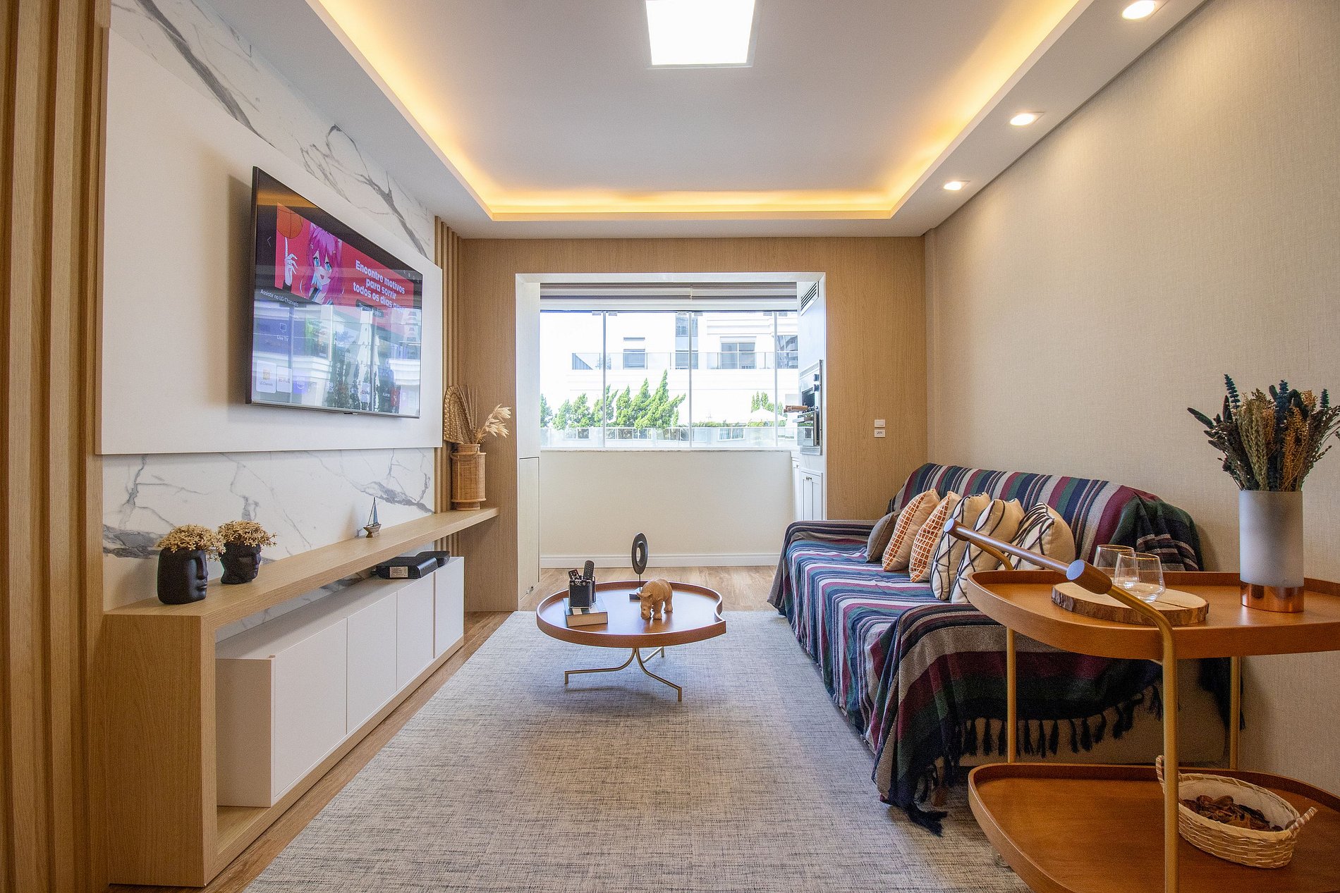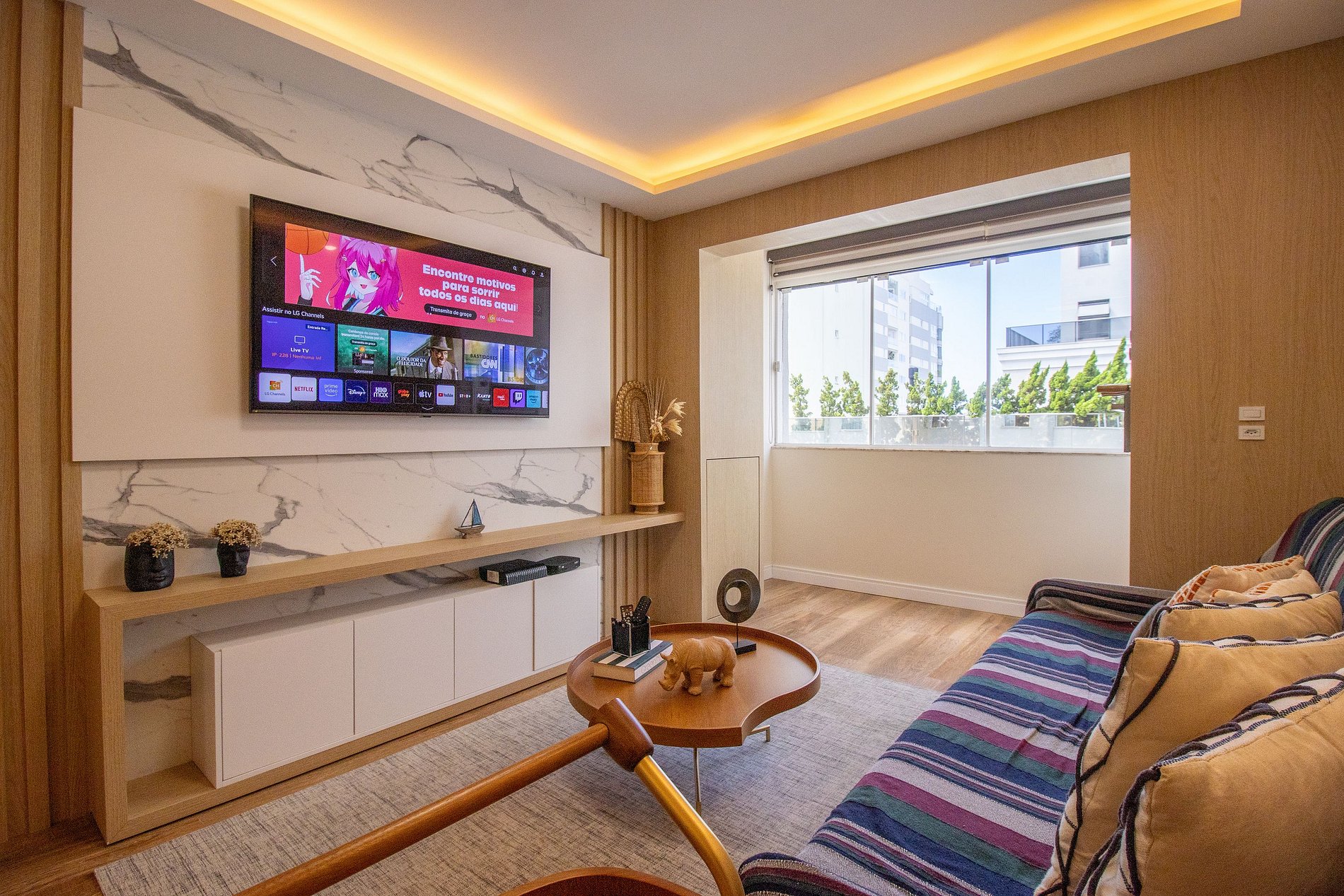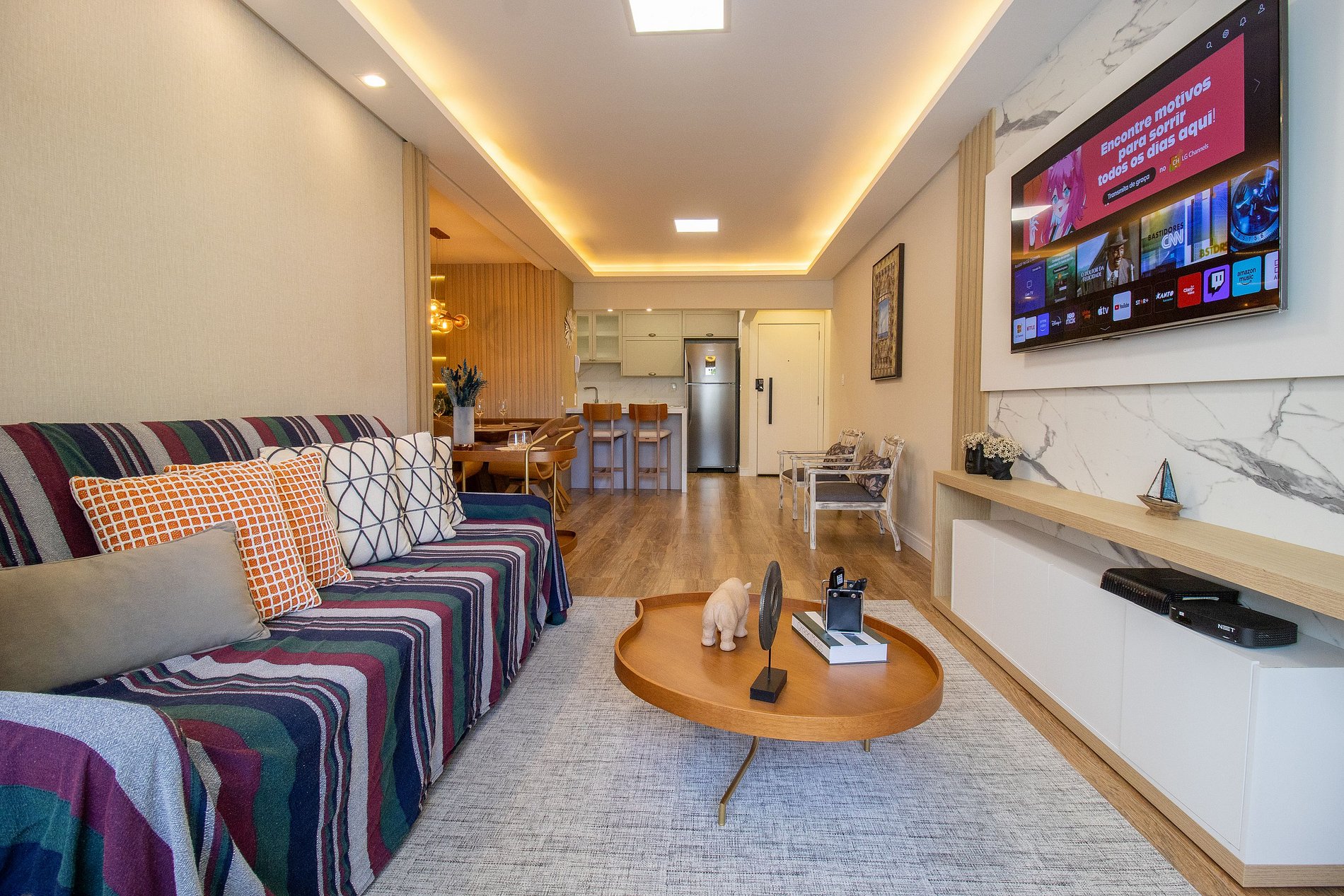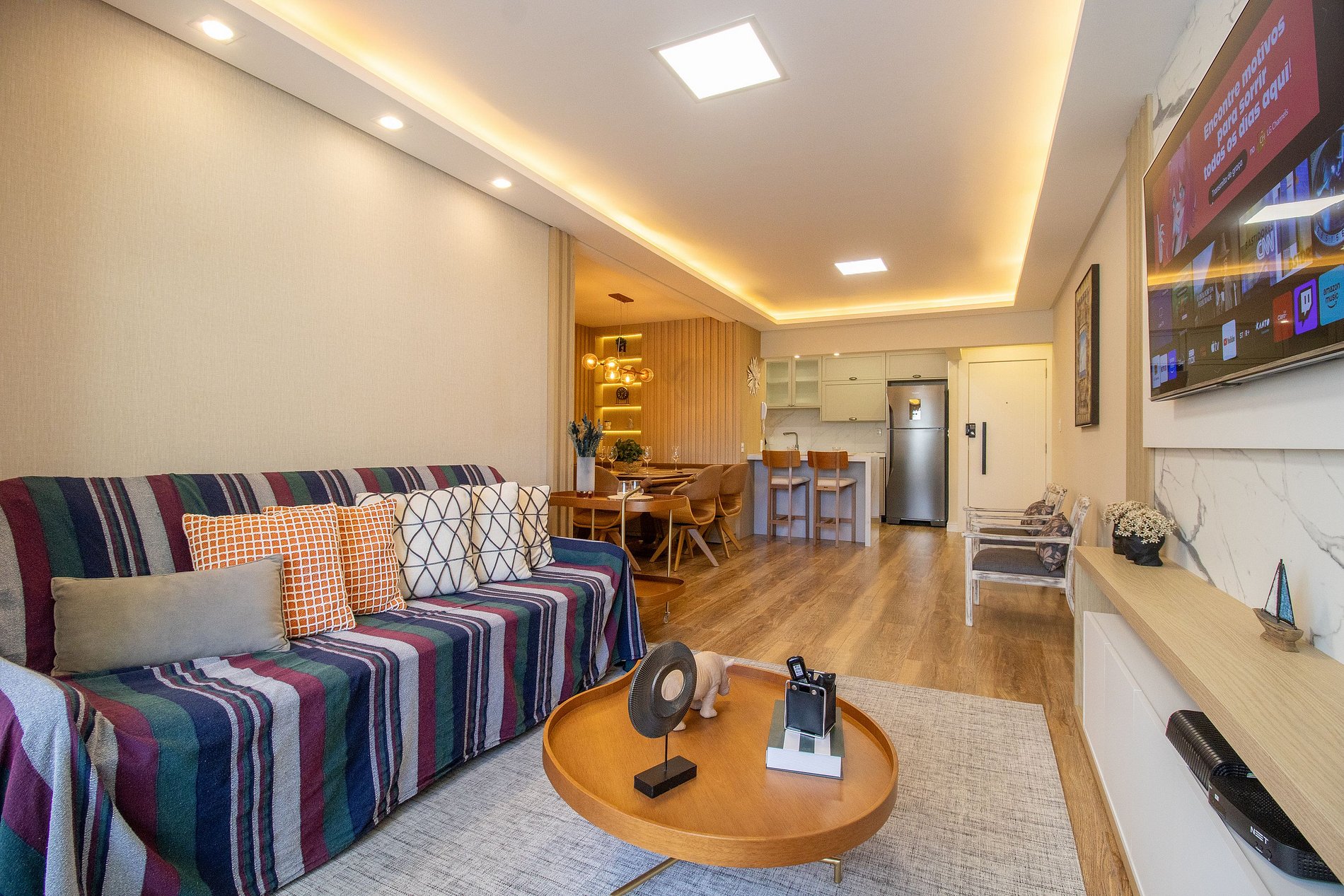 Conta com Internet Wi-Fi própria do apartamento, a TV Smart na sala e na suíte uma TV com acesso aos serviços de streaming.