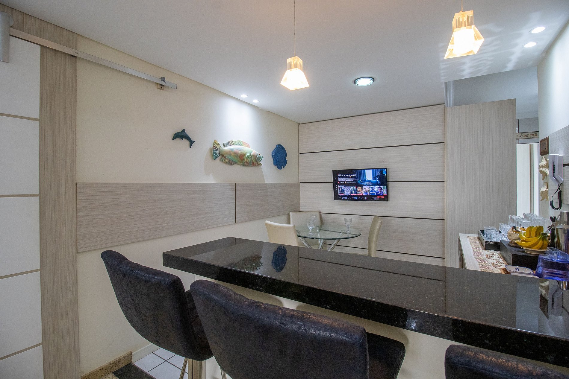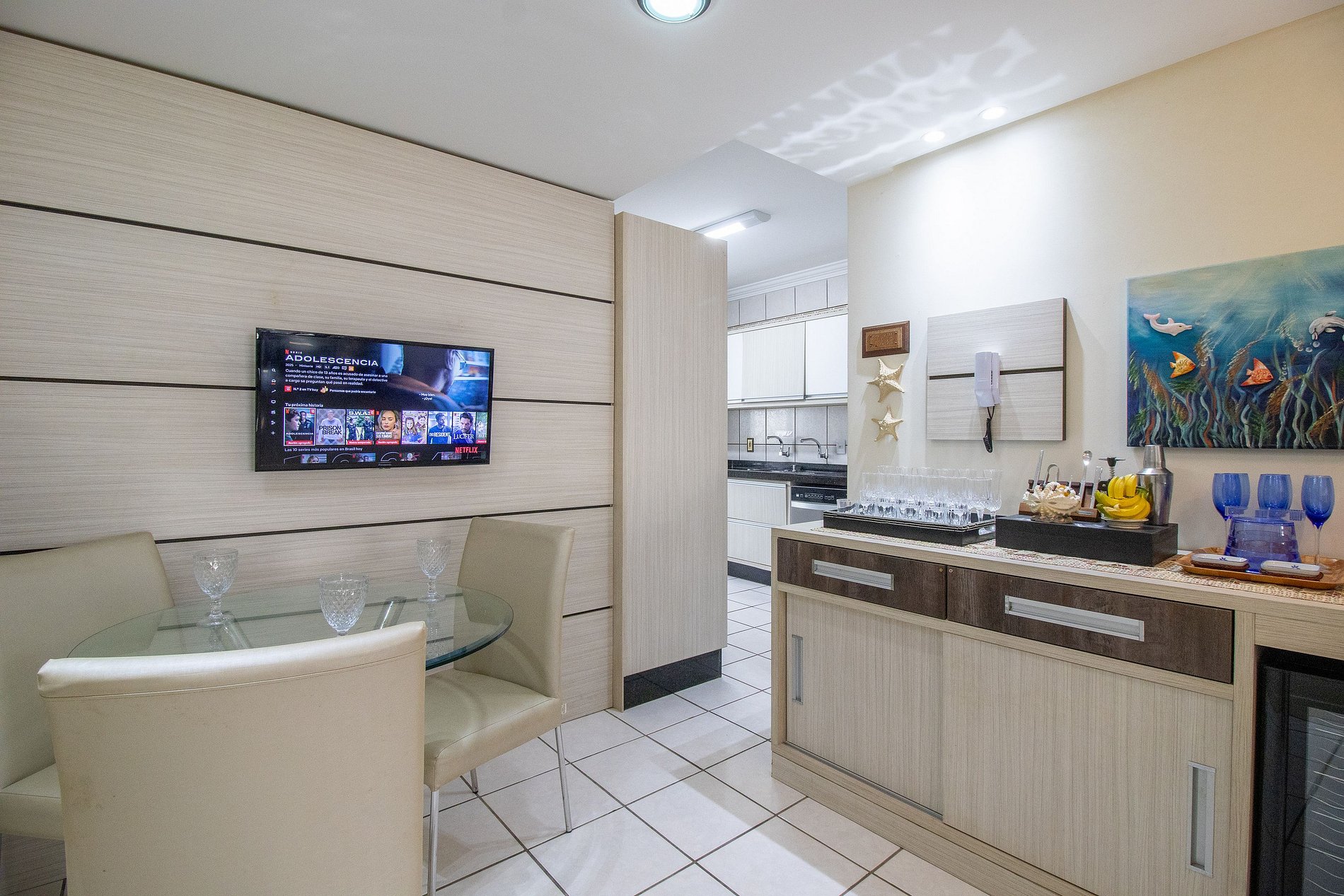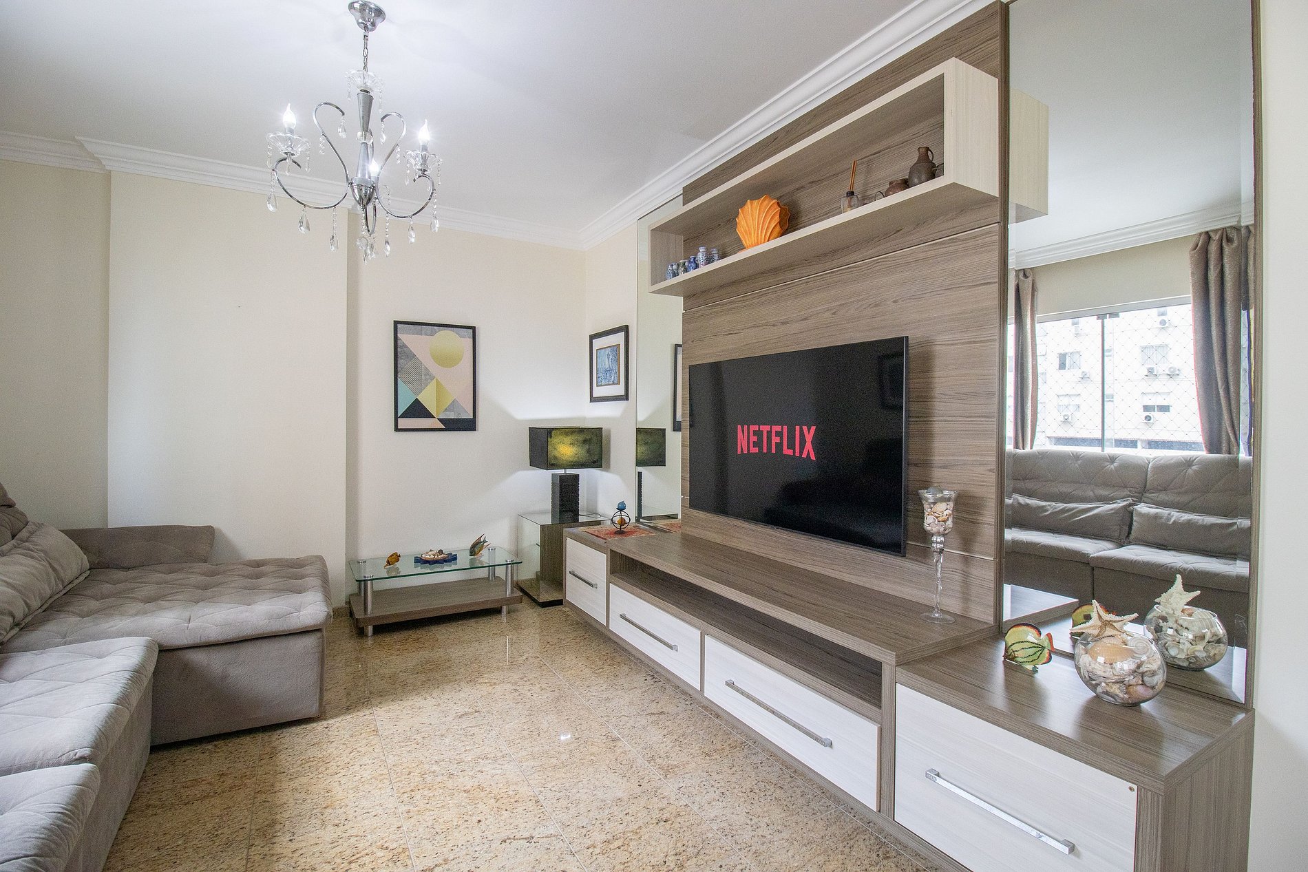 Internet wi-fi de boa qualidade de 300mb e própria do apartamento. Há TV Smart na sala e na área do bar. Conta com TV na suíte, em um dos dormitórios e na cozinha, essas possuem apenas acesso aos canais abertos.