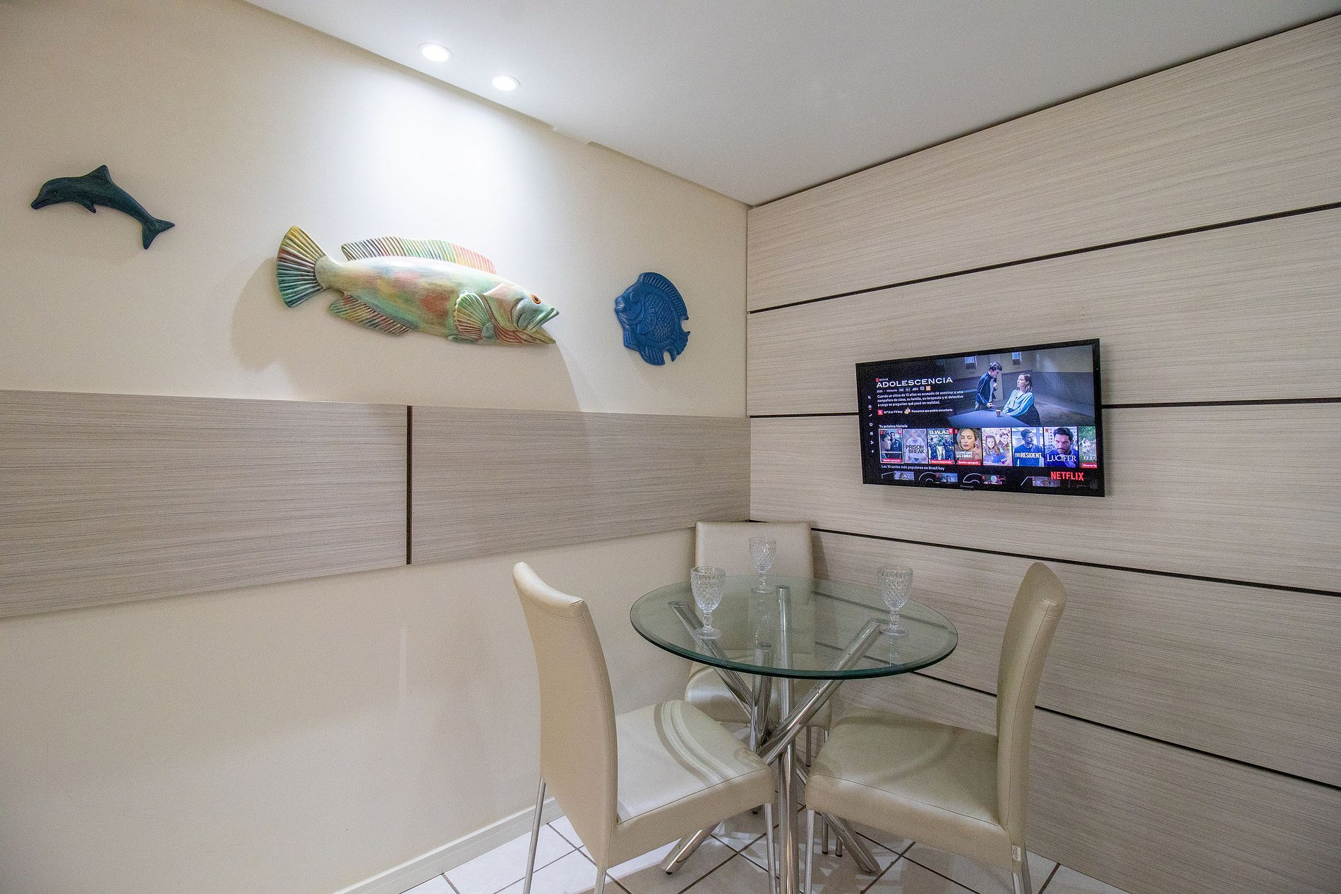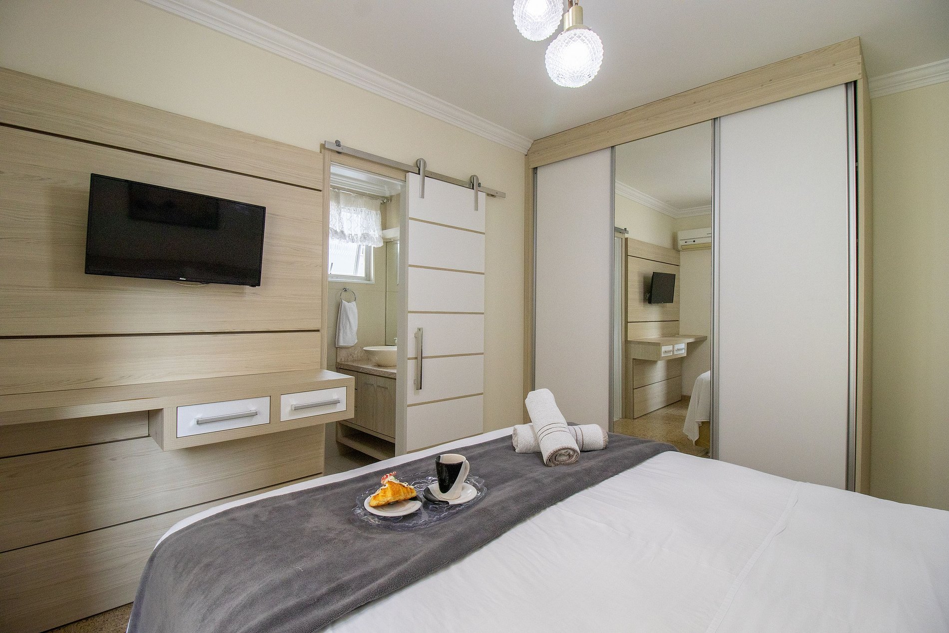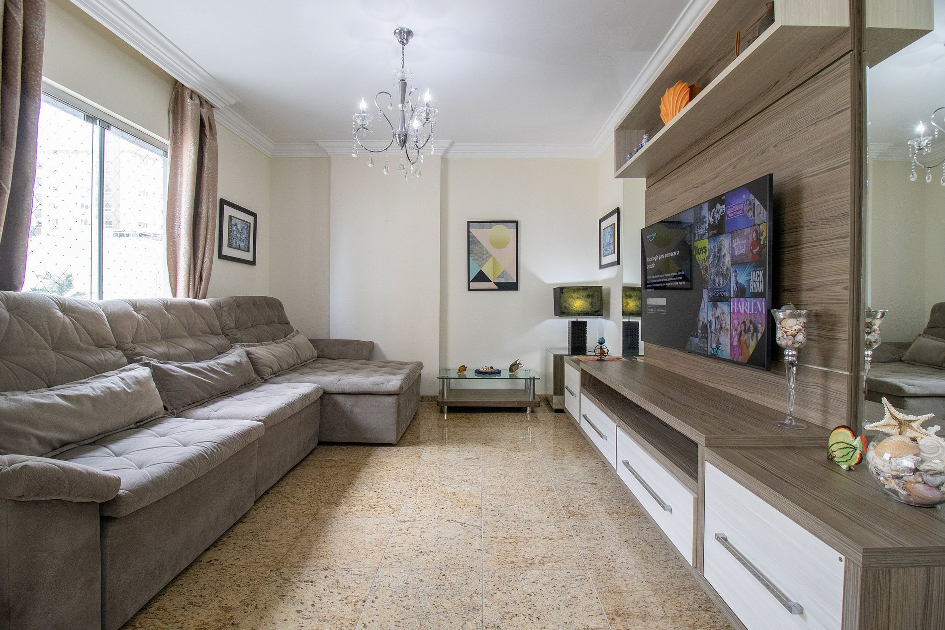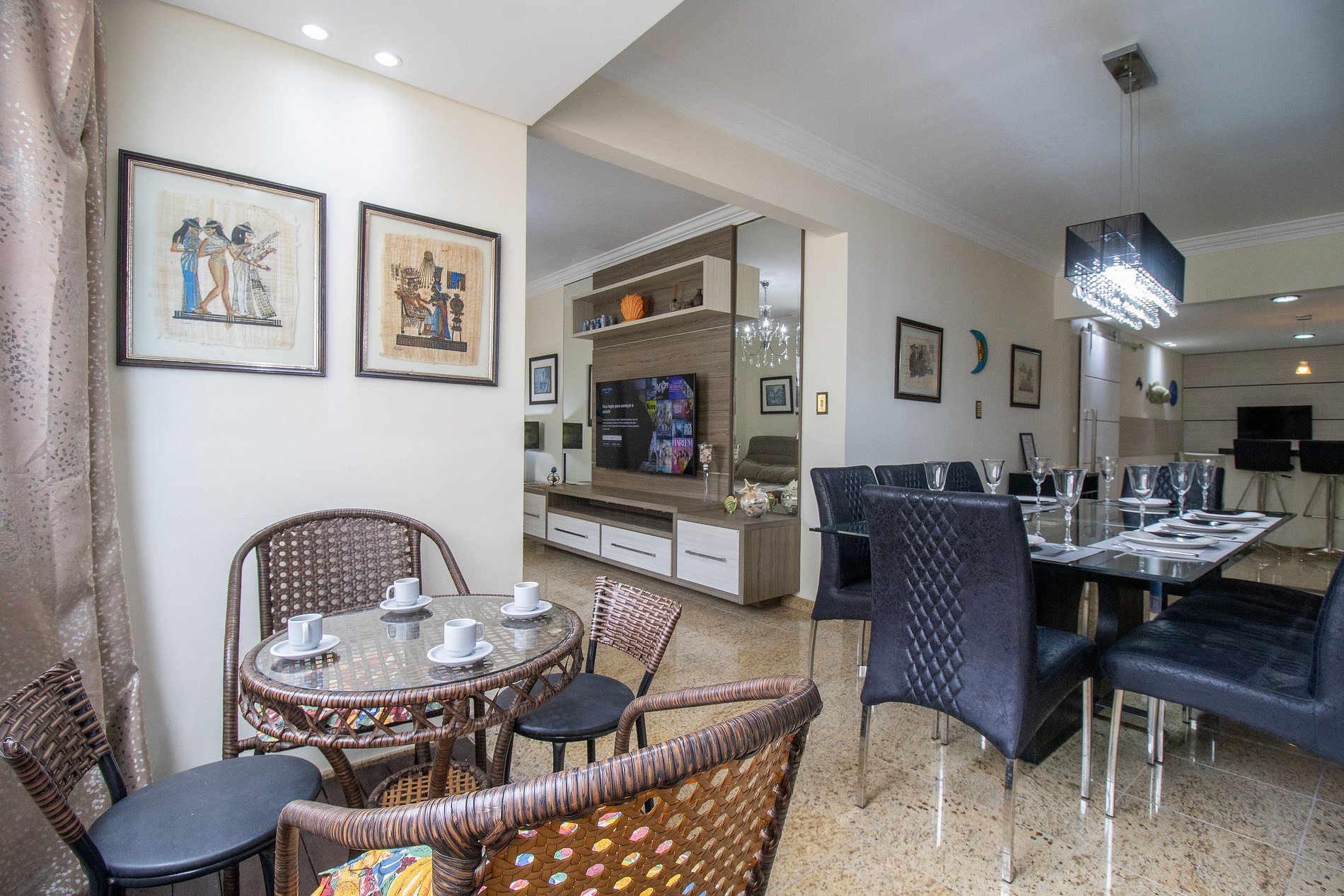 Internet wi-fi de boa qualidade de 300mb e própria do apartamento. Há TV Smart na sala e na área do bar. Conta com TV na suíte, em um dos dormitórios e na cozinha, essas possuem apenas acesso aos canais abertos.