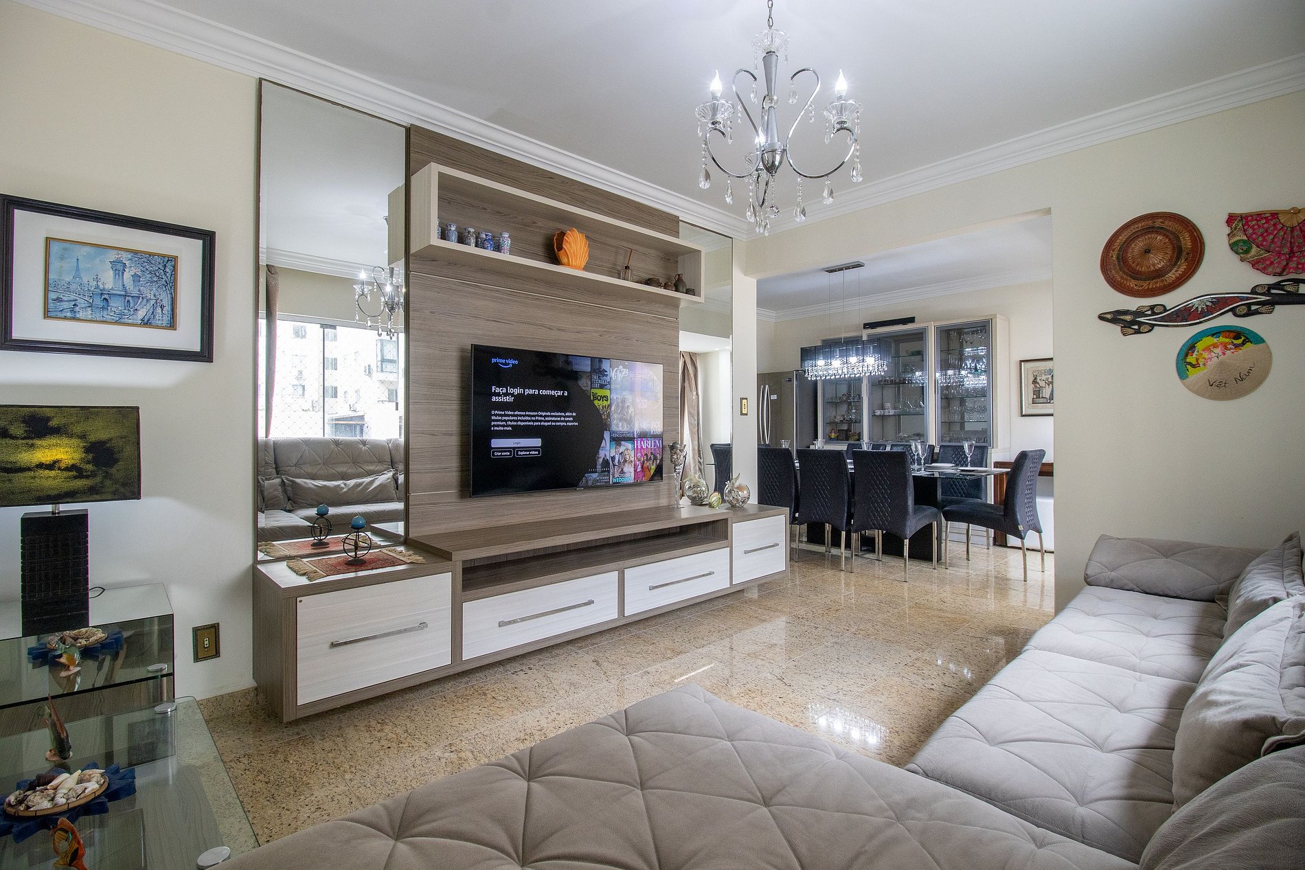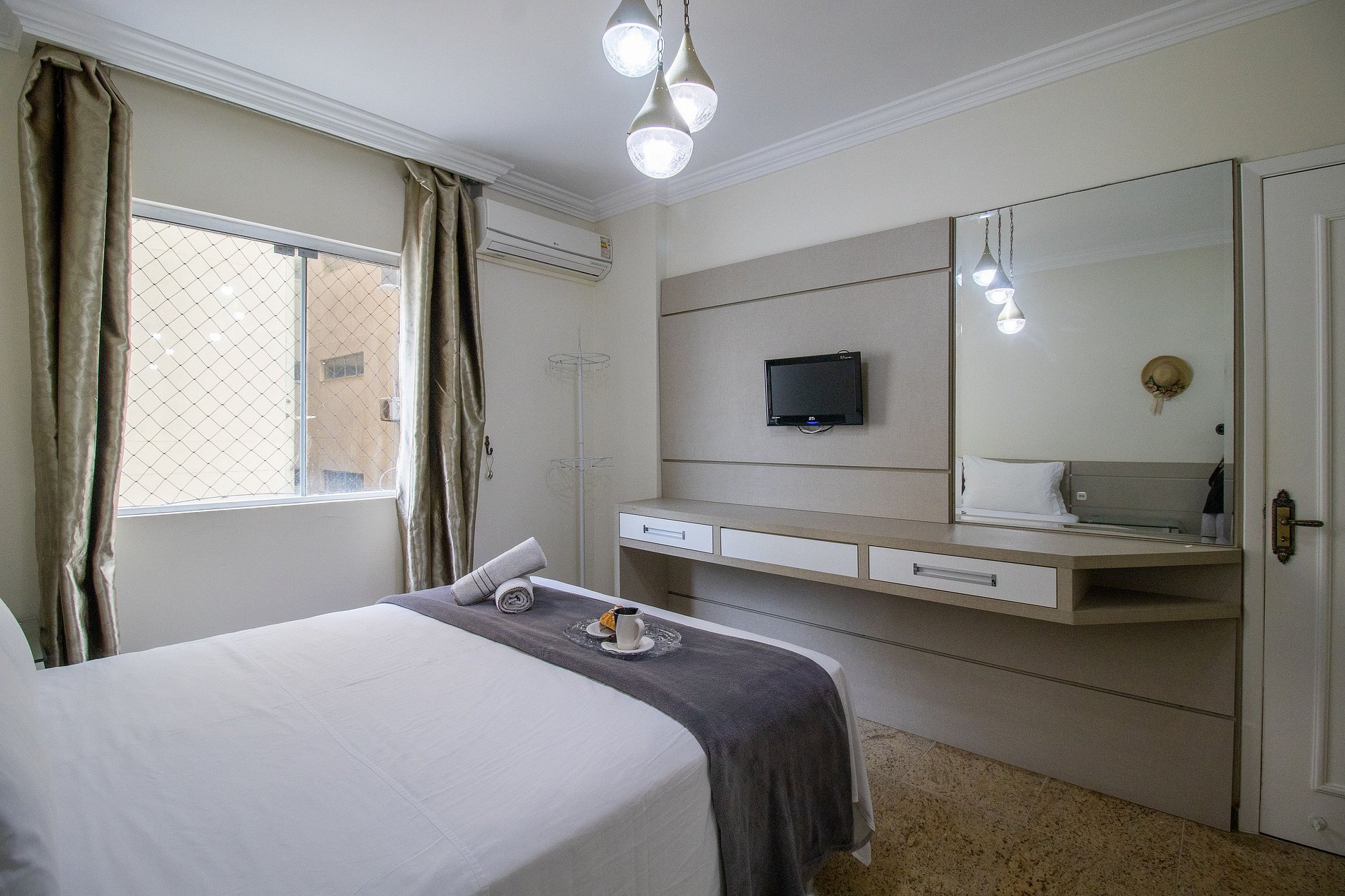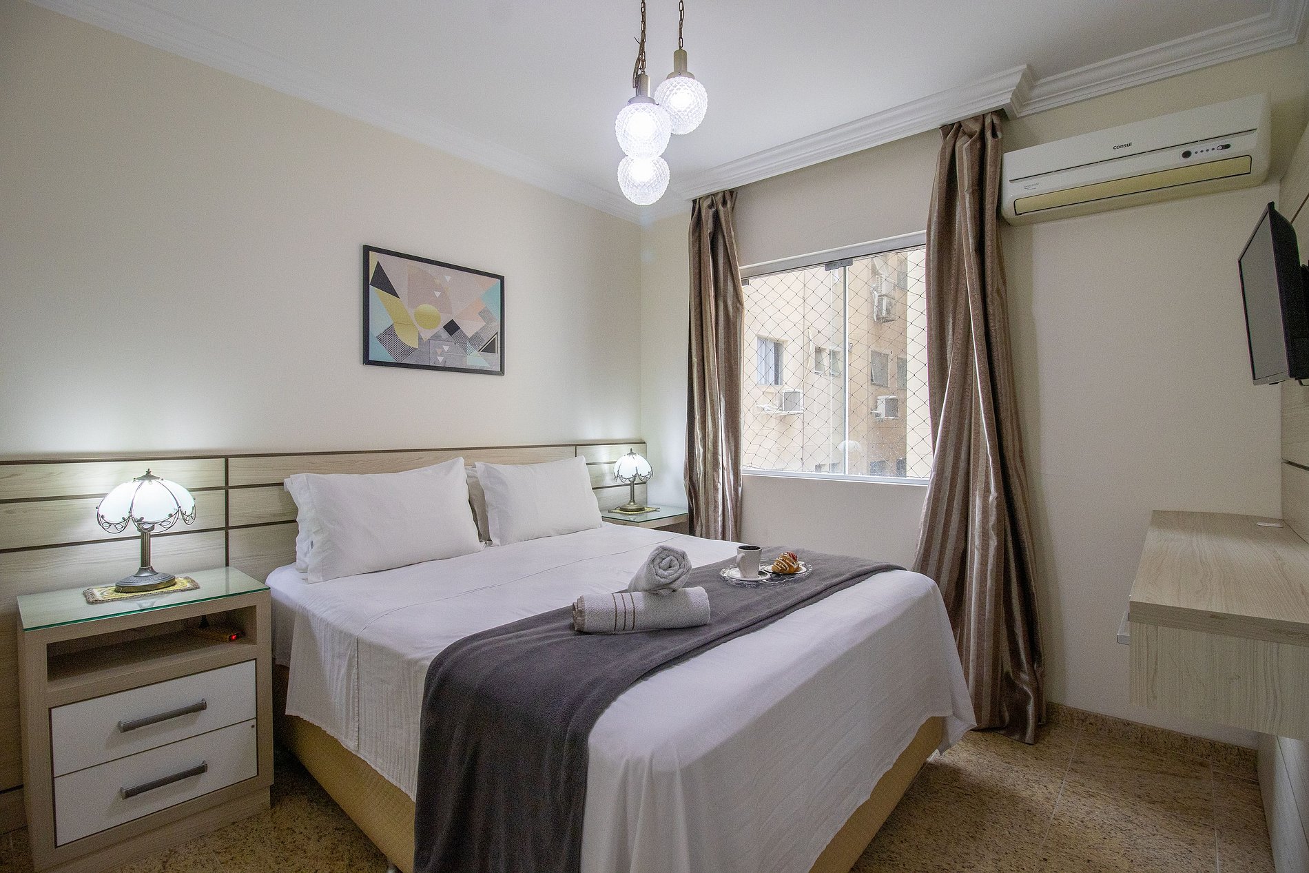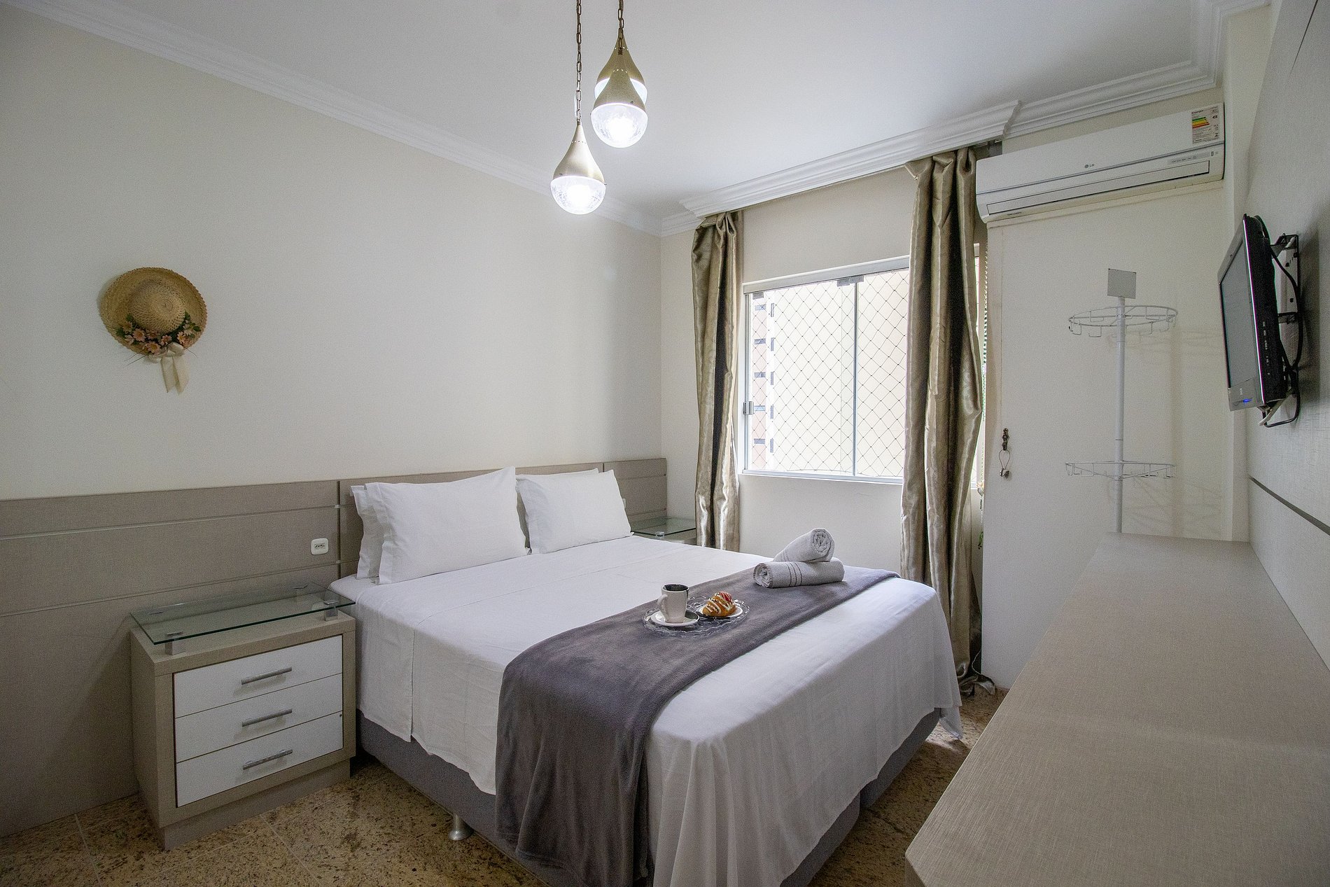O apartamento conta com cinco aparelhos de ar-condicionado split, garantindo conforto térmico em todos os ambientes. Na sala de estar e na cozinha, os aparelhos possuem função de refrigeração, ideais para os dias mais quentes. Já na suíte e nos dois dormitórios, os aparelhos são quente e frio, proporcionando climatização perfeita em qualquer época do ano. O quarto menos após a cozinha possui apenas um ventilador de mesa.