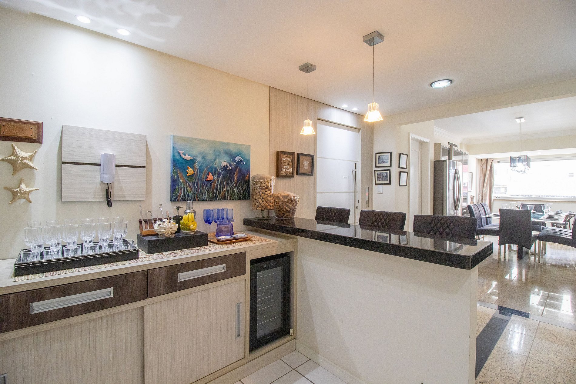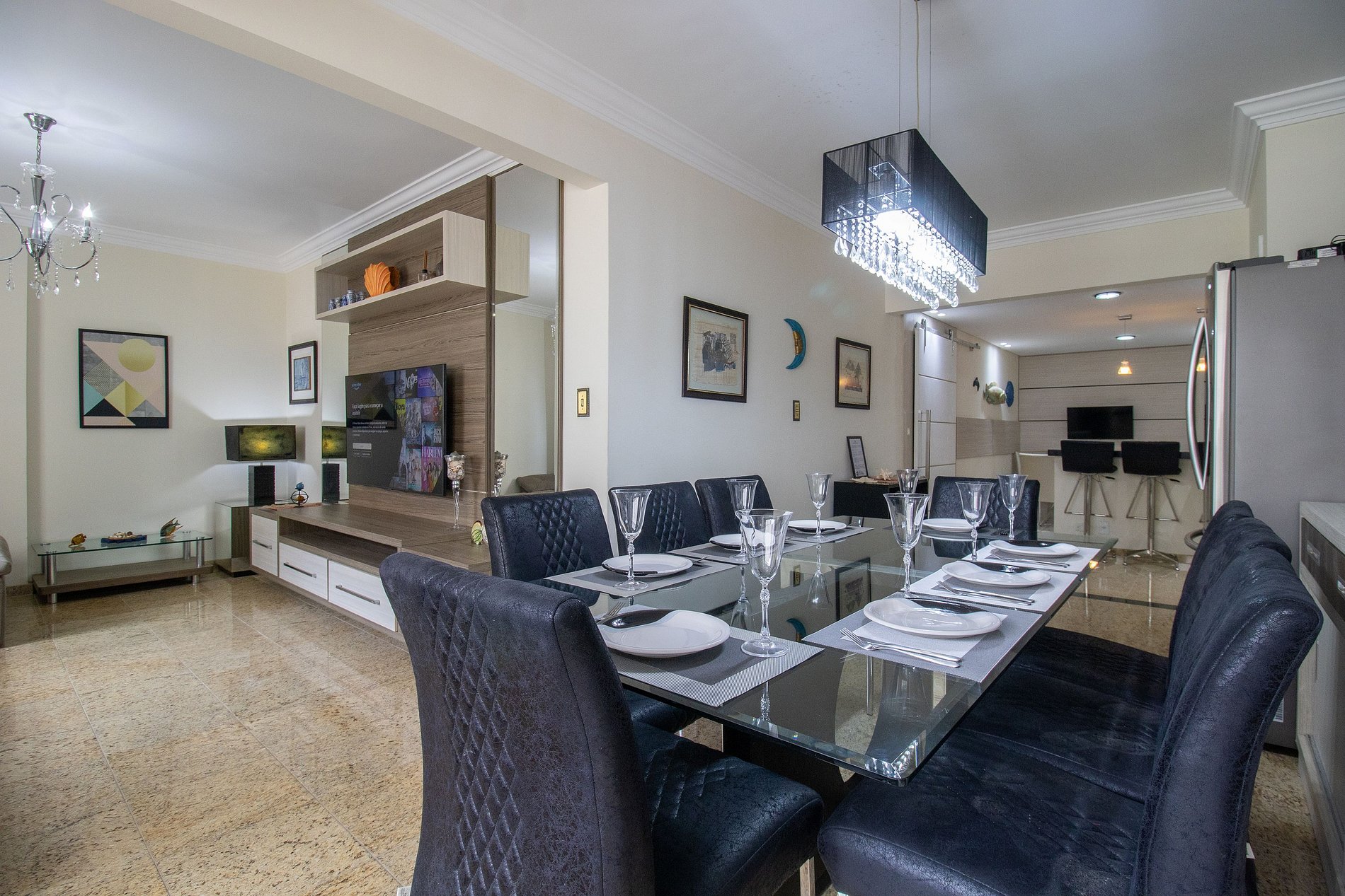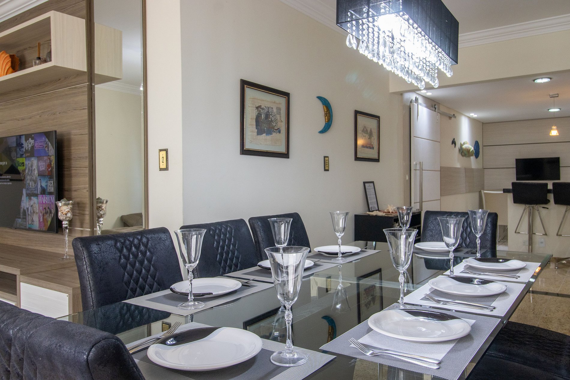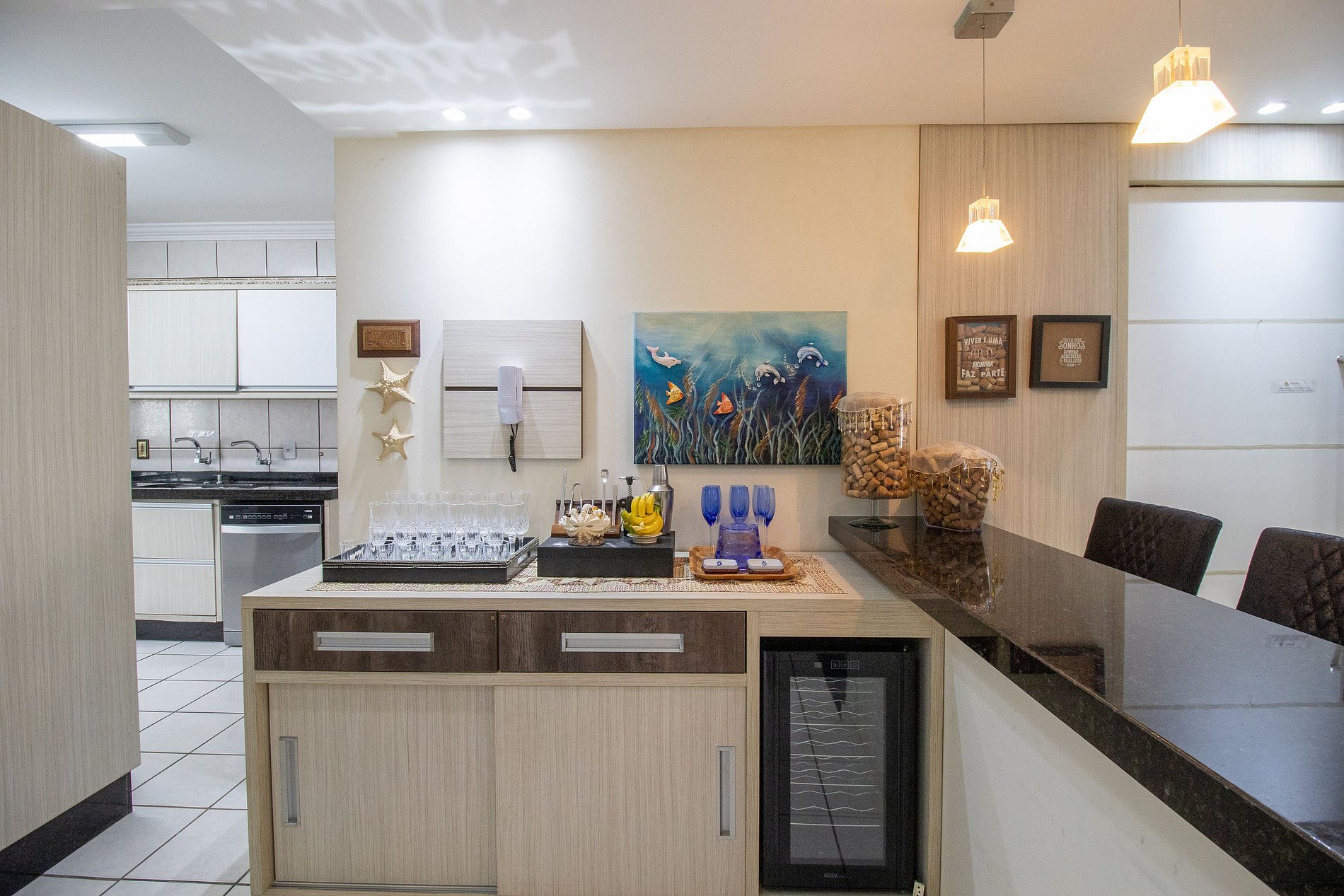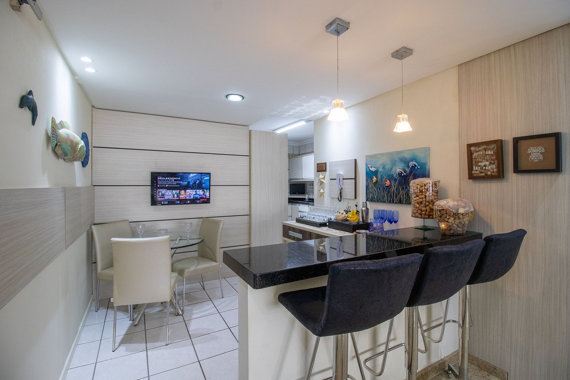 O apartamento foi pensado para acomodar até 8 hóspedes. São 4 quartos, sendo uma suíte: dois deles com camas queen, um quarto com cama de solteiro e cama auxiliar, além de um quarto menor com mais uma cama de solteiro. O espaço ainda conta com um colchão de solteiro avulso. A área social do apartamento é acolhedora, com sala de estar equipada com um sofá grande e TV smart, perfeita para relaxar depois de um dia na praia. Na sala de jantar, o ambiente é ideal para reunir todos à mesa, e para os momentos de descontração, a área de bar com mais uma TV smart proporciona um espaço extra para convivência. O apartamento conta com um banheiro social e um lavabo, oferecendo ainda mais praticidade para todos. A cozinha é completa e bem equipada, contando com utensílios básicos, geladeira, fogão, forno elétrico, microondas, lava-louças, além de eletrodomésticos como air fryer, liquidificador, sanduicheira, cafeteira elétrica e conta ainda com uma centrífuga, tudo para facilitar sua estadia.