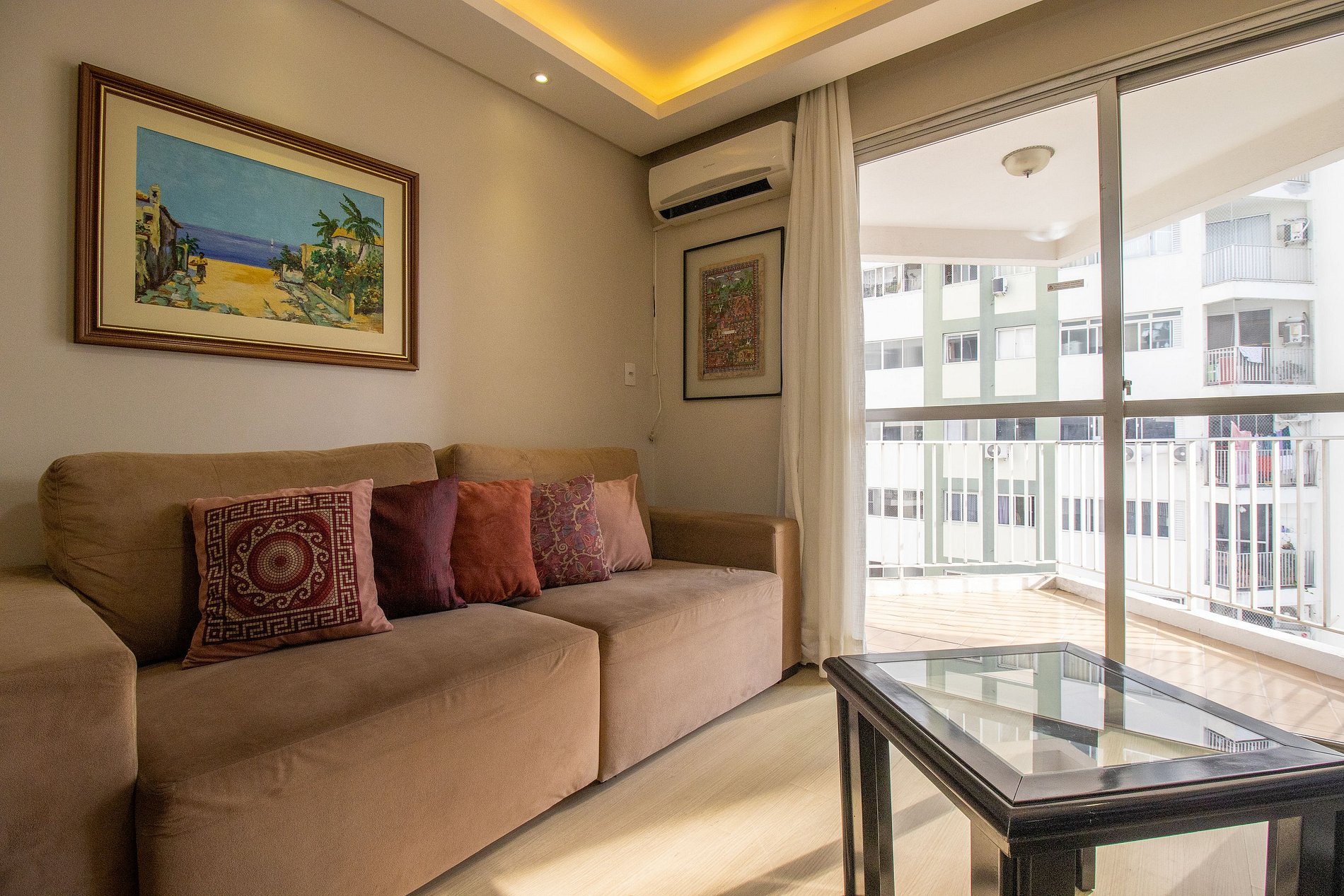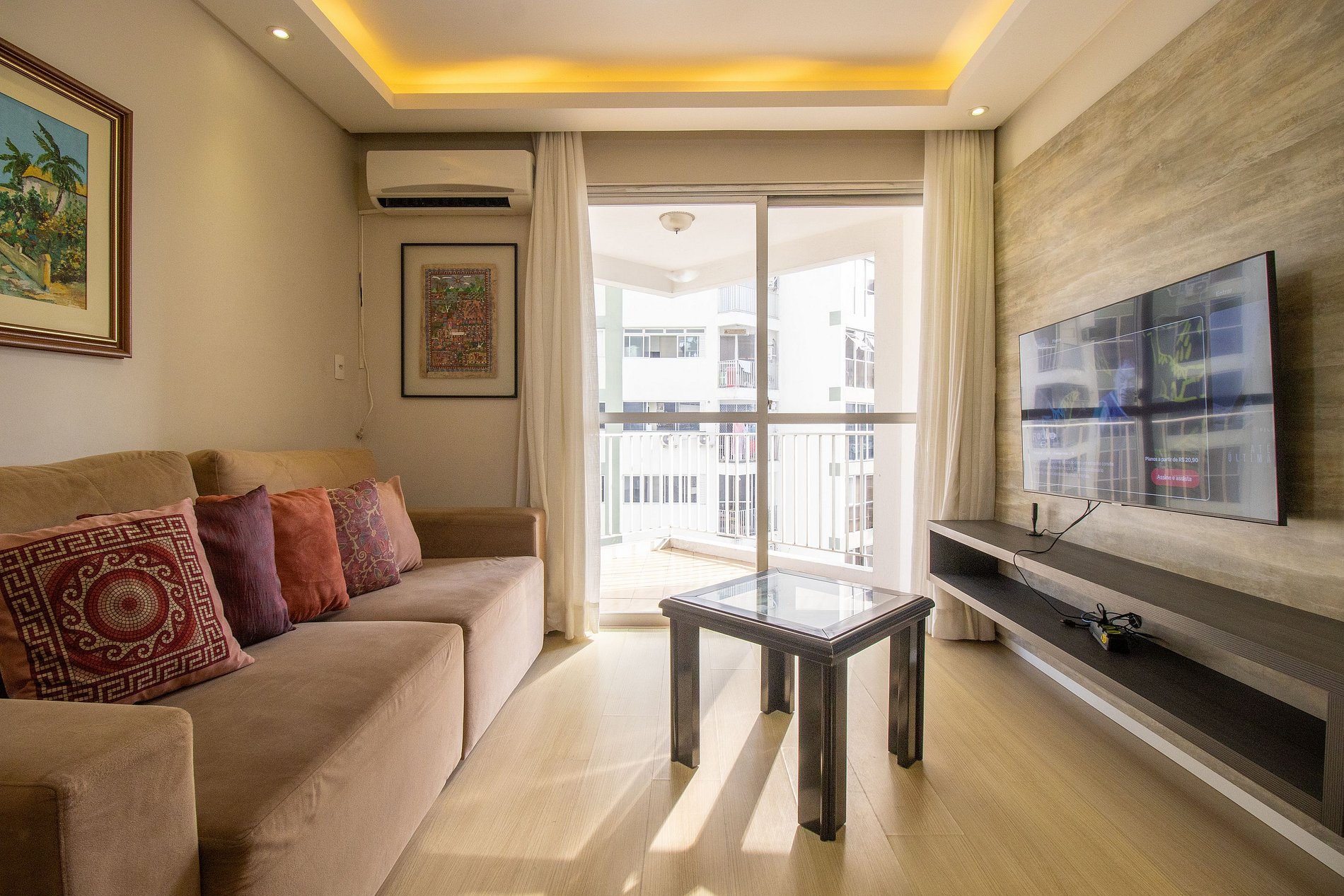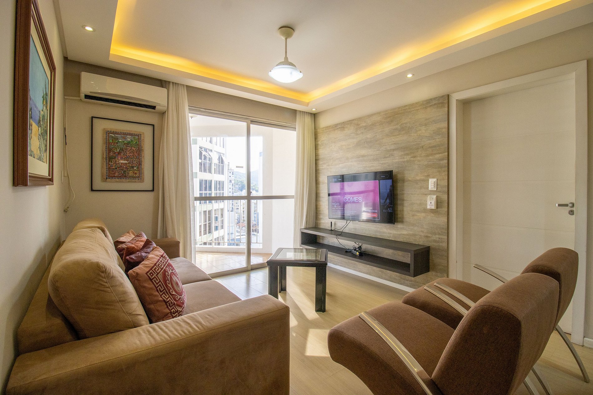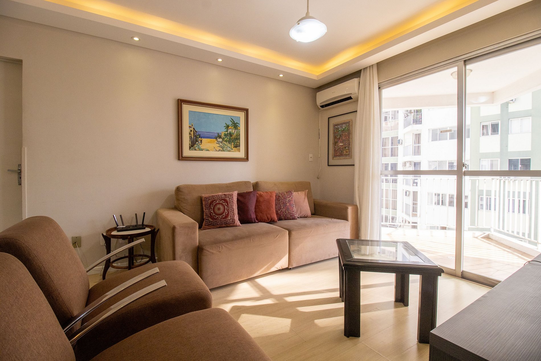 O apartamento é bem climatizado e conta com 5 aparelhos de ar-condicionado, sendo um em cada quarto e mais um na sala.