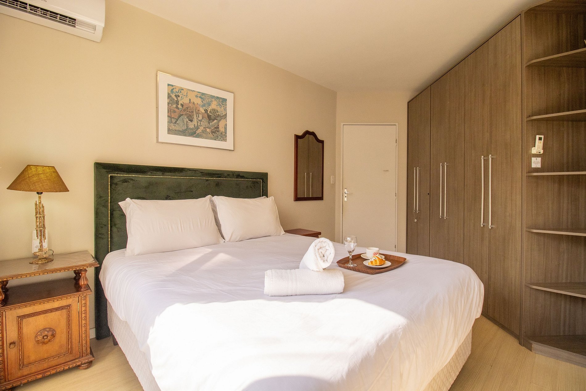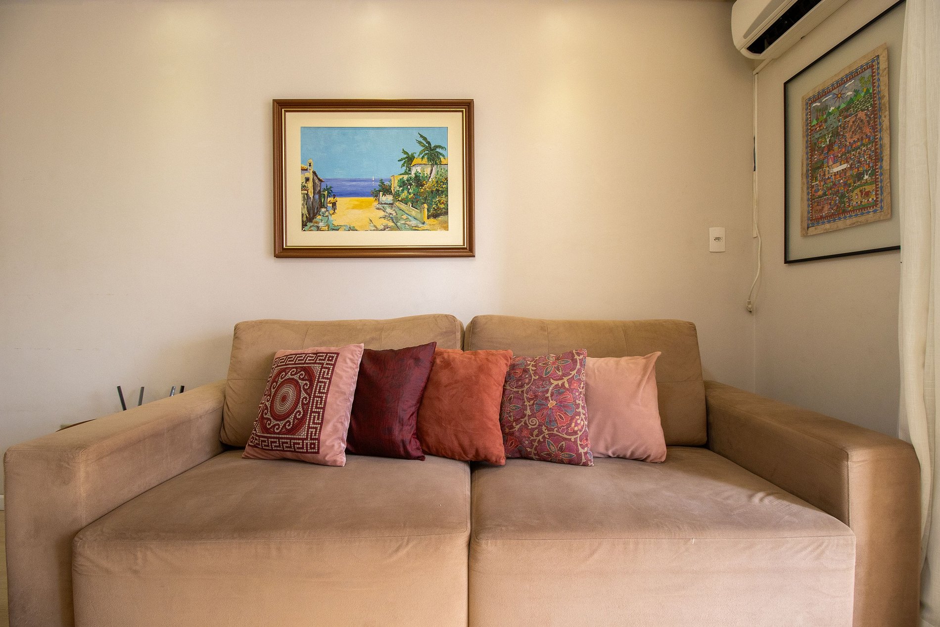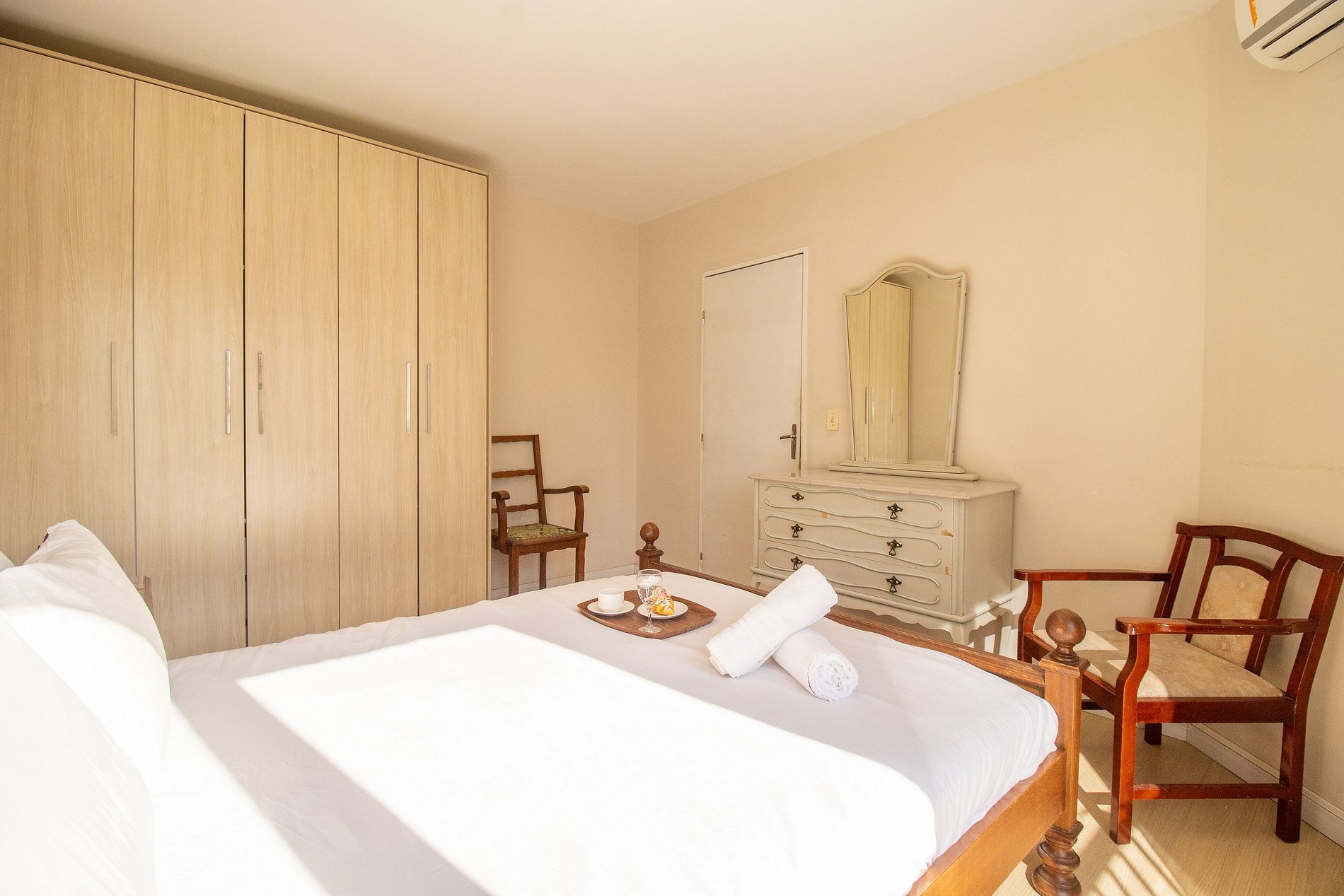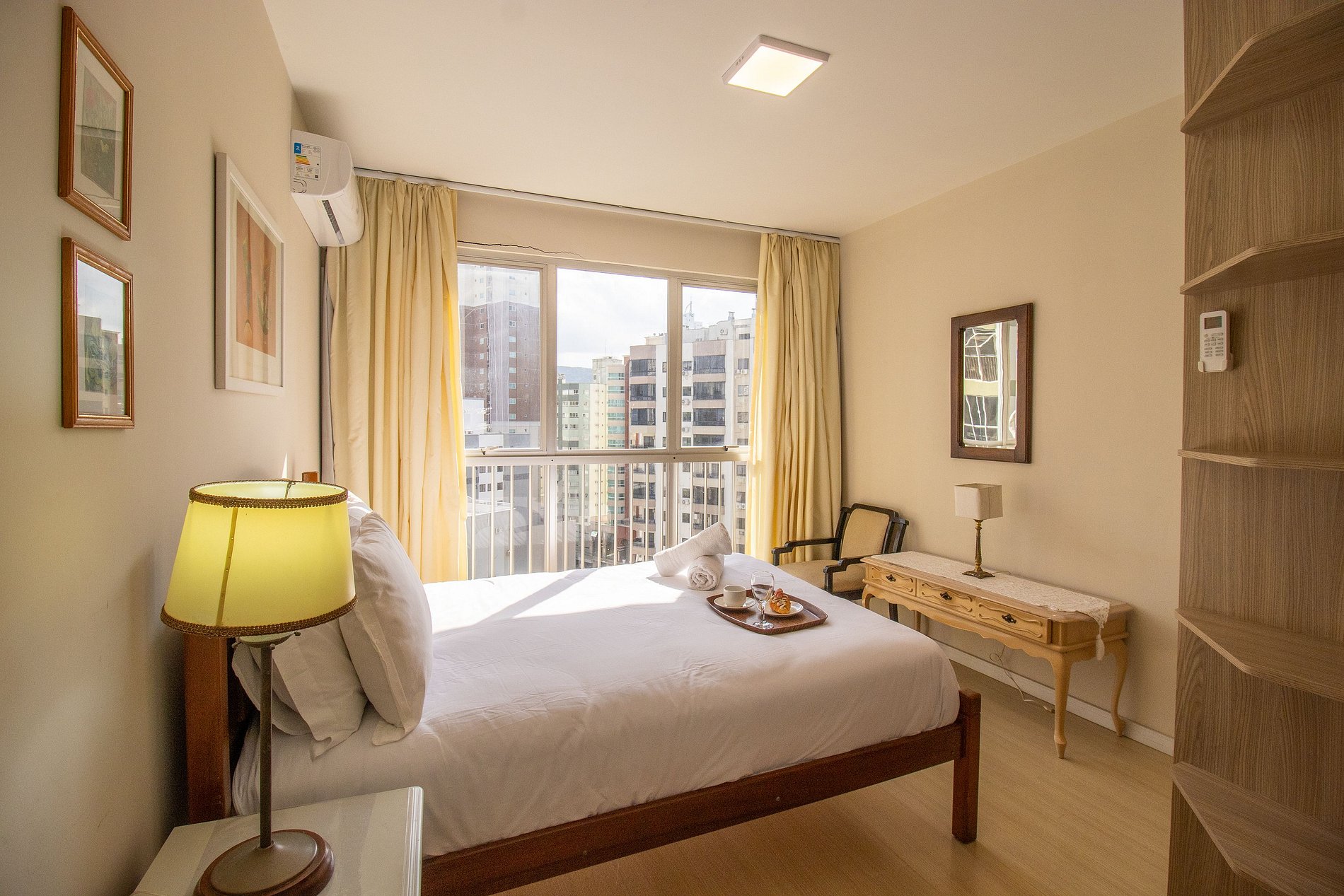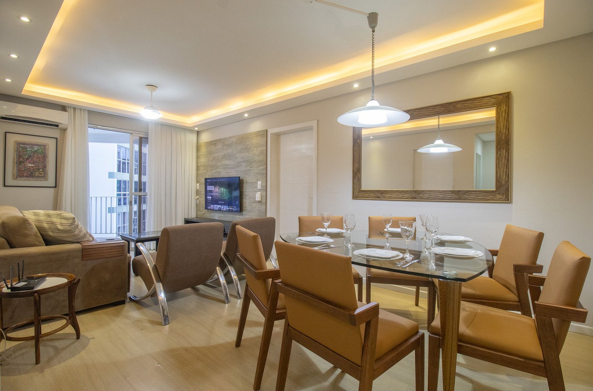 O apartamento é bem climatizado e conta com 5 aparelhos de ar-condicionado, sendo um em cada quarto e mais um na sala.