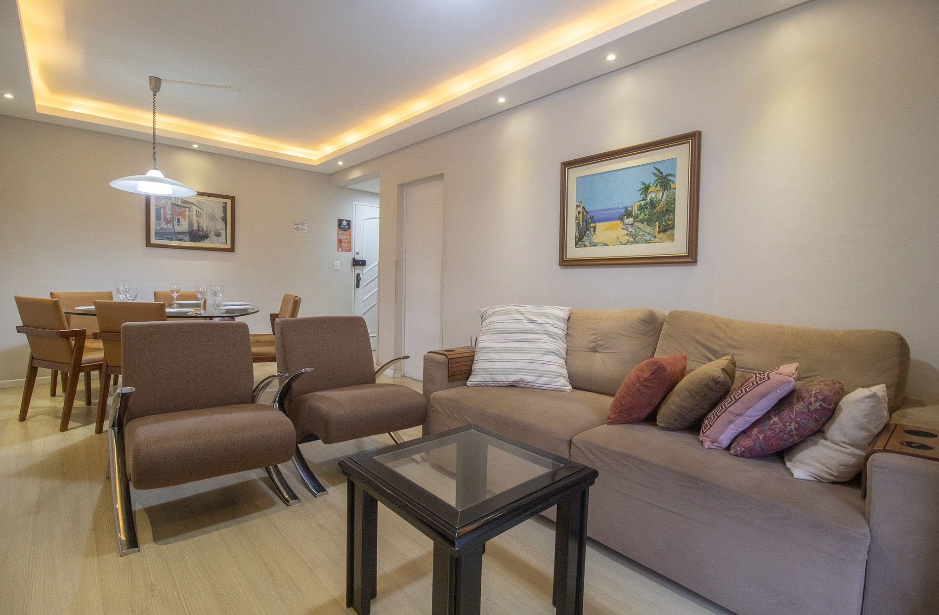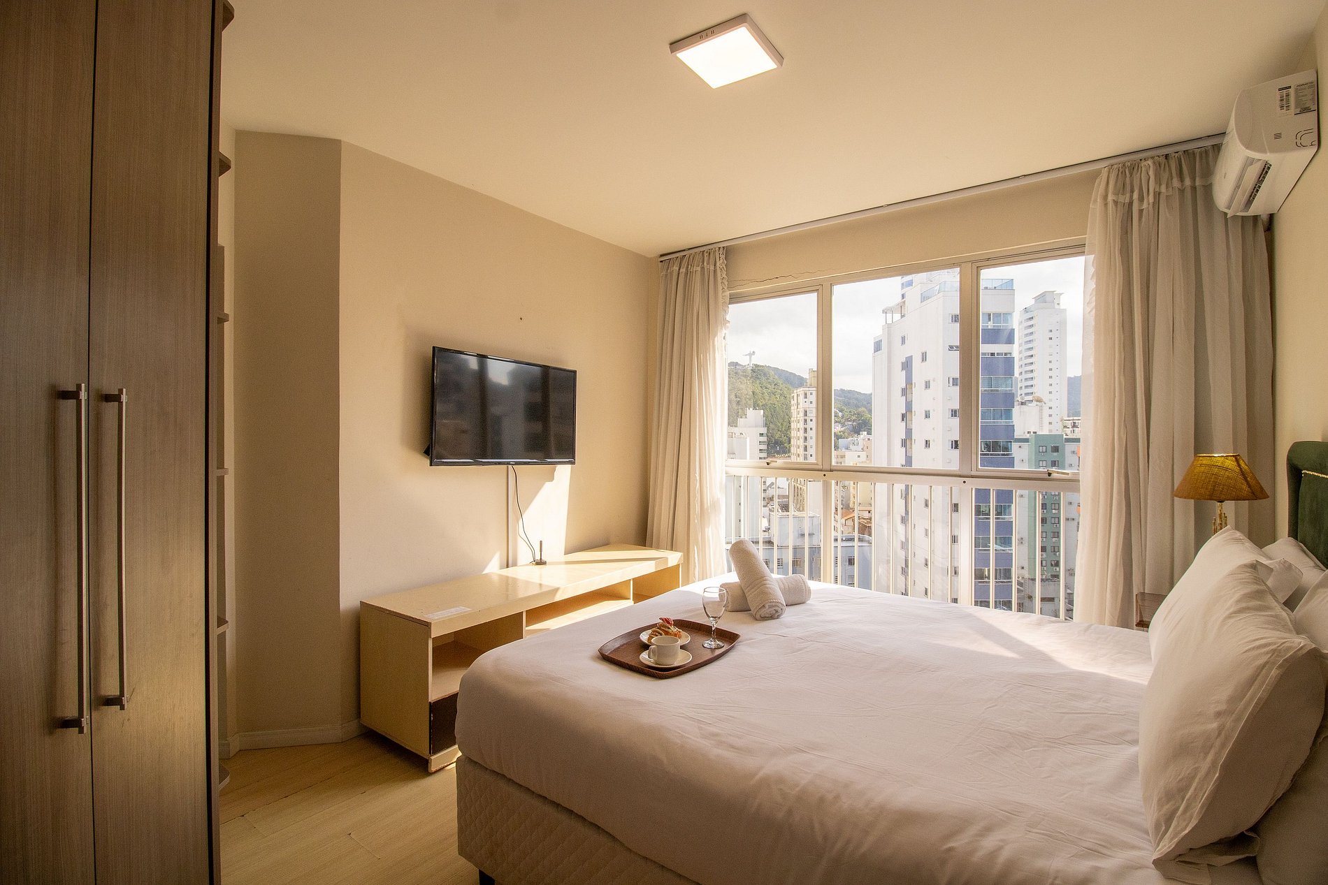 O apartamento conta com quatro dormitórios, sendo cada um deles com uma cama de casal e ar-condicionado. A sala conta com dois ambientes, sendo um com mesa de jantar e outro com sofá e TV de 50" e ela tem saída para a sacada do apartamento. A cozinha é bem equipada e conta com utensílios para a realização e preparo de refeições básicas, incluindo Airfryer. Área de serviço ao lado da cozinha, conta com máquina de lavar roupas e com varal de teto para secar roupas. Ao total são 3 banheiros com chuveiro, sendo um na suíte, um no corredor principal e outro localizado após a cozinha.