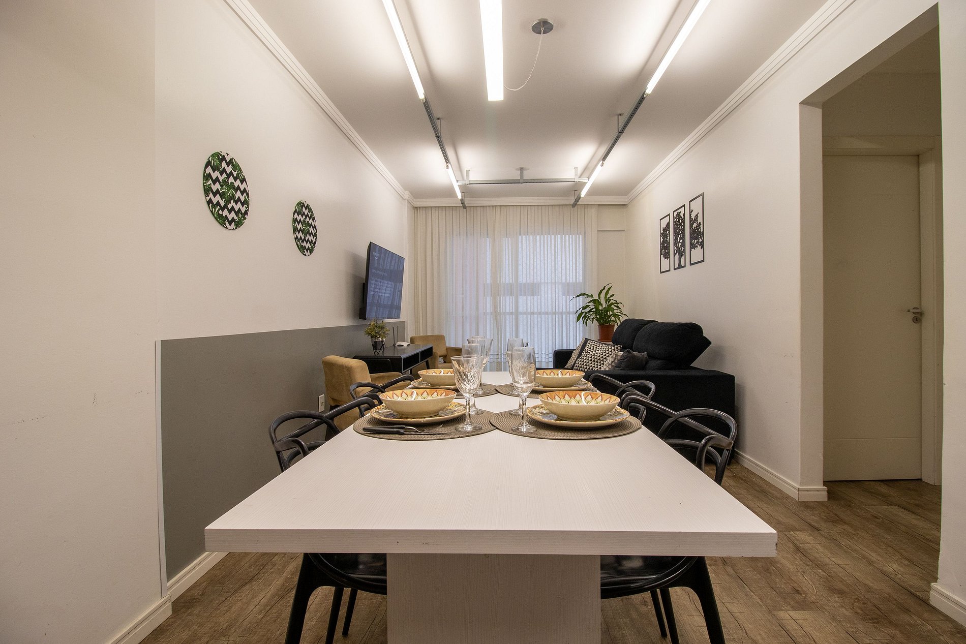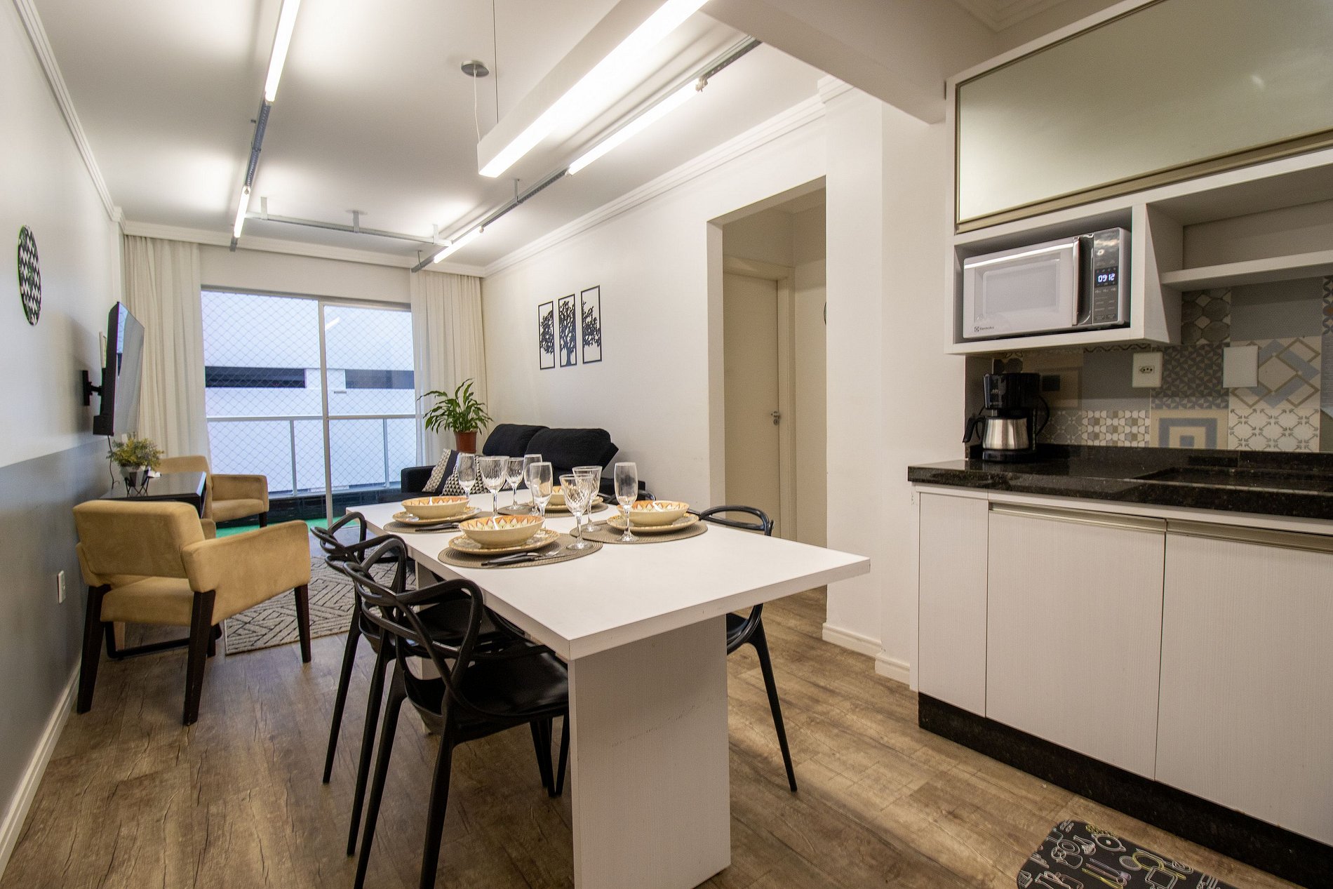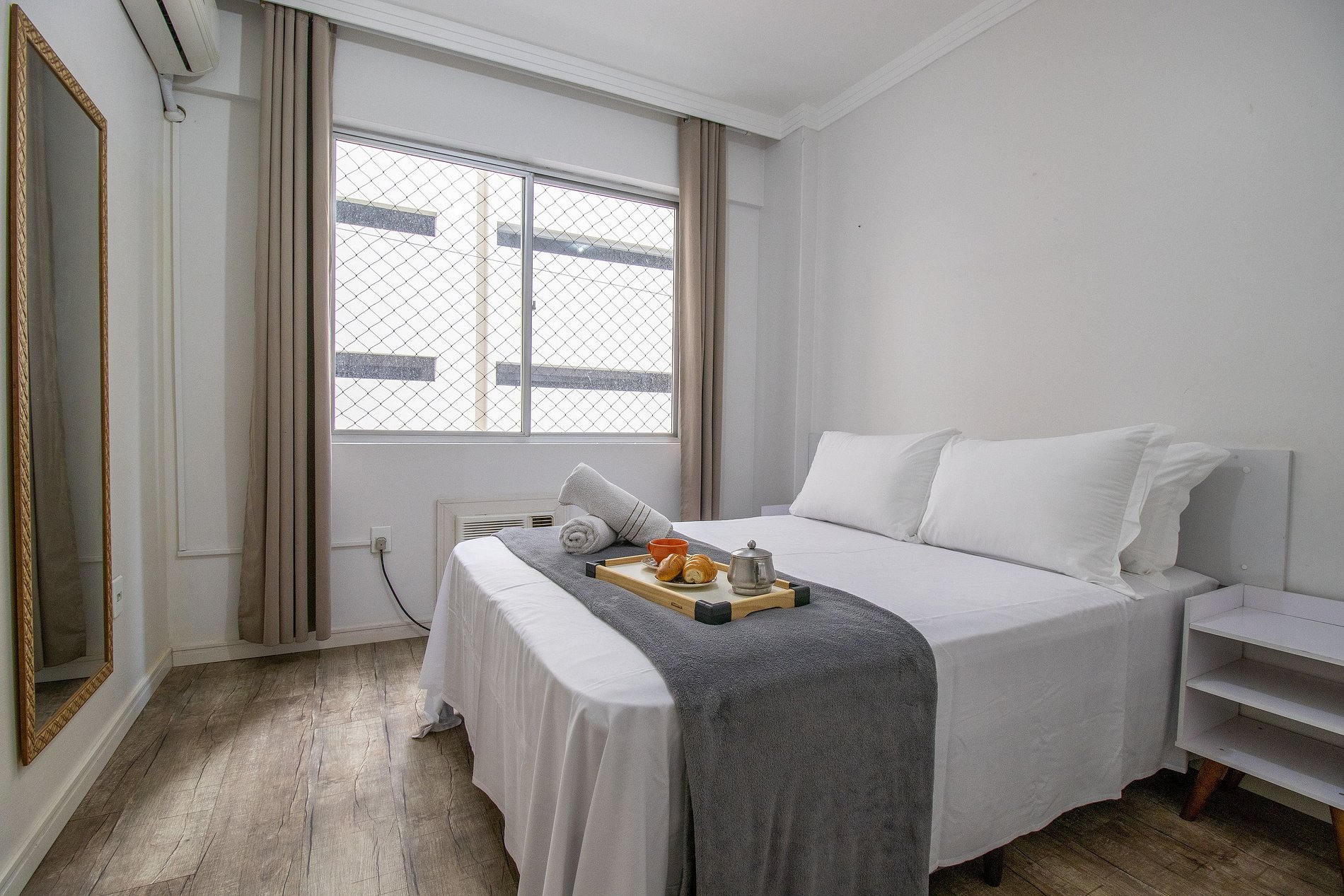 O apartamento conta com três dormitórios, sendo dois dormitórios maiores e um dormitório menor após a cozinha que possui um banheiro (o banheiro é separado do dormitório por uma cortina). Ao total são duas camas de casal, uma cama de solteiro com uma cama de solteiro auxiliar, e um colchão de solteiro avulso. Há televisão Smart na sala. Cozinha é equipada com utensílios para refeições básicas, forno elétrico, microondas, sanduicheira, liquidificador, cafeteira, chaleira elétrcia, cafeteira nespresso, ferro de passar roupa e secador de cabelo.