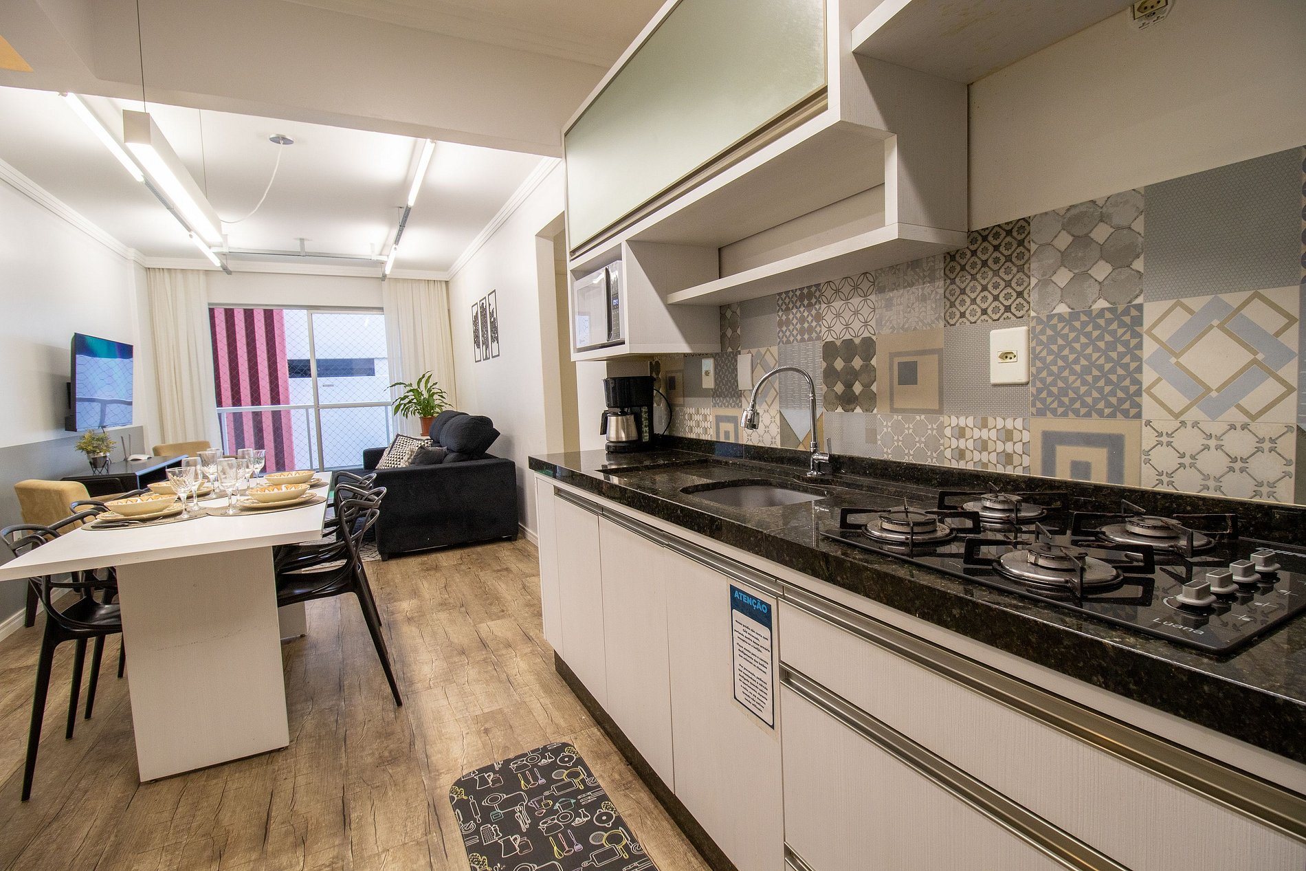 O apartamento conta com três dormitórios, sendo dois dormitórios maiores e um dormitório menor após a cozinha que possui um banheiro (o banheiro é separado do dormitório por uma cortina). Ao total são duas camas de casal, uma cama de solteiro com uma cama de solteiro auxiliar, e um colchão de solteiro avulso. Há televisão Smart na sala. Cozinha é equipada com utensílios para refeições básicas, forno elétrico, microondas, sanduicheira, liquidificador, cafeteira, chaleira elétrcia, cafeteira nespresso, ferro de passar roupa e secador de cabelo.