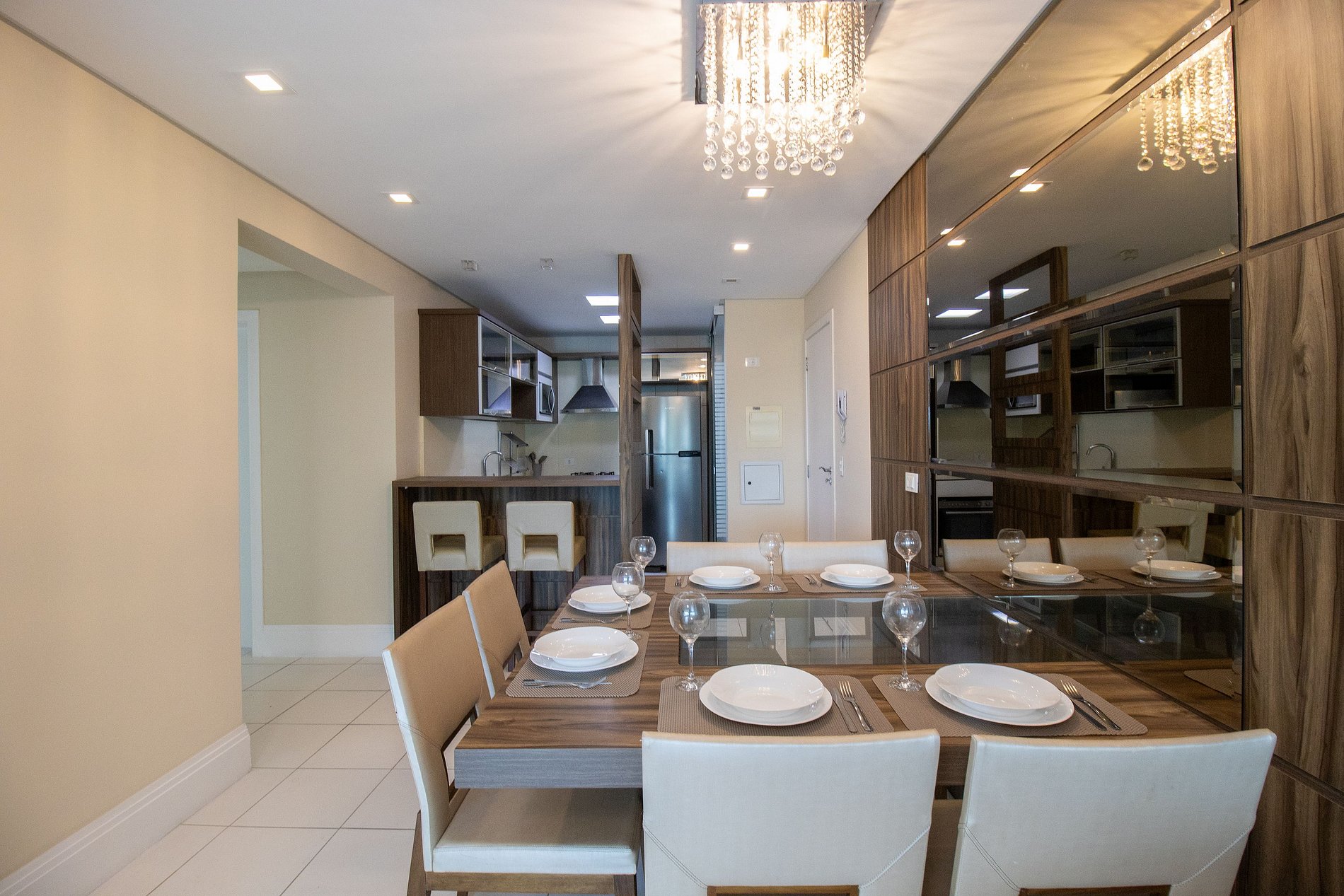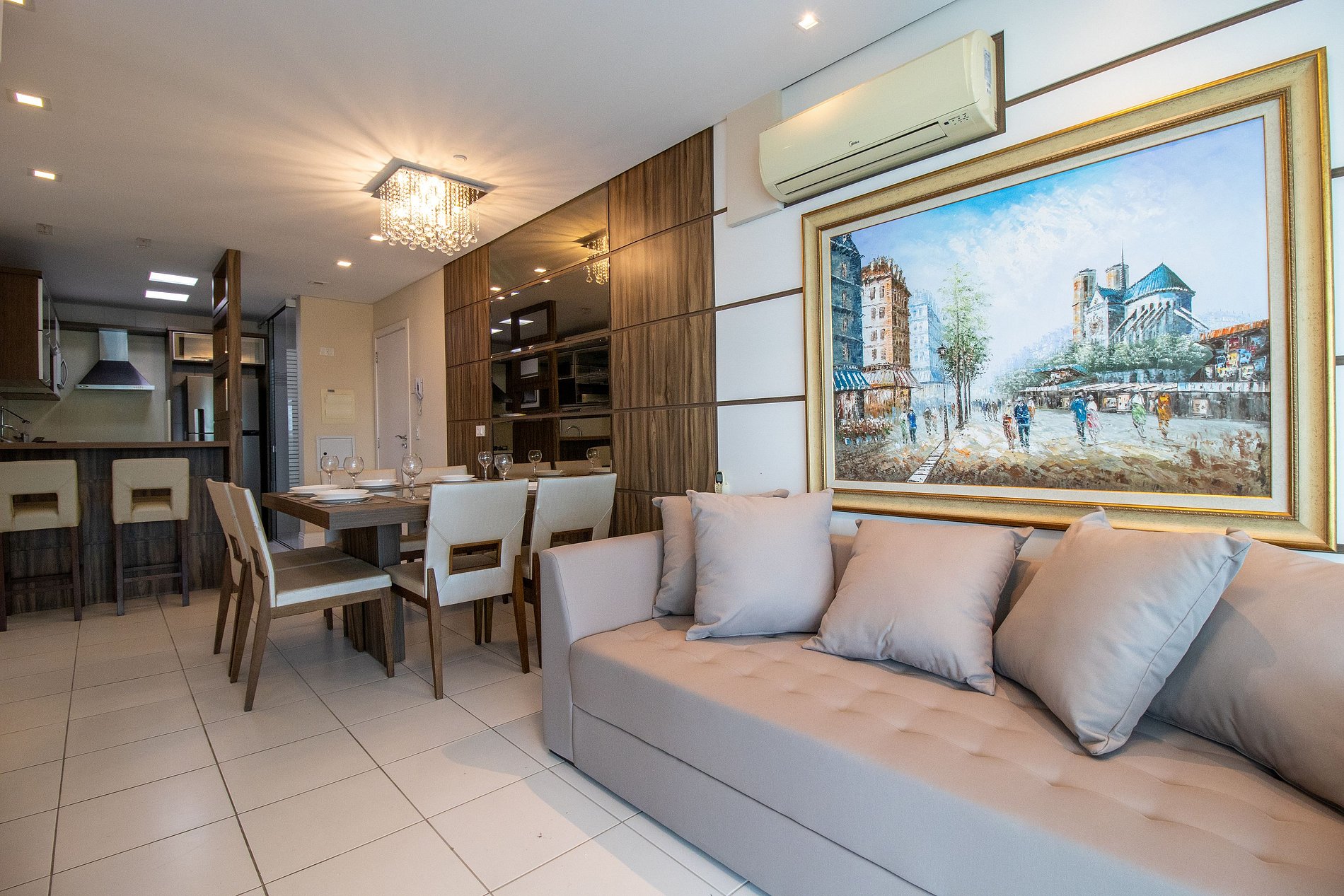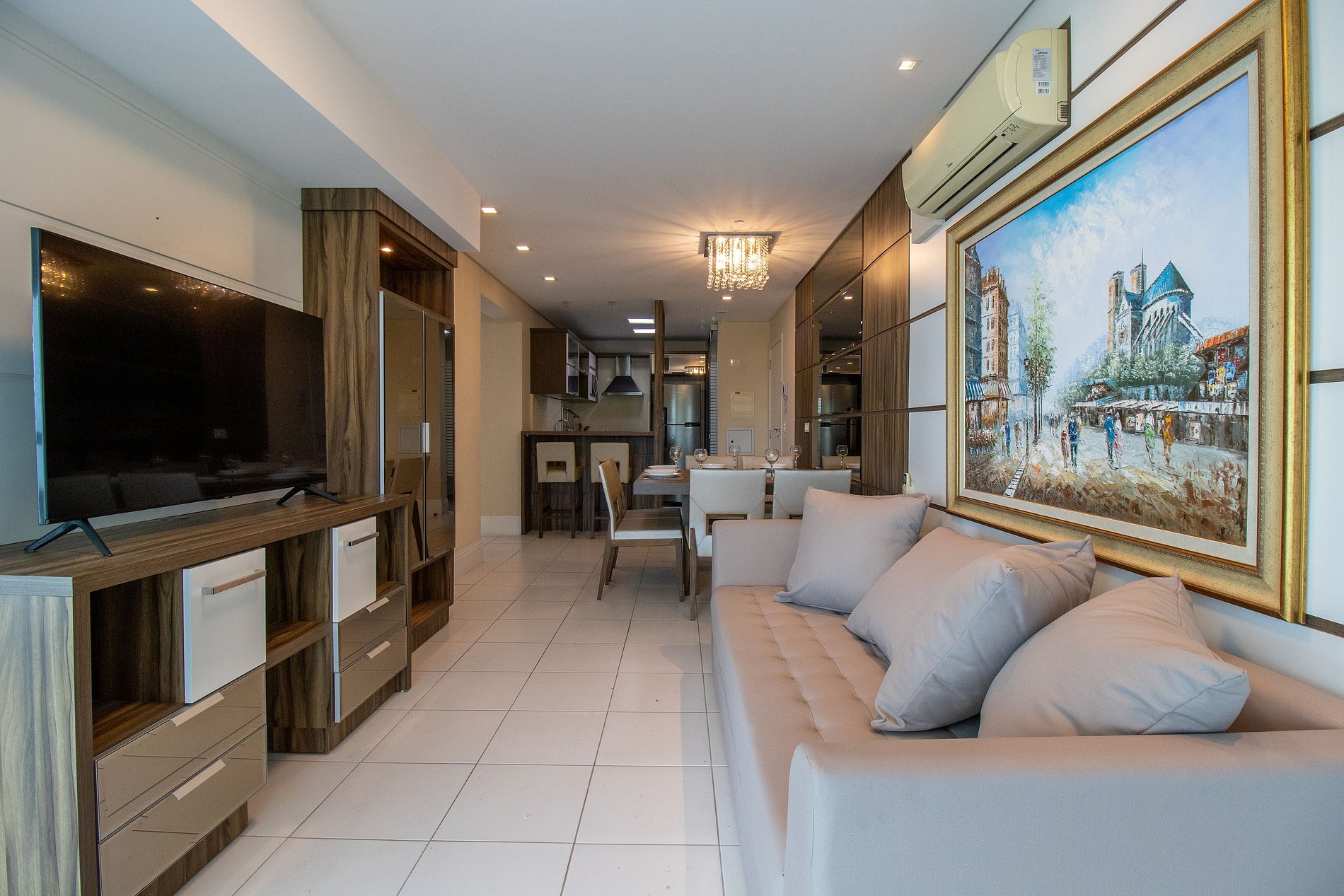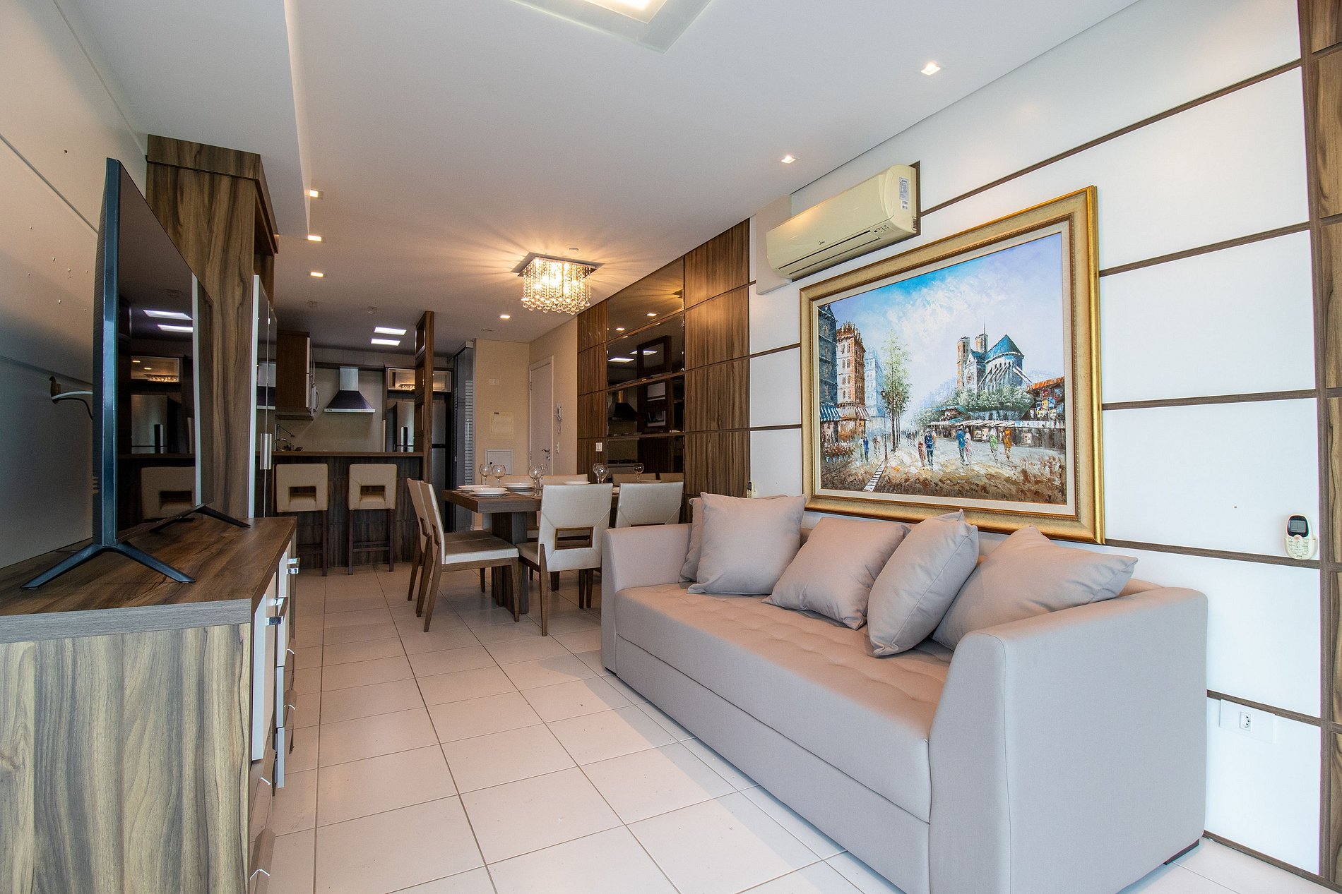 O apartamento conta com uma suíte e mais um dormitório, ao total temos uma cama queen, uma cama de casal e dois colchões de solteiro, ar condicionado split nos dormitórios e na sala e TV Smart na sala. Sala dois ambientes com sofá confortável. Cozinha com microondas, cafeteira, sanduicheira, liquidificador, utensílios para refeições básicas, ferro de passar roupa e secador de cabelo.