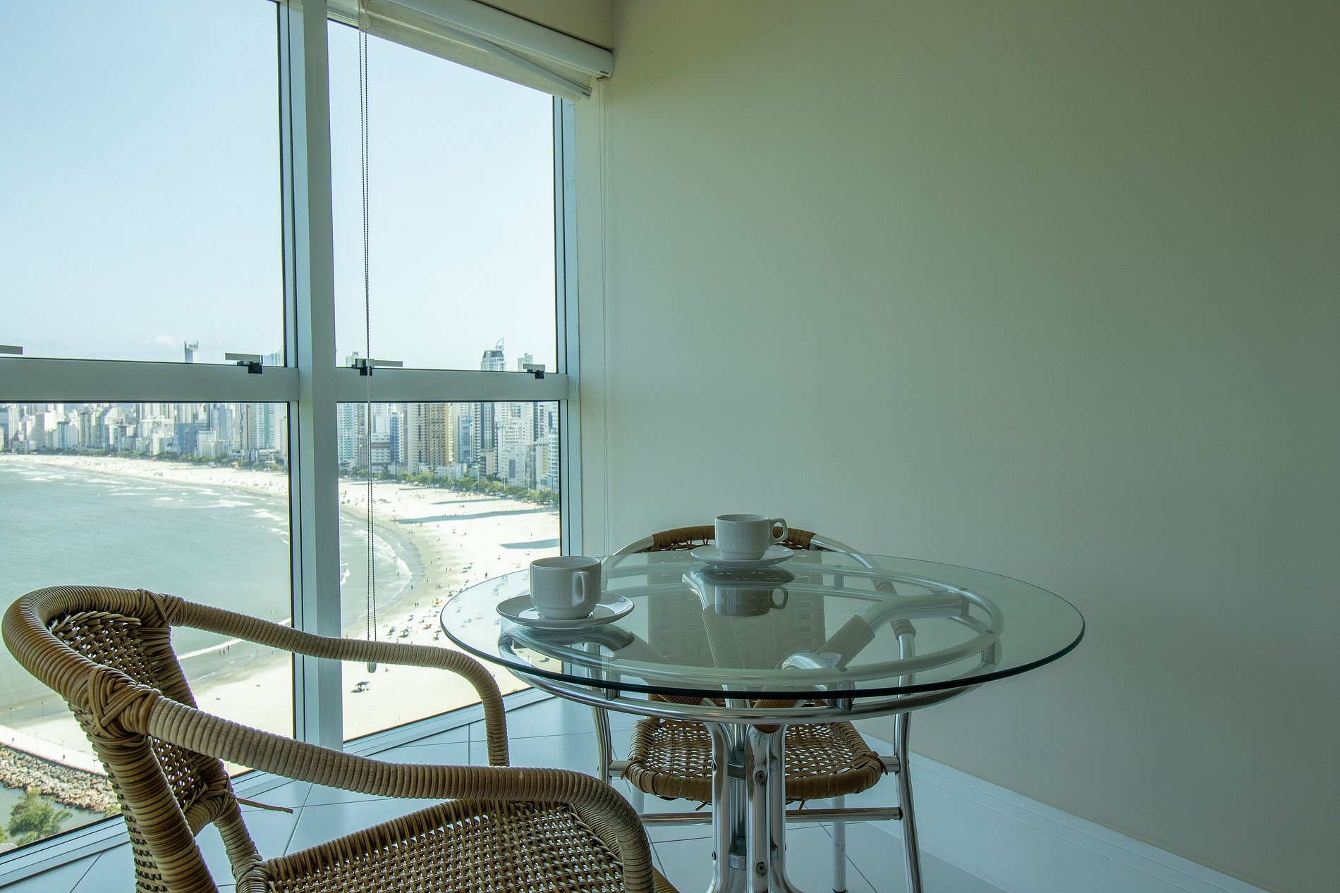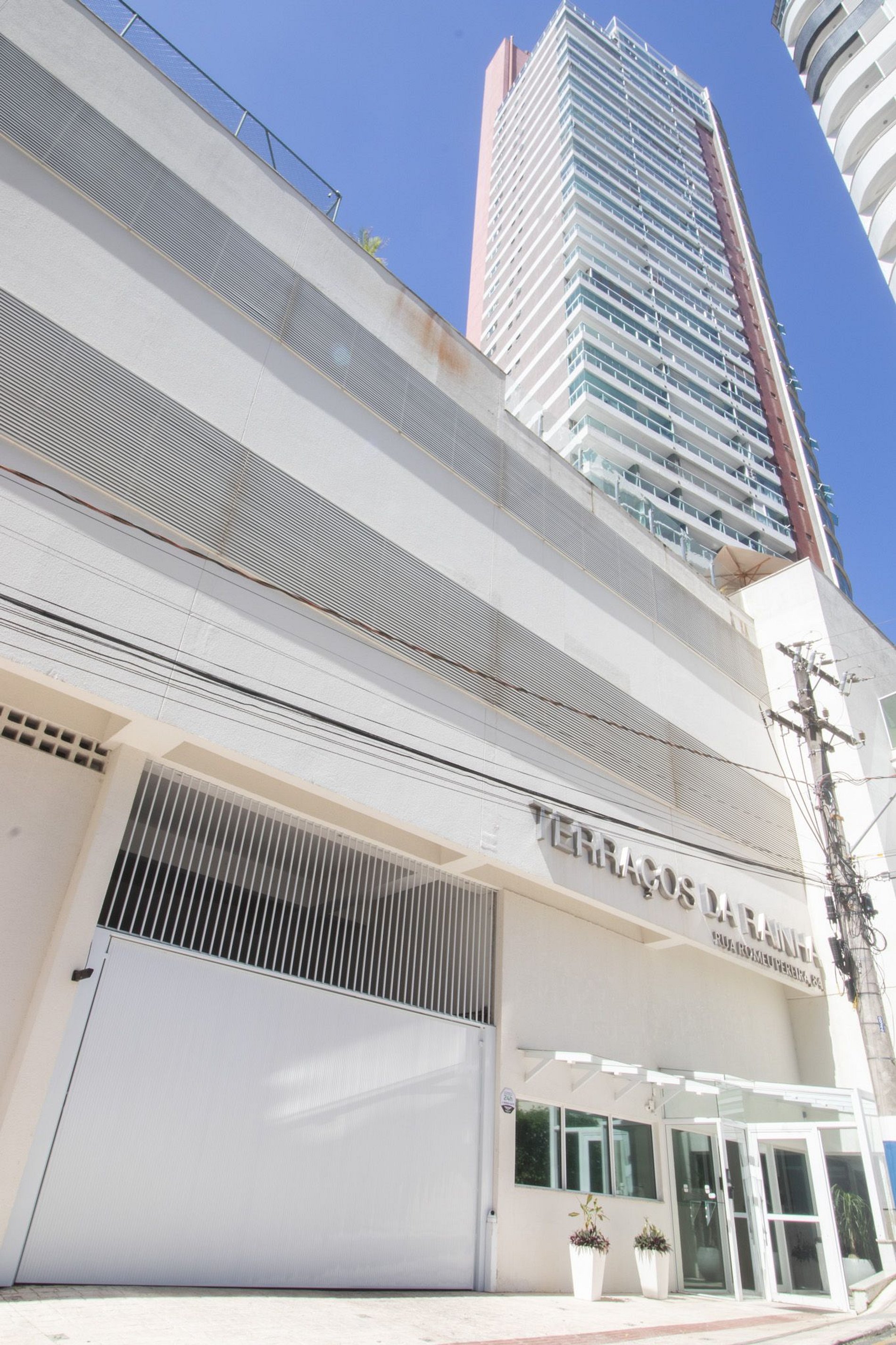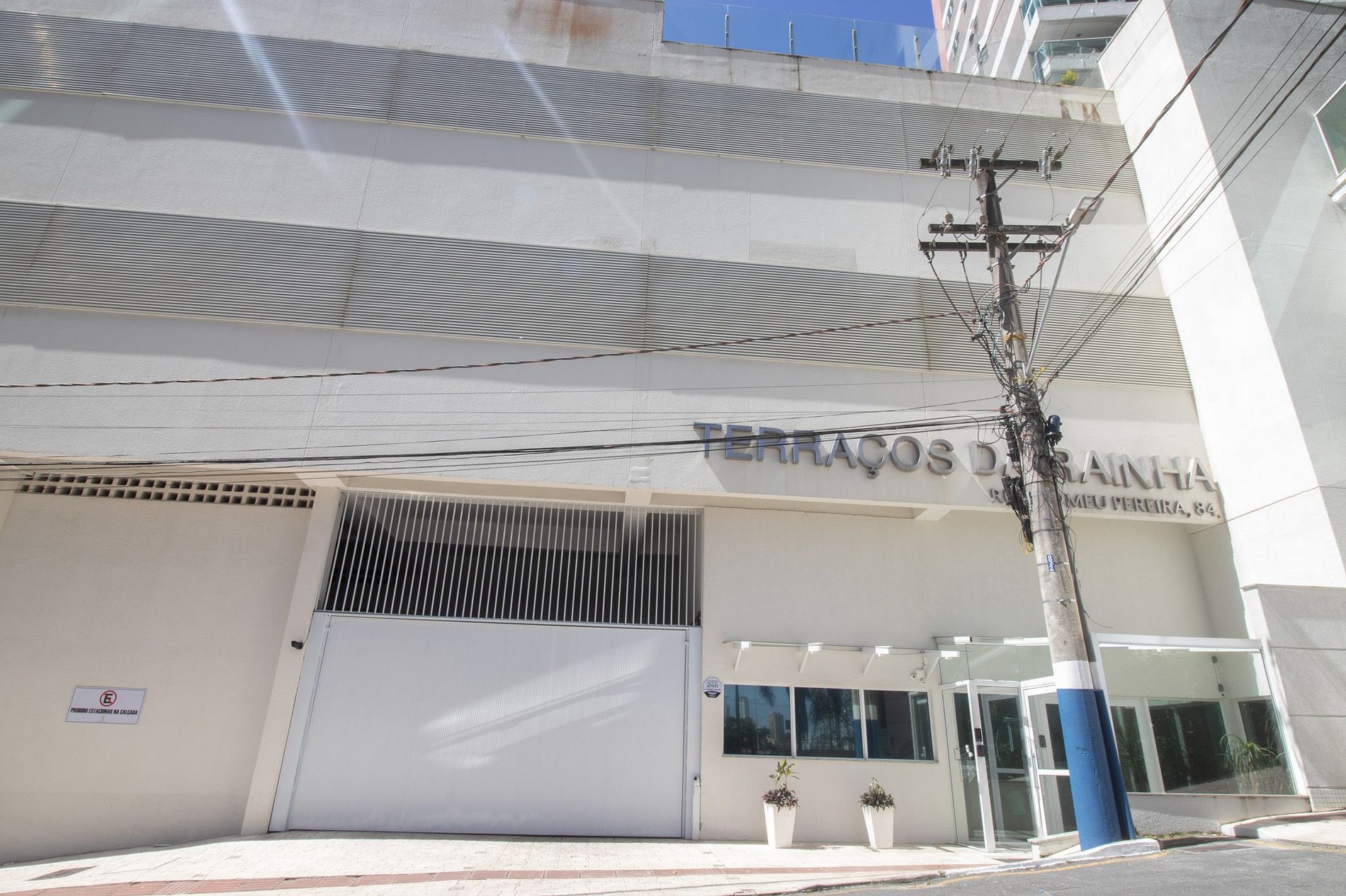 Esse apartamento é localizado no Edifício Terraços da Rainha, que fica na rua Romeu Pereira, número oitenta e quatro. Ele fica a cerca de 100 metros da areia da praia, roda gigante e molhe da barra norte.