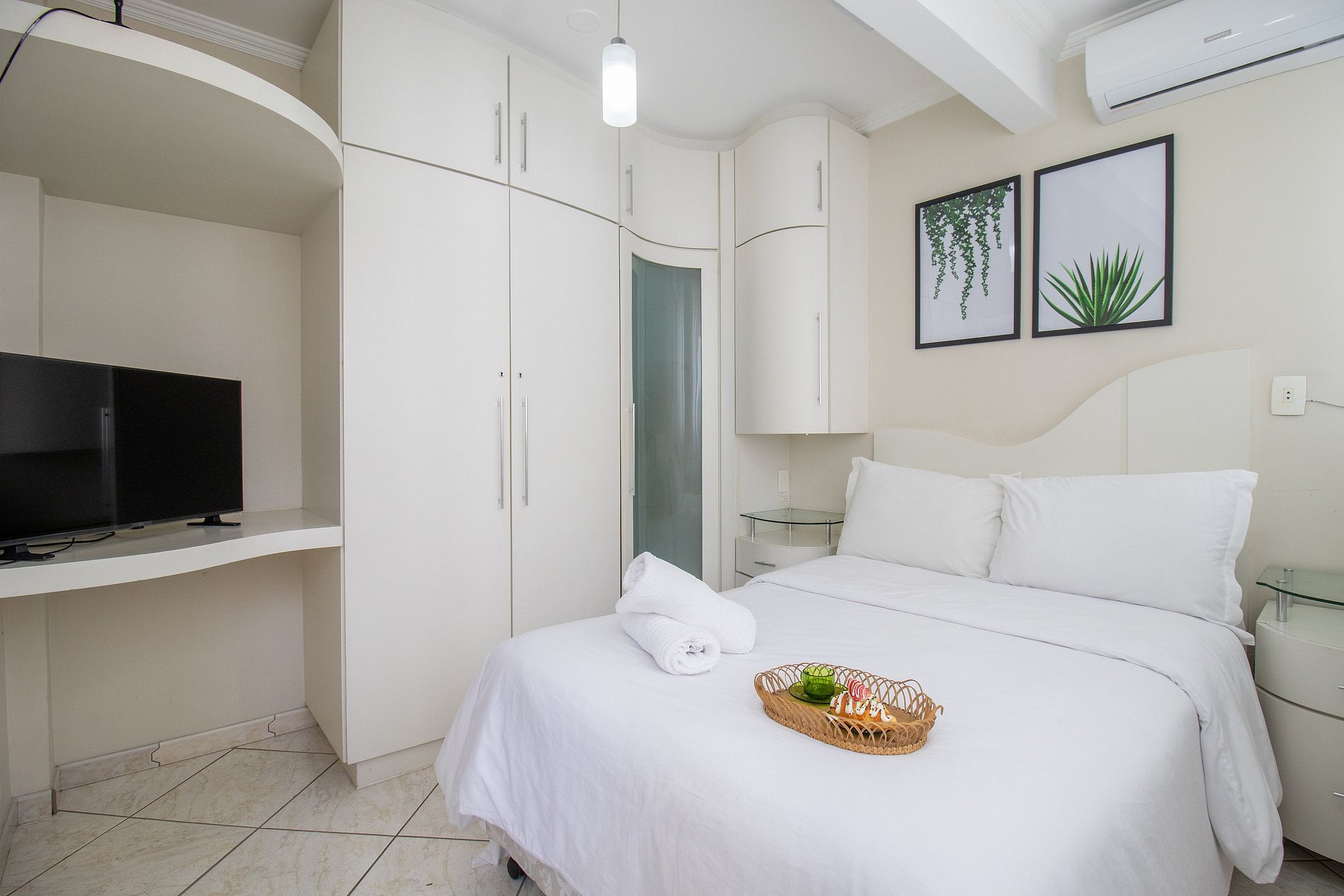 O apartamento conta com três dormitórios, sendo um deles uma suíte, sendo dois deles com uma cama de casal e ar-condicionado e o terceiro quarto com duas camas de solteiro. Todos os colchões são confortáveis. Sala dois ambientes, com ar condicionado e sacada. Cozinha completa com utensílios para refeições básicas.