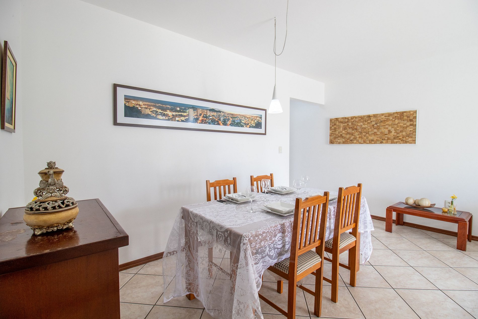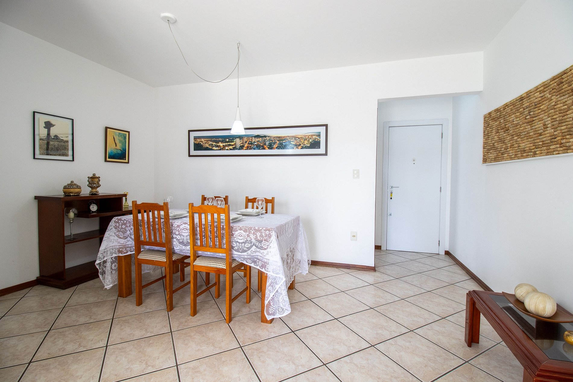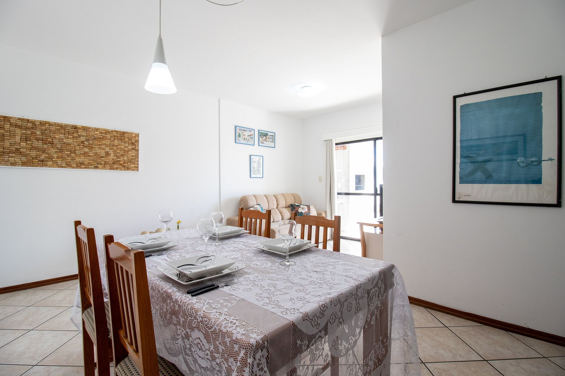 O apartamento conta com três dormitórios e dois banheiros, um dos dormitórios é suíte. Na suíte há uma cama casal e ar condicionado, no segundo quarto há uma cama casal e no terceiro há duas camas de solteiro, além de dois colchões de solteiro avulsos. Há uma sala grande com dois ambientes, um deles com mesa de jantar com 4 cadeiras e do outro lado a sala com TV Smart. A sala leva até a ampla sacada com churrasqueira e uma linda vista. Cozinha bem equipada com utensílios para refeições básicas, além disso temos sanduicheira, liquidificador, microondas, forno, ferro de passar roupa e secador de cabelo. Lavanderia com lavadora de roupa e local para secar roupas.