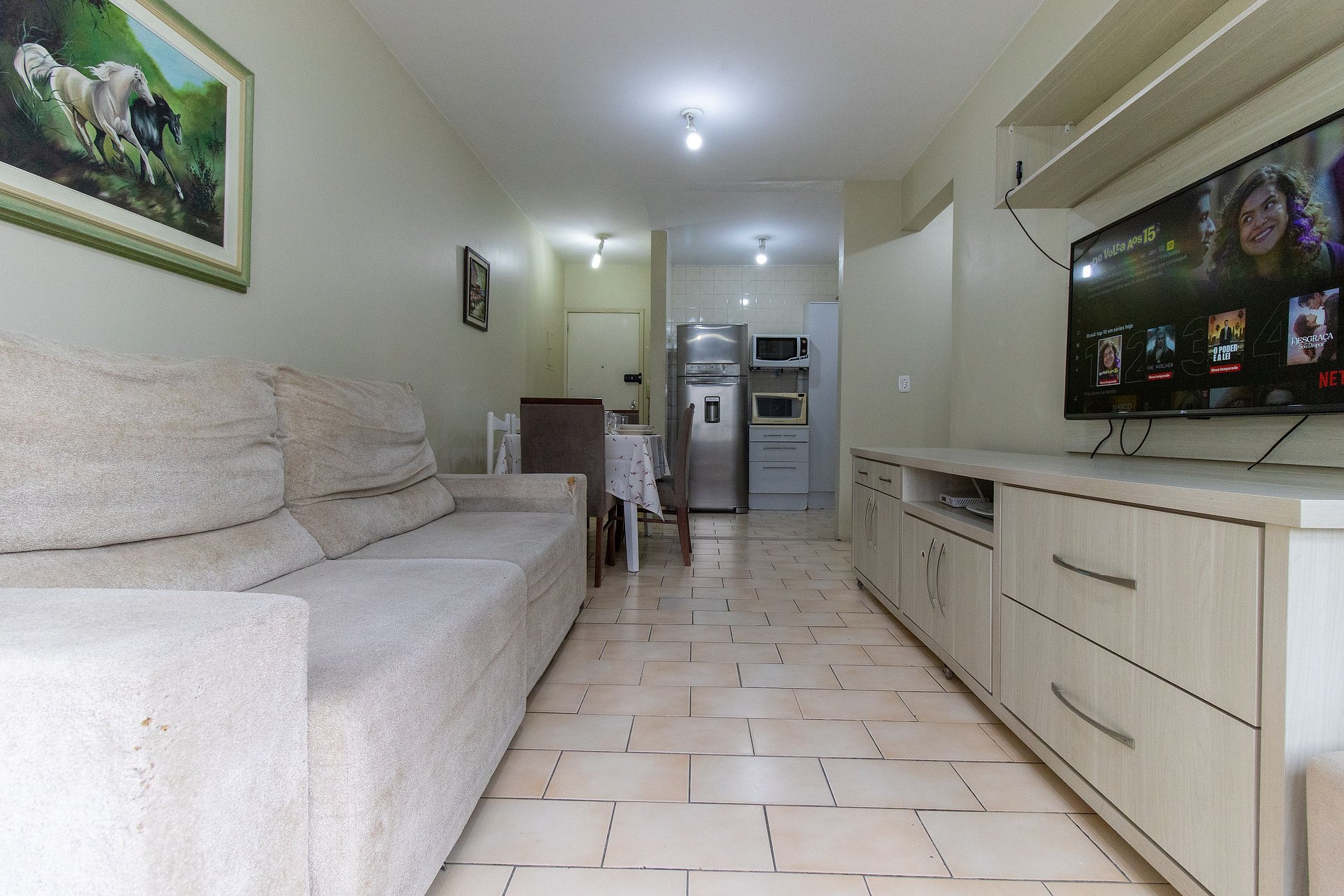O apartamento tem dois dormitórios. Há uma cama queen, uma cama de casal, um colchão de solteiro e uma cama auxiliar, sala com TV Smart. Cozinha equipada com itens para o preparo de refeições básicas e lavanderia com máquina de lavar roupa.