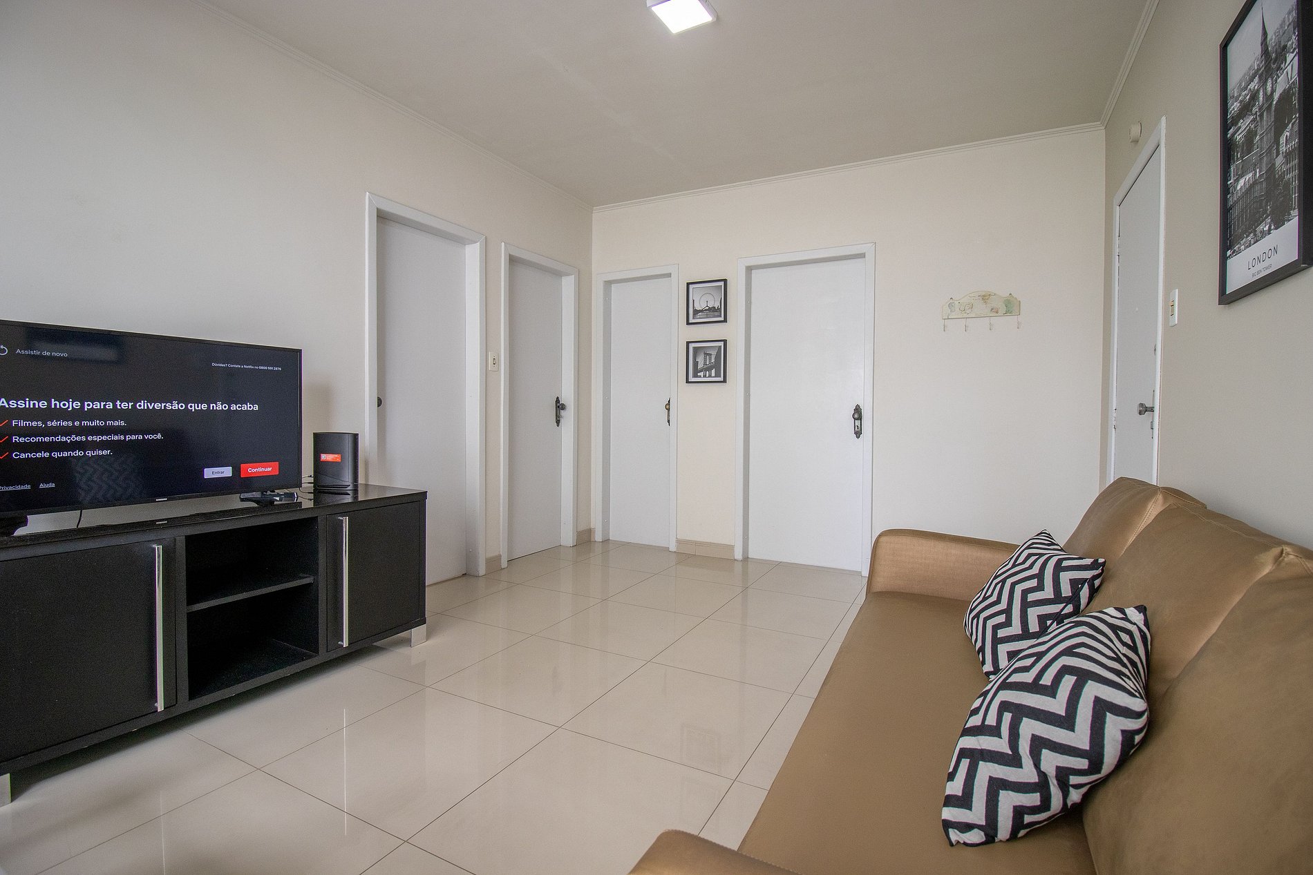 O espaço conta com internet wi-fi e TV Smart na sala.