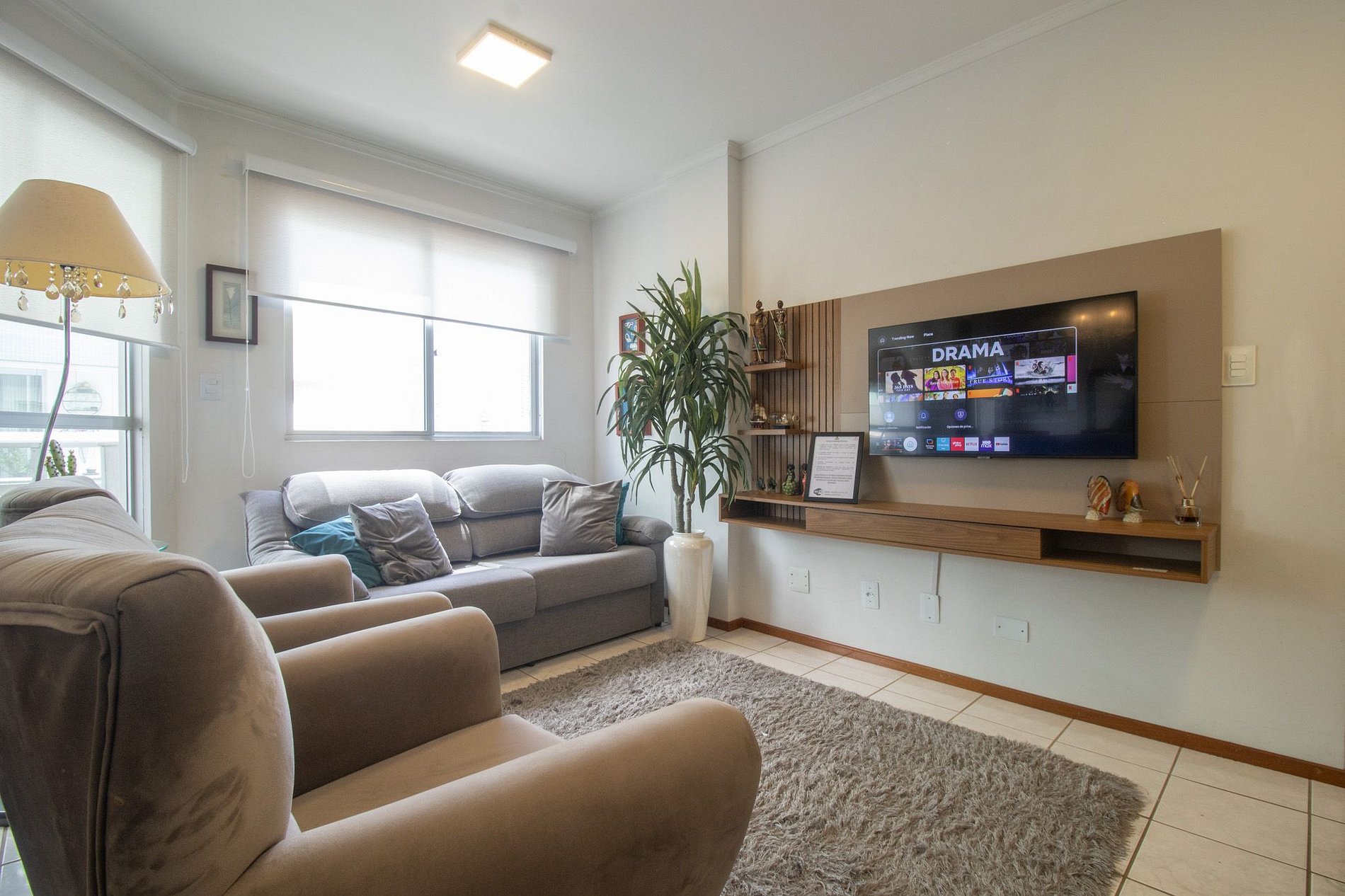 O apartamento possui um ar condicionado na suíte e um ar condicionado na sala, ambos são quente e frio. Para o dormitório maior há um climatizador e para o quarto menor após a cozinha um ventilador de parede.