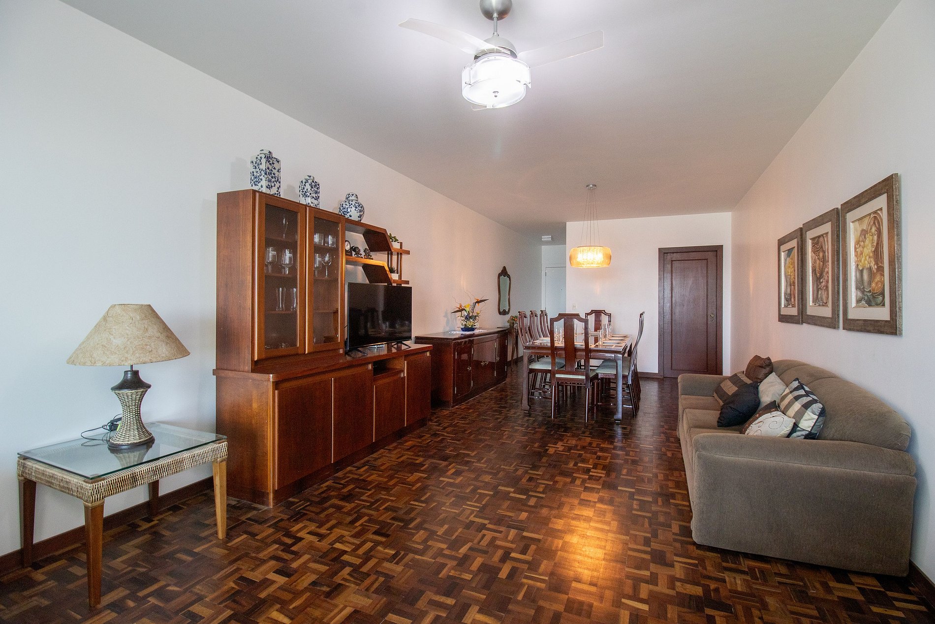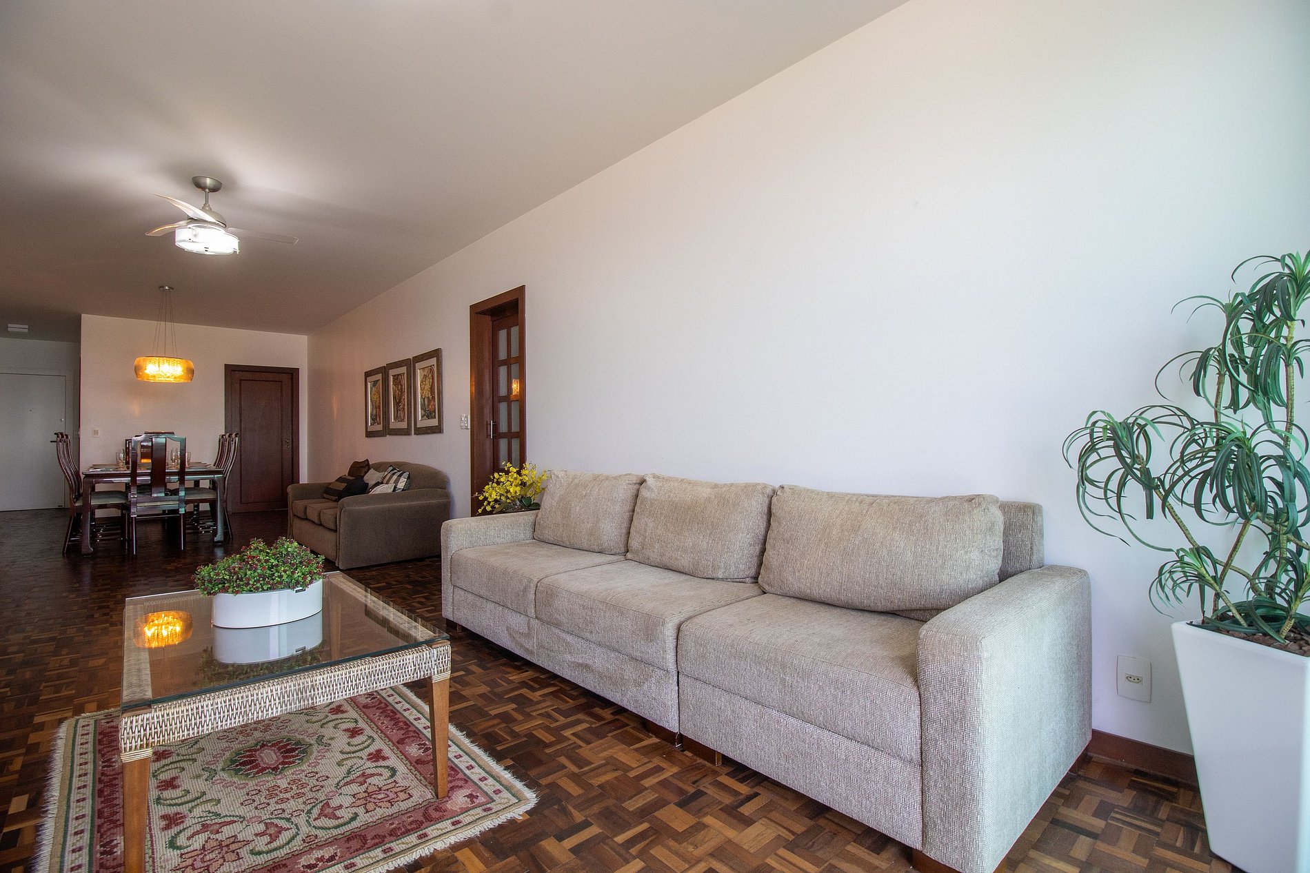 O apartamento acomoda até 8 pessoas com conforto. São três quartos bem distribuídos: uma suíte com cama queen, um quarto com uma beliche, uma cama de solteiro e uma cama auxiliar, além de um quarto nos fundos, também com cama queen e um banheiro. Os espaços são amplos e integrados, com uma sala de estar aconchegante e uma sala de jantar espaçosa com mesa para 8 lugares e três sofás. A varanda oferece uma vista ampla e linda da praia, perfeita para relaxar. A sala conta com TV smart e a cozinha é completa, equipada com tudo o que você precisa no dia a dia, incluindo liquidificador, cafeteira elétrica, lava louças e sanduicheira. São quatro banheiros no total, sendo dois nas suítes, um social e um lavabo. Os chuveiros são elétricos. Há ainda uma área de serviço com máquina de lavar, varal, ferro de passar e secador de cabelo à disposição. Fornecemos roupa de cama, uma toalha de banho por hóspede e oferecemos um edredom para cada cama, garantindo máximo conforto.