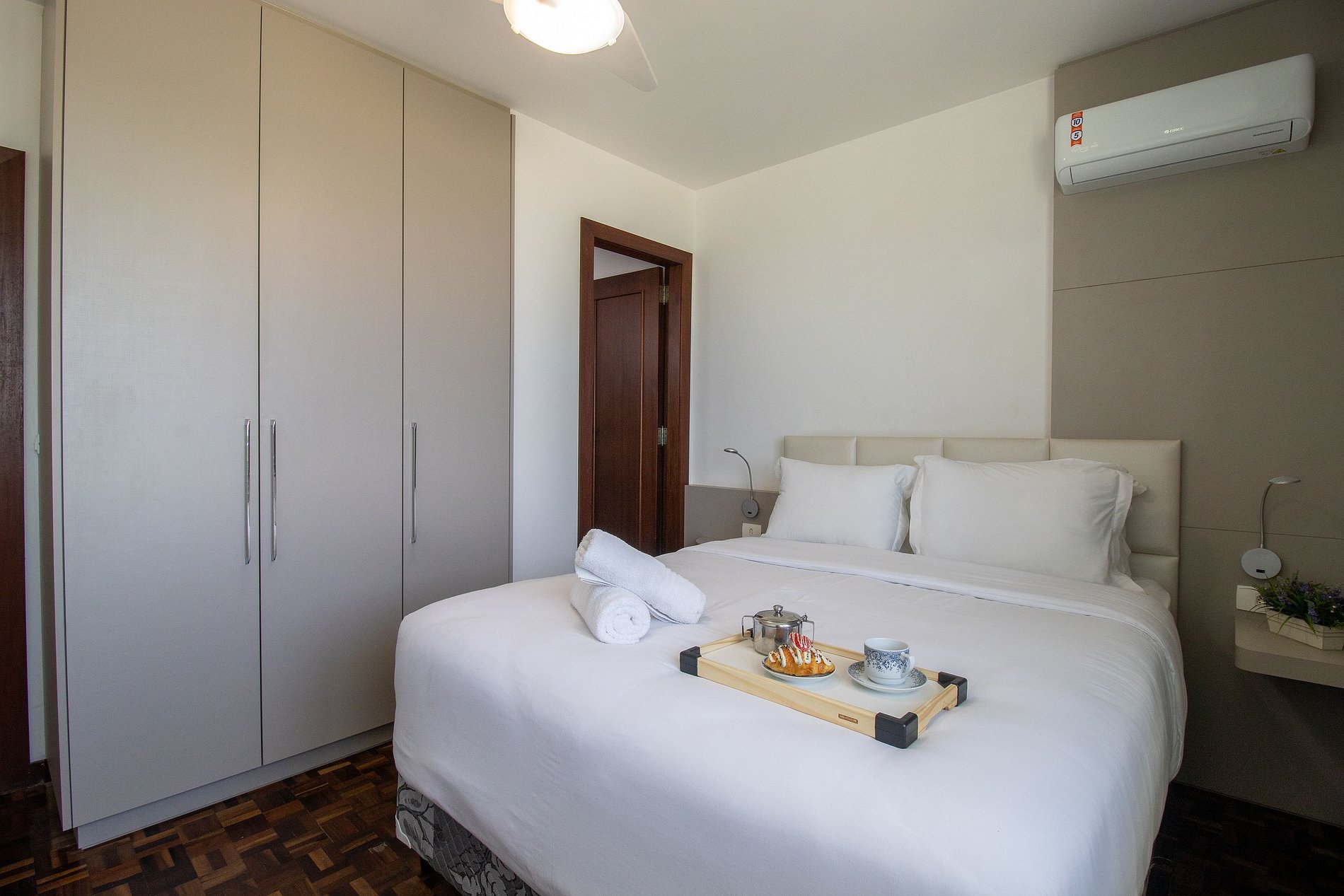O apartamento é totalmente climatizado. Conta com ar-condicionado split em cada um dos três quartos e na sala de estar. Os aparelhos dos quartos possuem apenas modo de refrigeração, enquanto o da sala oferece tanto a função quente quanto fria, ideal para diferentes épocas do ano.