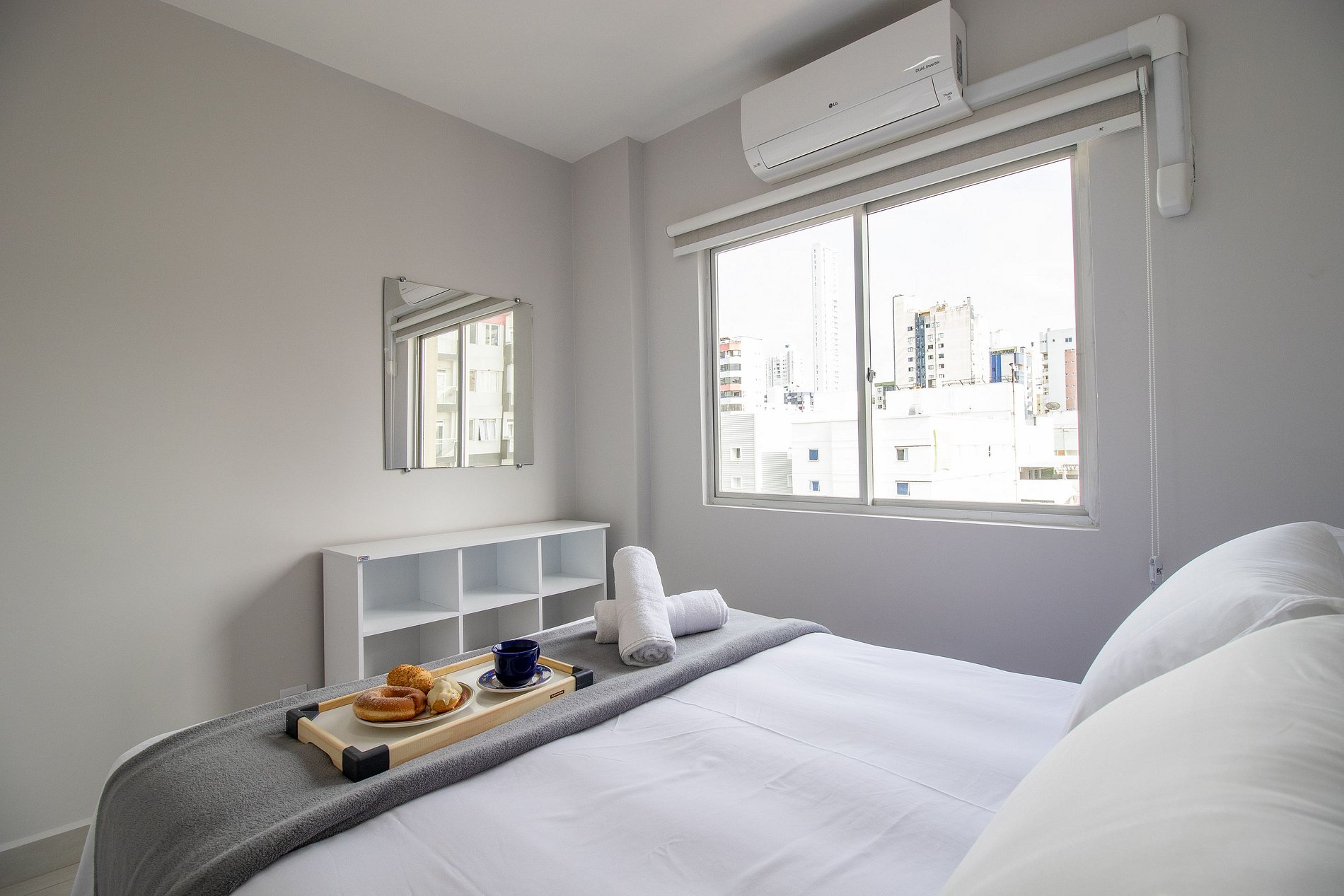 O apartamento é climatizado por dois ares condicionados Split, sendo um em cada quarto.
