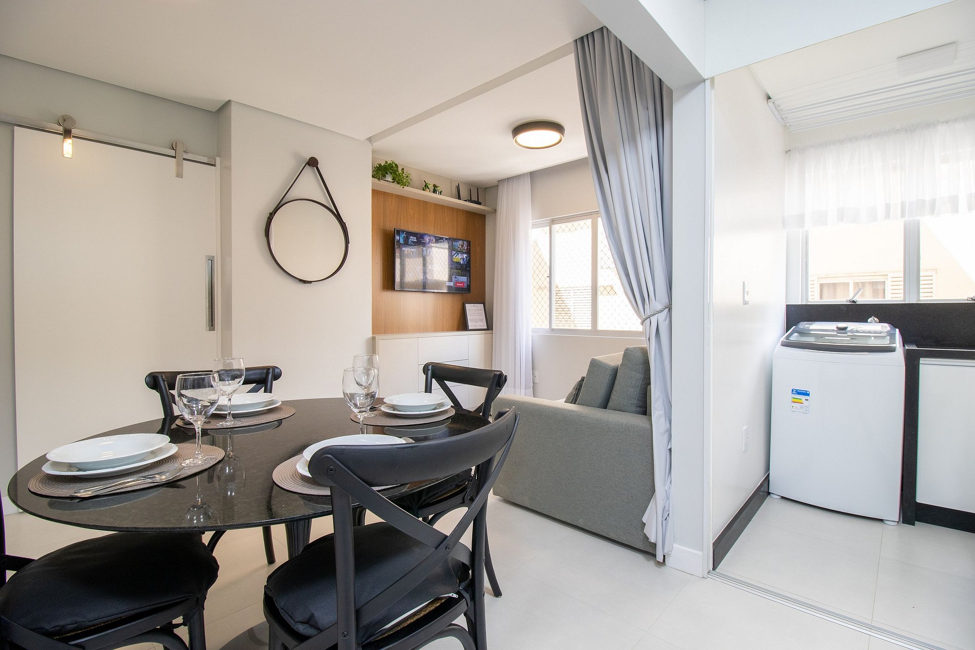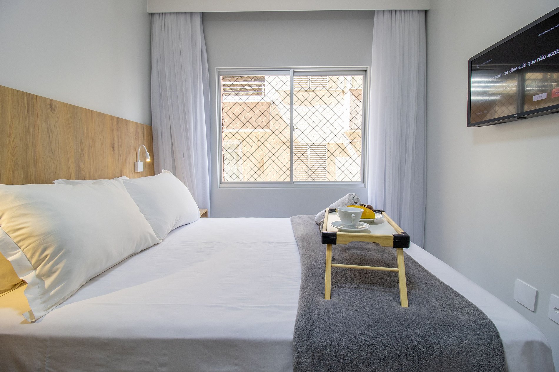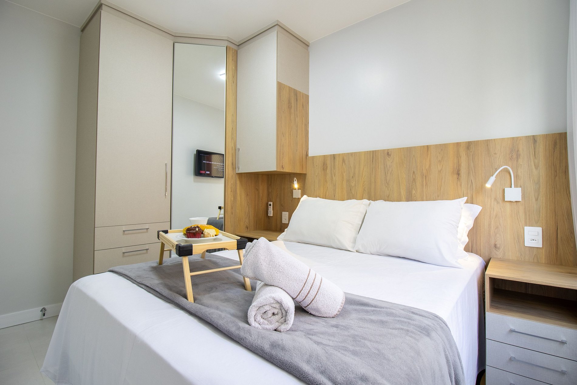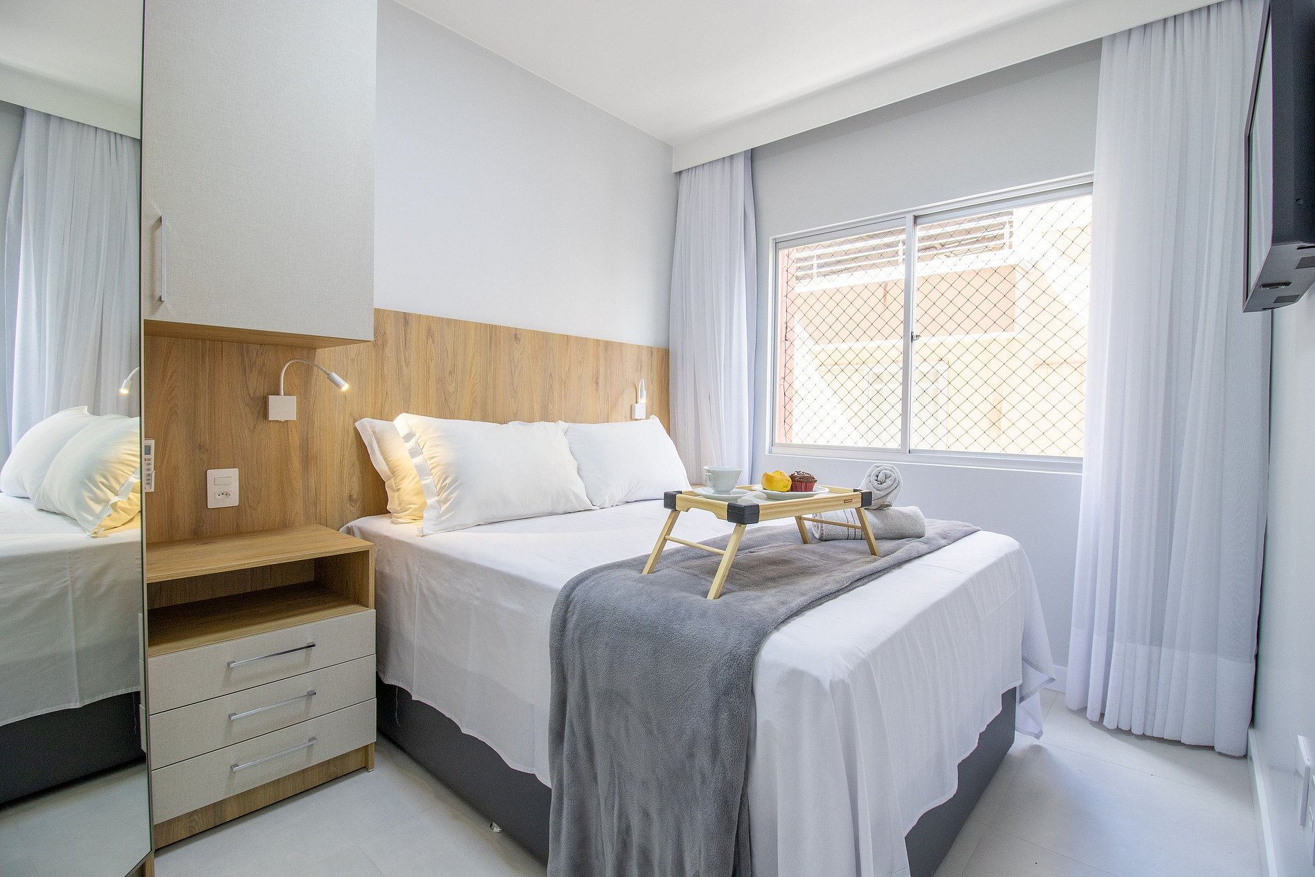 O apartamento conta com um dormitório com cama de casal, um colchão de solteiro avulso e TV Smart. Sala com sofá-cama e TV Smart. Cozinha equipada com utensílios para o preparo de refeições básicas, liquidificador, sanduicheira, cafeteira. Área de serviço com máquina de lavar, ferro de passar e secador de cabelo.