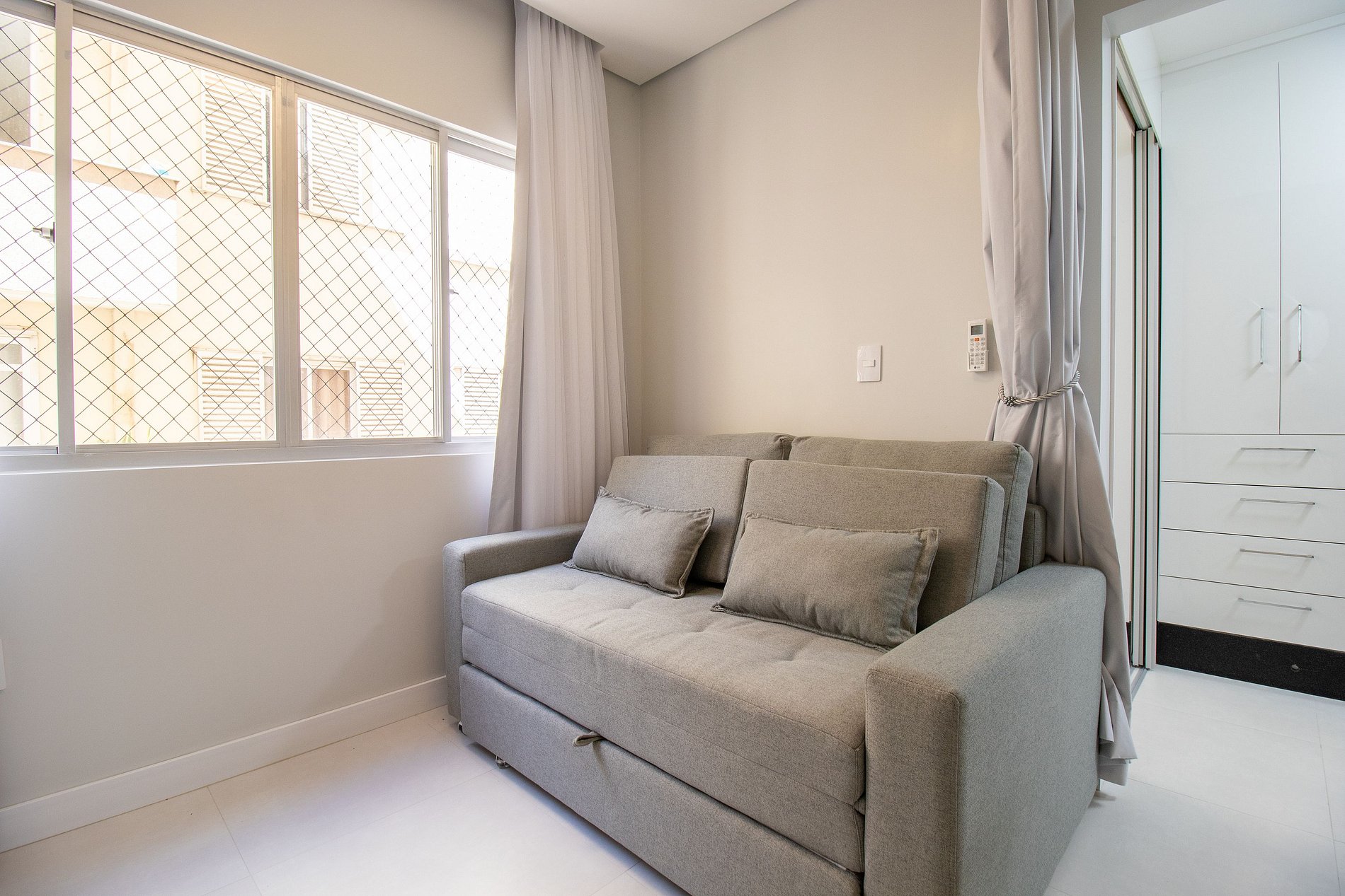 Ao total são dois ares condicionados splits quente/frio, sendo um no quarto e um na sala.