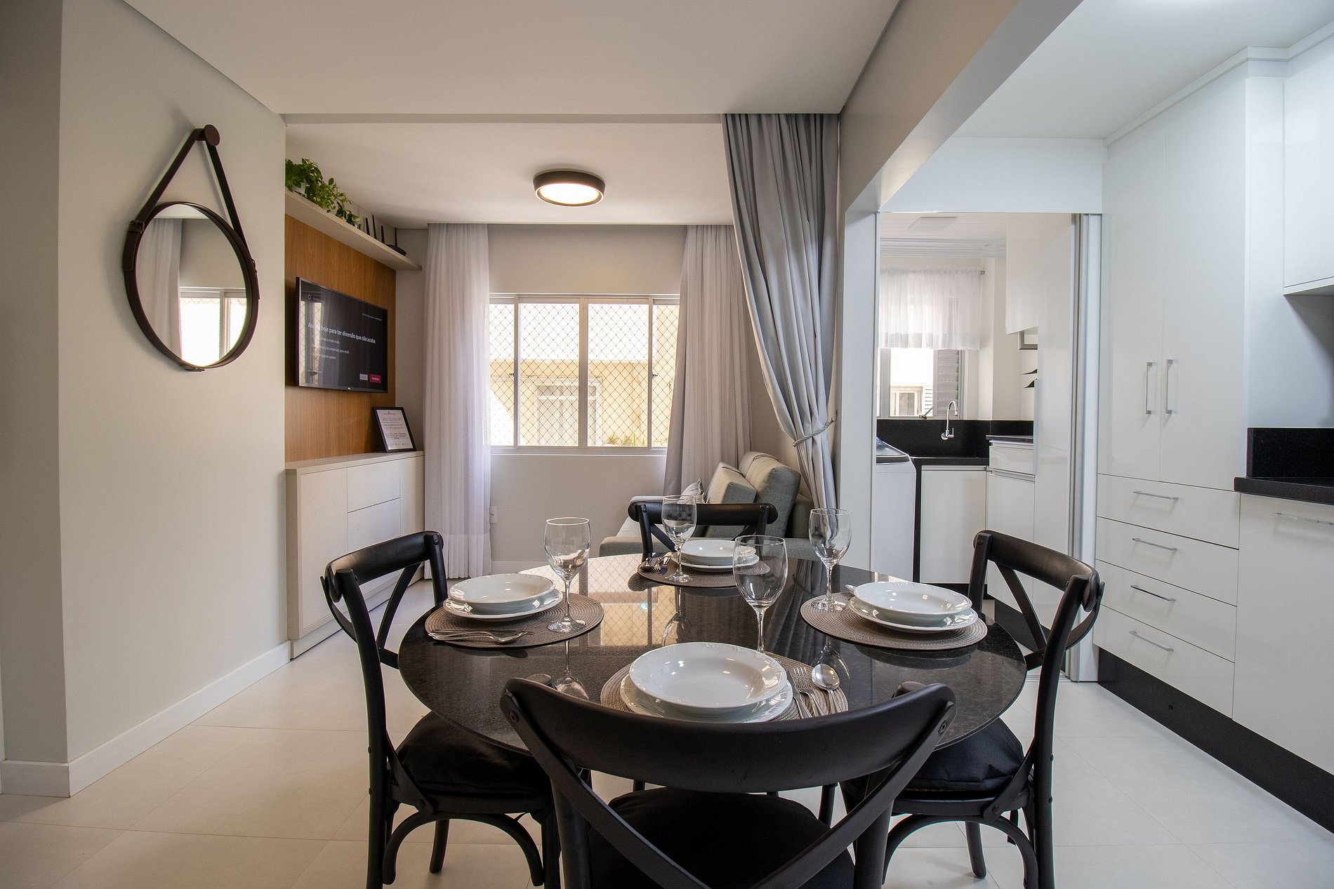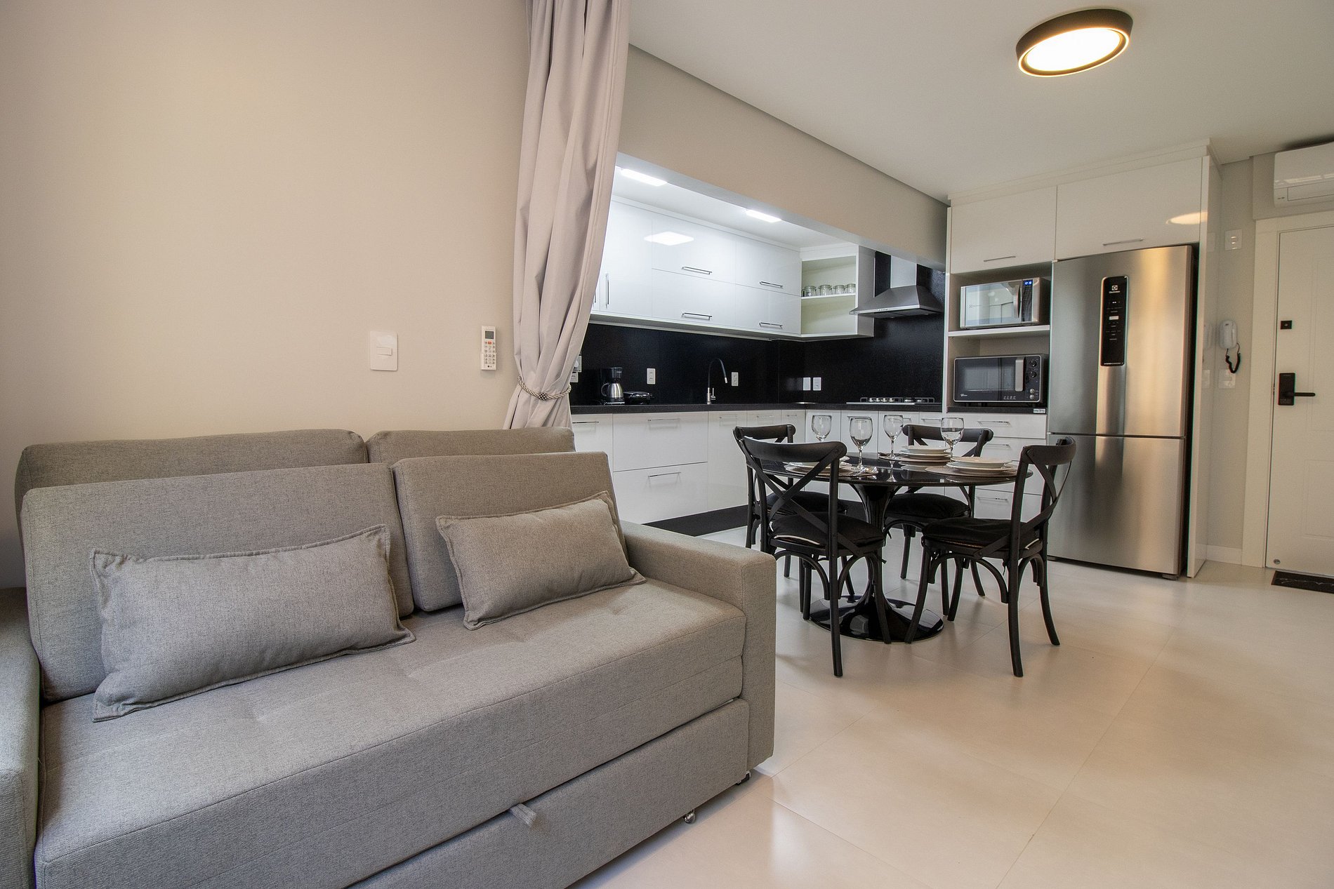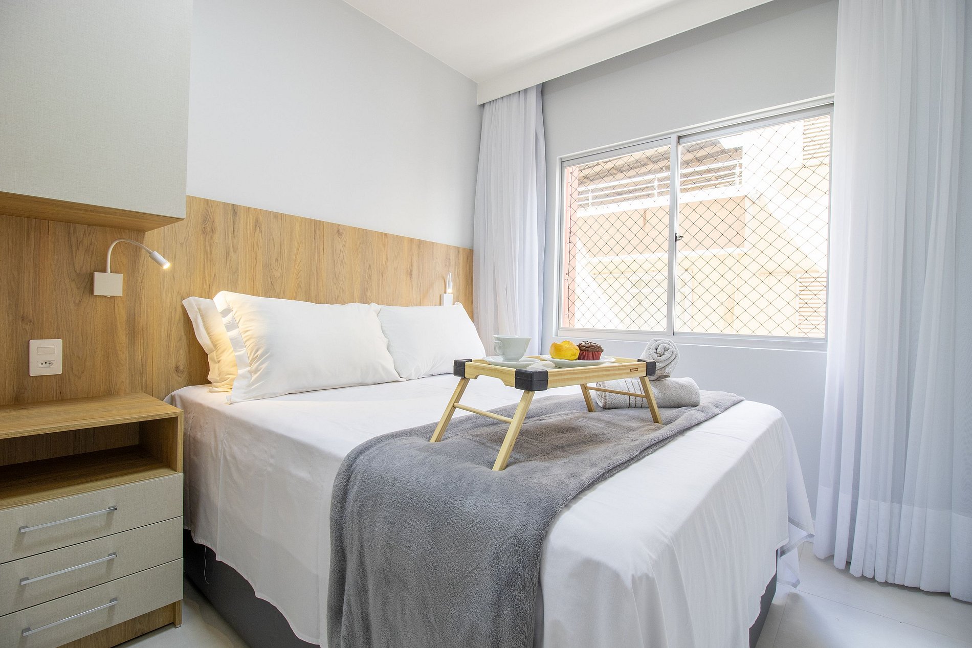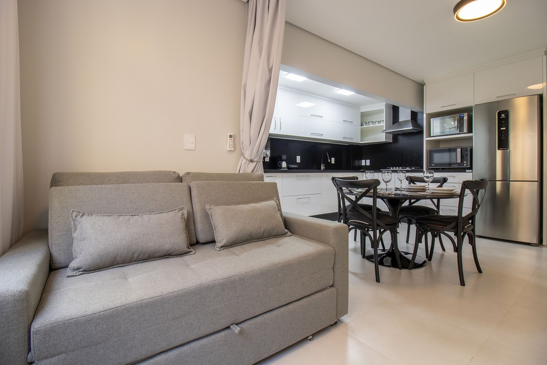 O apartamento conta com um dormitório com cama de casal, um colchão de solteiro avulso e TV Smart. Sala com sofá-cama e TV Smart. Cozinha equipada com utensílios para o preparo de refeições básicas, liquidificador, sanduicheira, cafeteira. Área de serviço com máquina de lavar, ferro de passar e secador de cabelo.