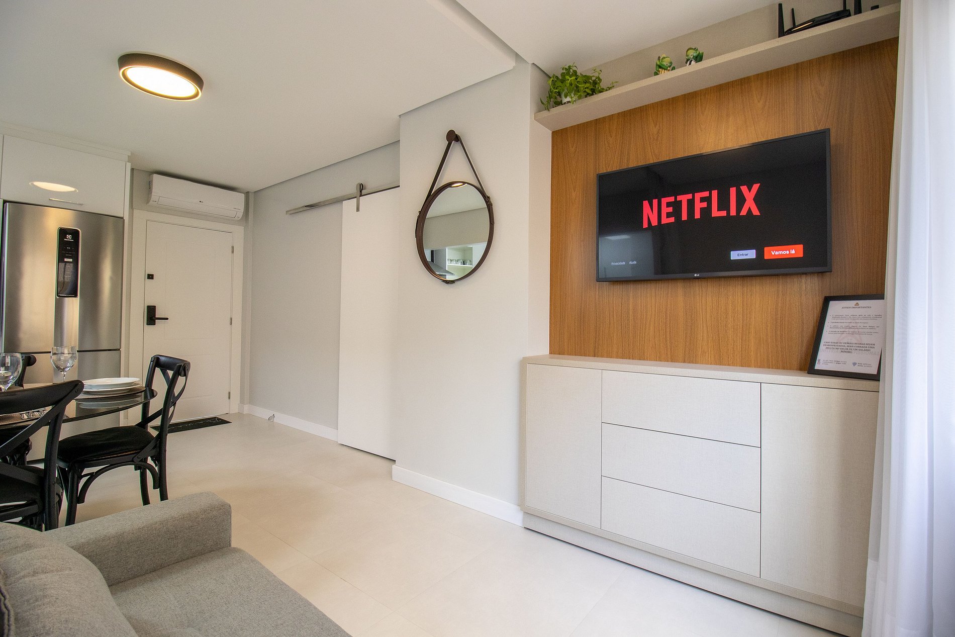 Ao total são dois ares condicionados splits quente/frio, sendo um no quarto e um na sala.