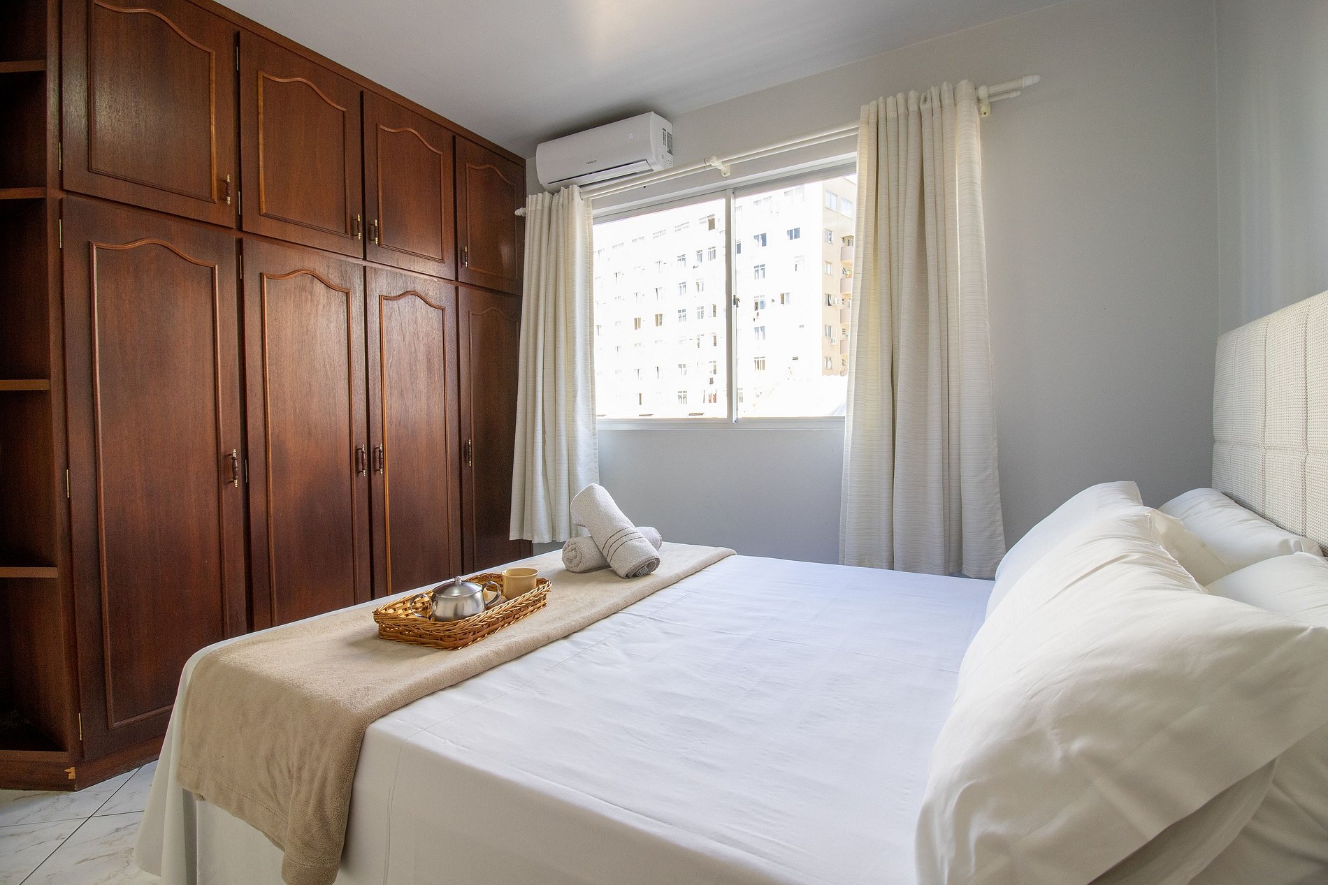 O apartamento conta com quatro dormitórios, sendo três maiores e um menor após a cozinha, ao total são três camas de casal e duas camas de solteiro. Há ar condicionado nos dormitórios maiores e na sala, sala ampla com dois ambientes. Cozinha equipada com utensílios para refeições básicas. Lavanderia com máquina de lavar.