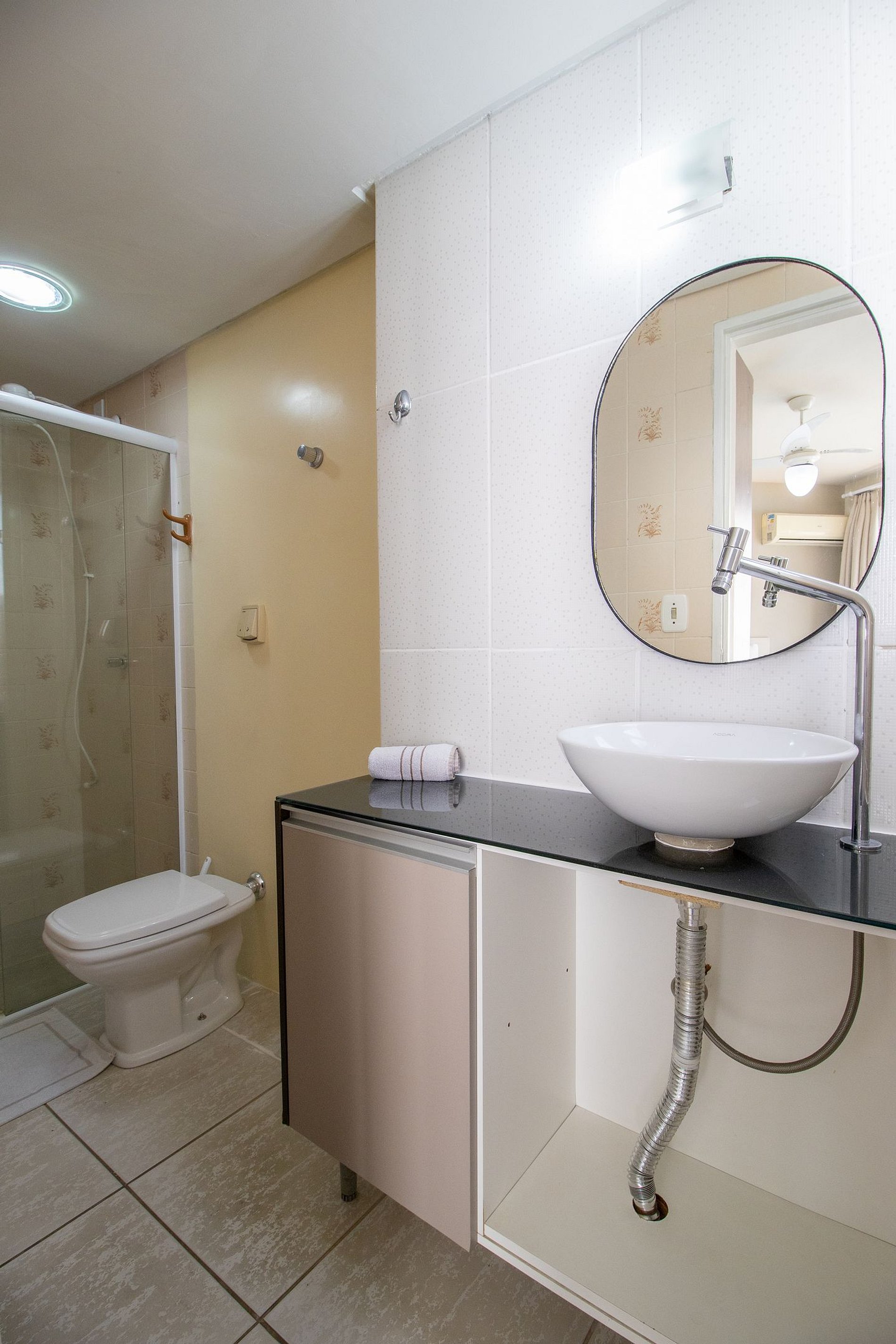 O apartamento conta com 3 aparelhos de ar-condicionado split. A suíte possui ar apenas com função de refrigeração, enquanto dois dos quartos têm ar com função quente e frio. O quarto dos fundos não possui ar-condicionado, apenas um ventilador de teto.