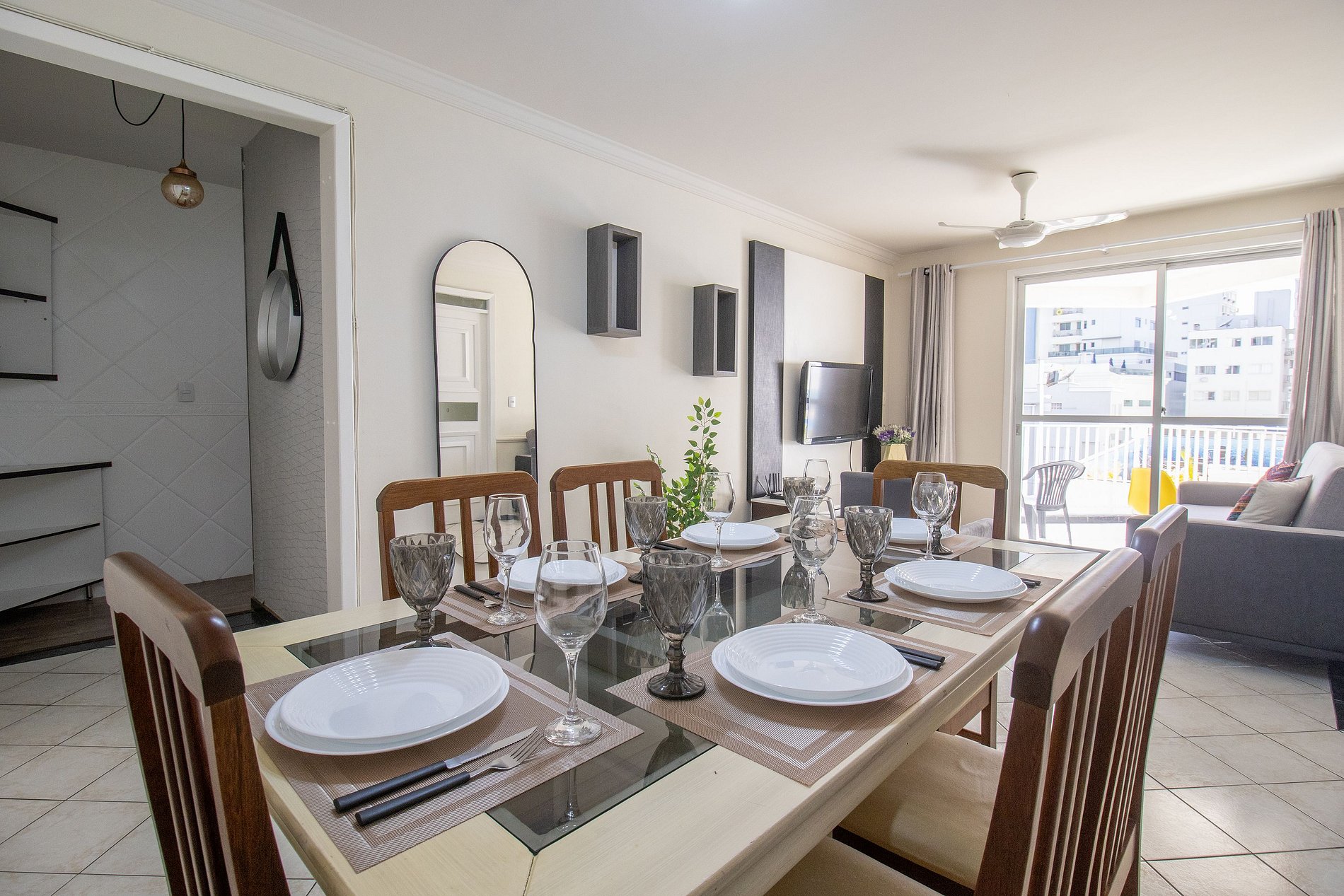 O apartamento possui 4 quartos, todos com cama de casal, incluindo uma suíte, dois quartos e um quarto após a cozinha, acomodando até 8 pessoas. Conta com 3 banheiros com chuveiro elétrico. A sala é bem confortável e integrada à sala de jantar, garantindo um ambiente agradável para relaxar. A cozinha é completa, com utensílios básicos e eletrodomésticos como sanduicheira, liquidificador, cafeteira elétrica, forno e filtro de água. A área de serviço conta com máquina de lavar, ferro e secador de cabelo para deixar tudo mais prático.