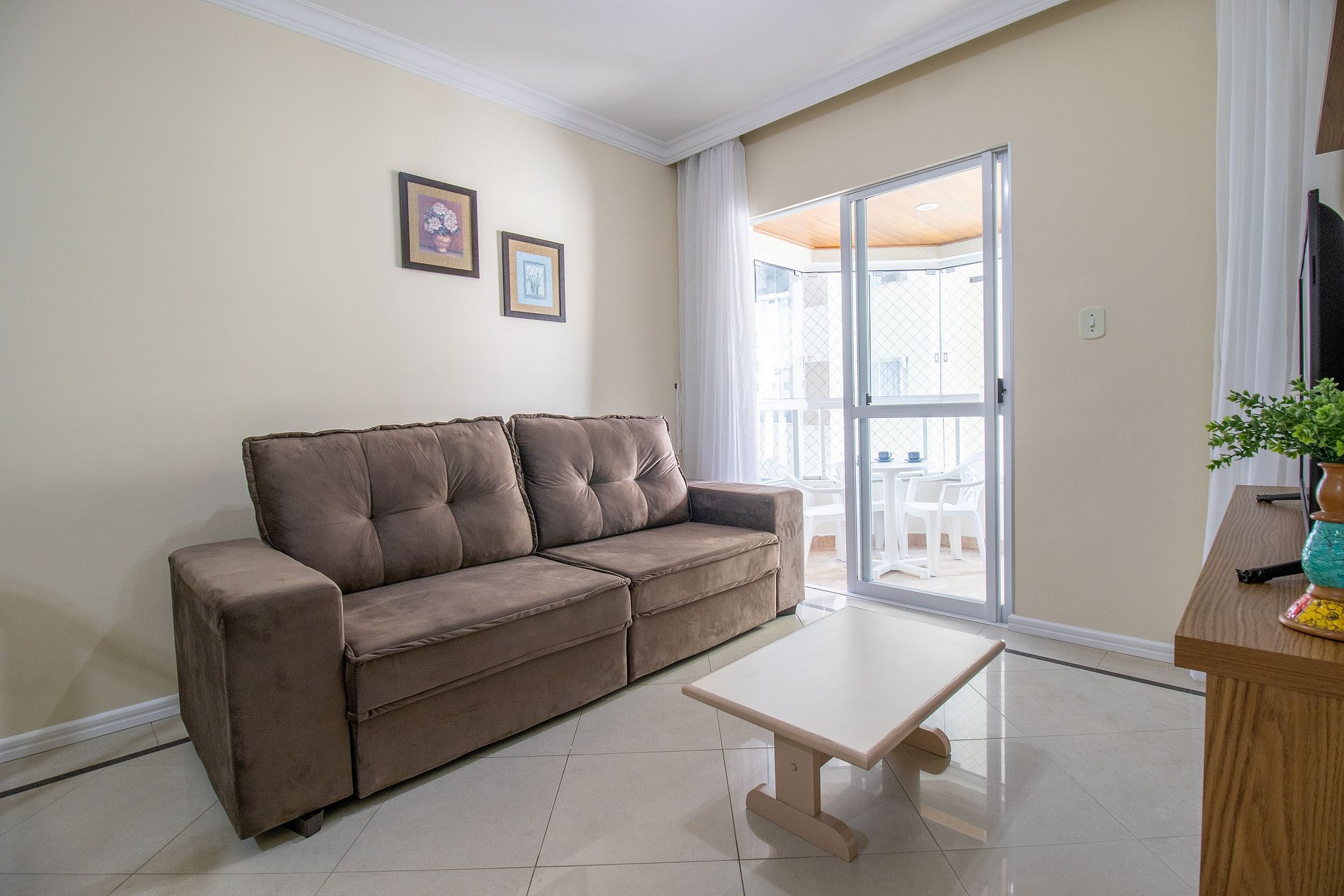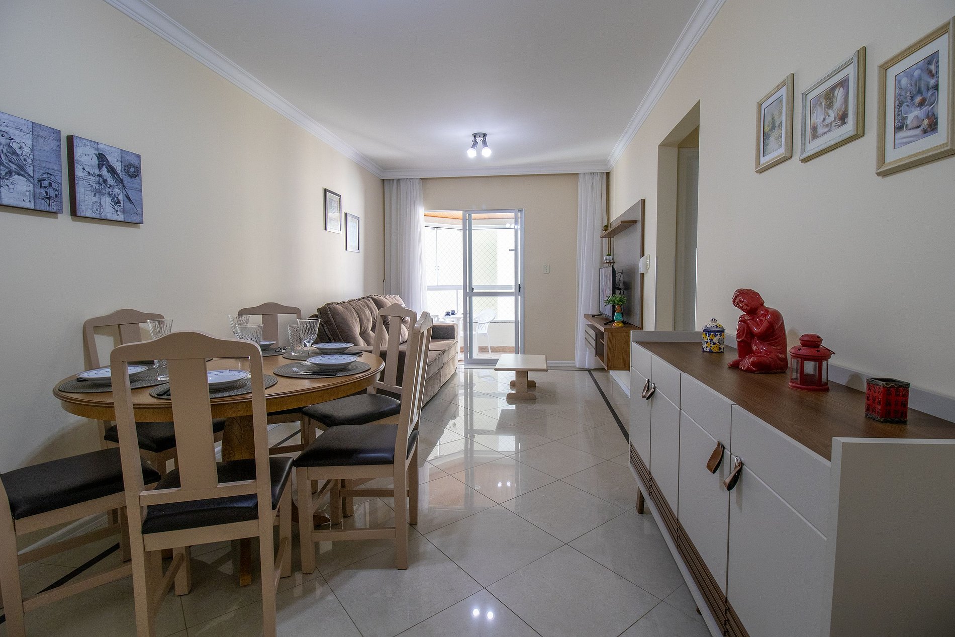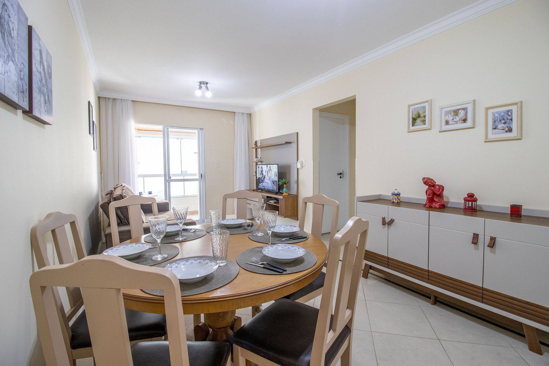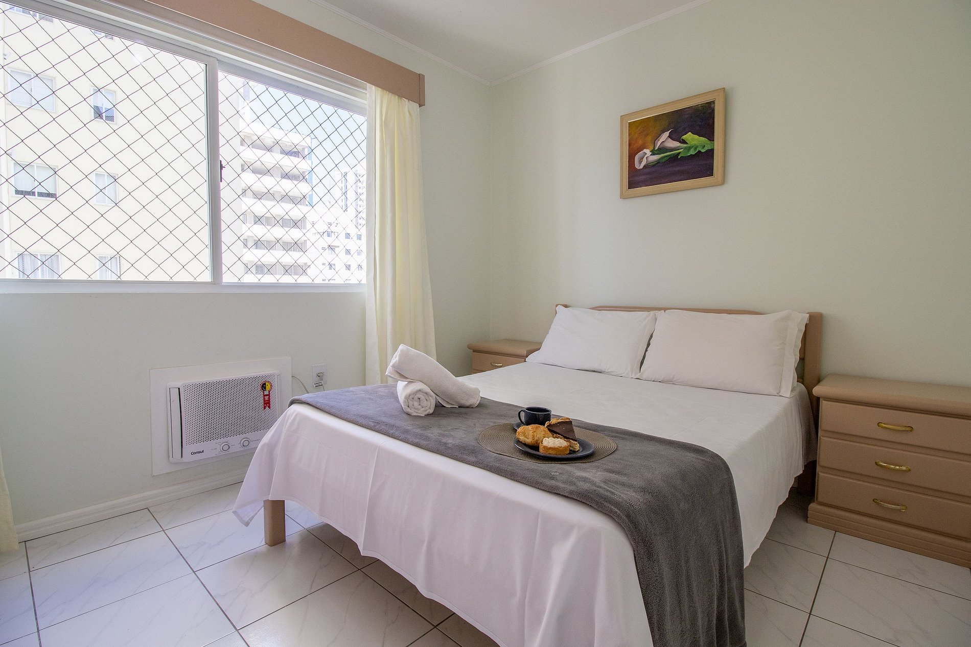 O apartamento dispõe de uma suíte e um dormitório, ambos climatizados, sendo um ar condicionado Split e um de janela. Ao total temos uma cama de casal, duas cama de solteiro e dois colchões de solteiro avulso. Uma sala com dois sofás, uma mesa de jantar e uma TV SMART. A sacada possui uma churrasqueira exclusiva e uma pia, além de ter uma vista parcial do mar. Uma cozinha completa com todos os utensílios para preparar as suas refeições básicas. Oferecemos um edredom para cada cama e uma manta de microfibra para cada colchão avulso, garantindo seu máximo conforto.