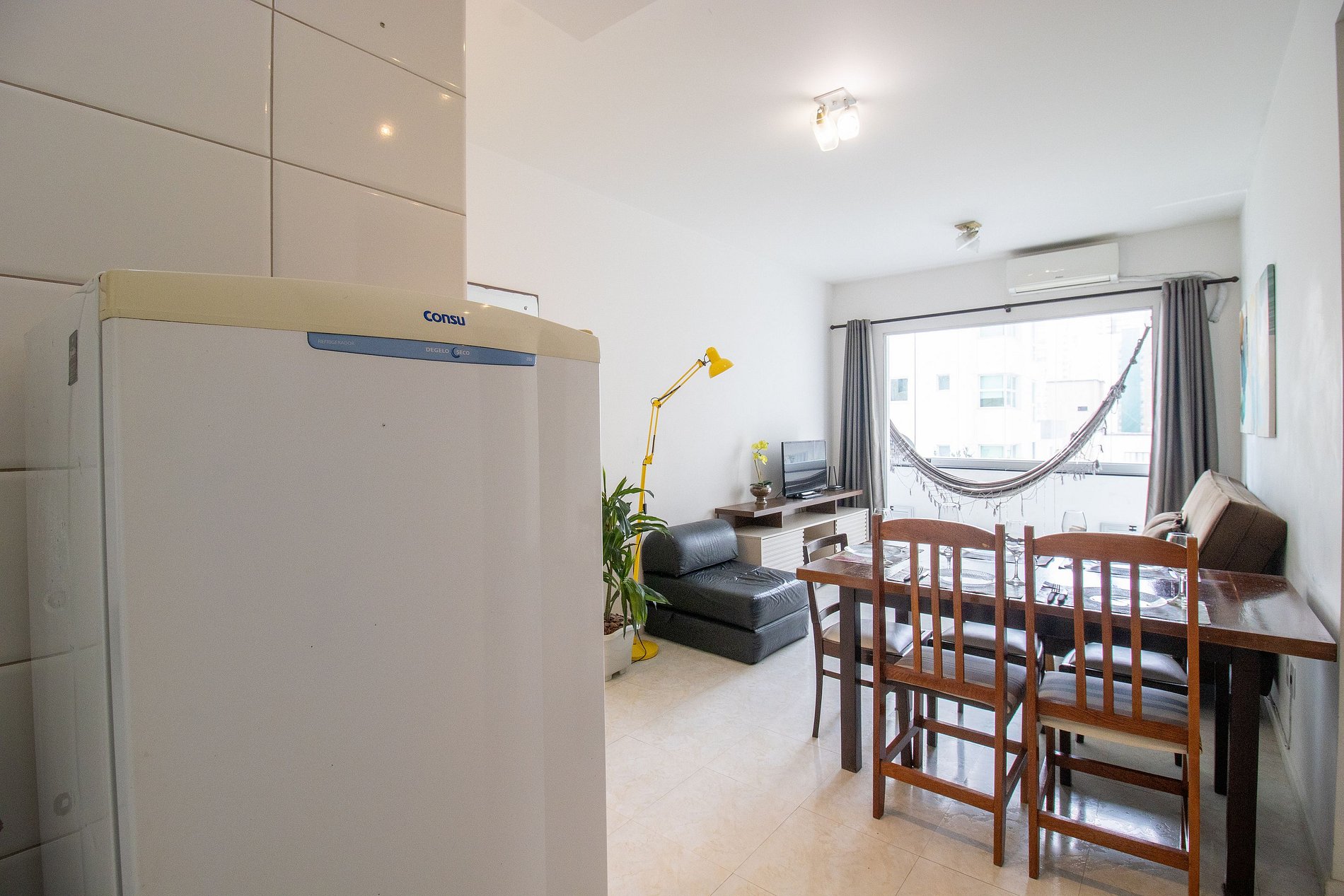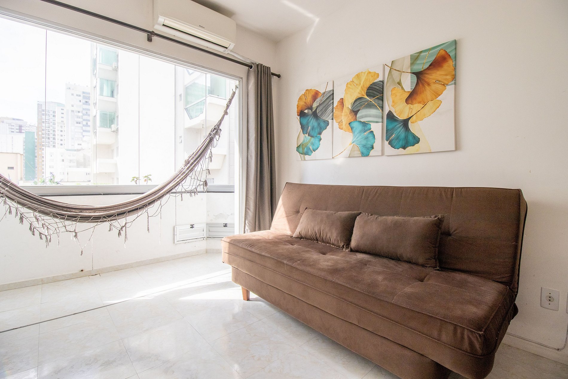 O espaço possui três ares condicionados, sendo um em cada dormitório e na sala. A sala e a suíte contam com um ar condicionado split e o outro dormitório possui ar condicionado de gaveta.