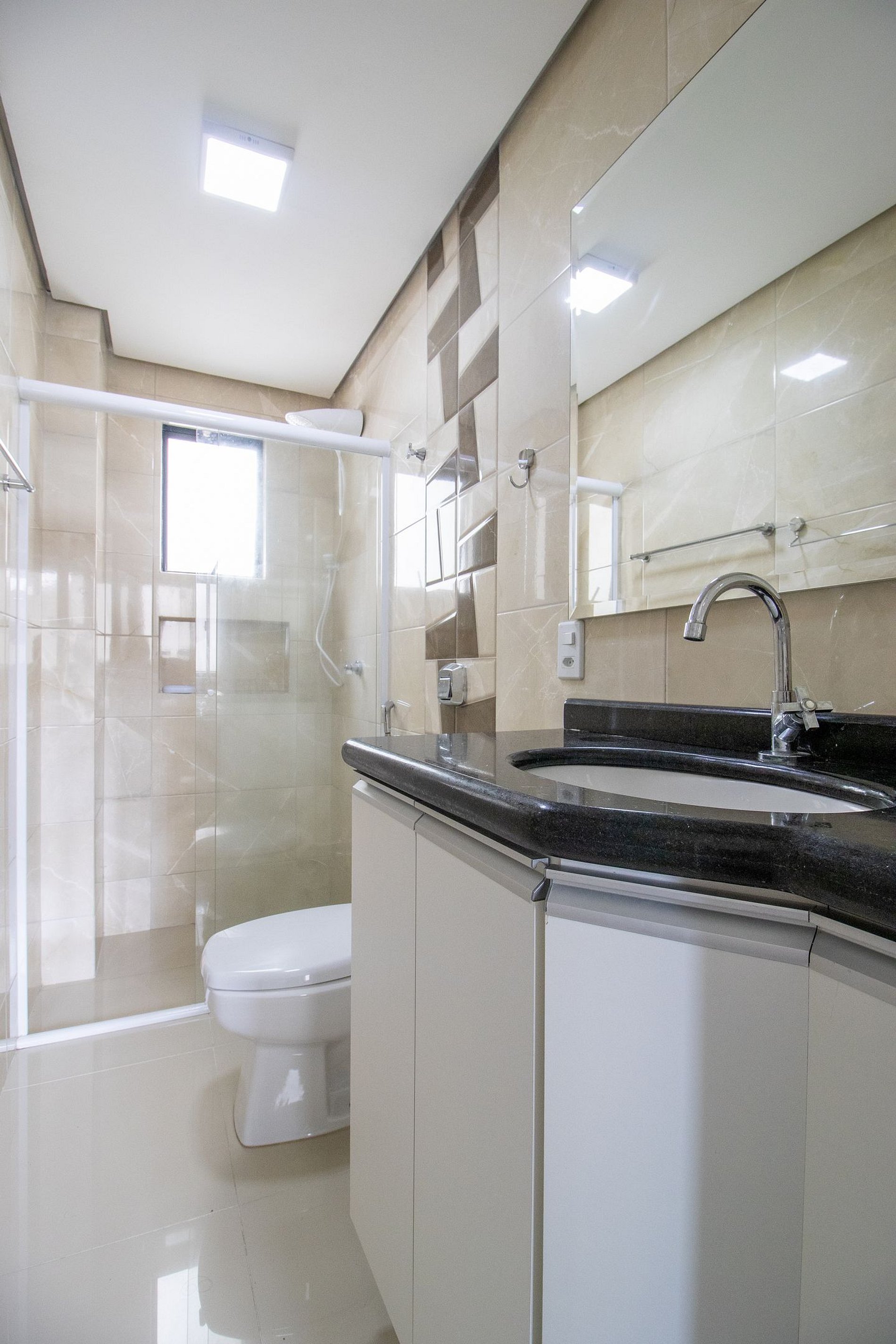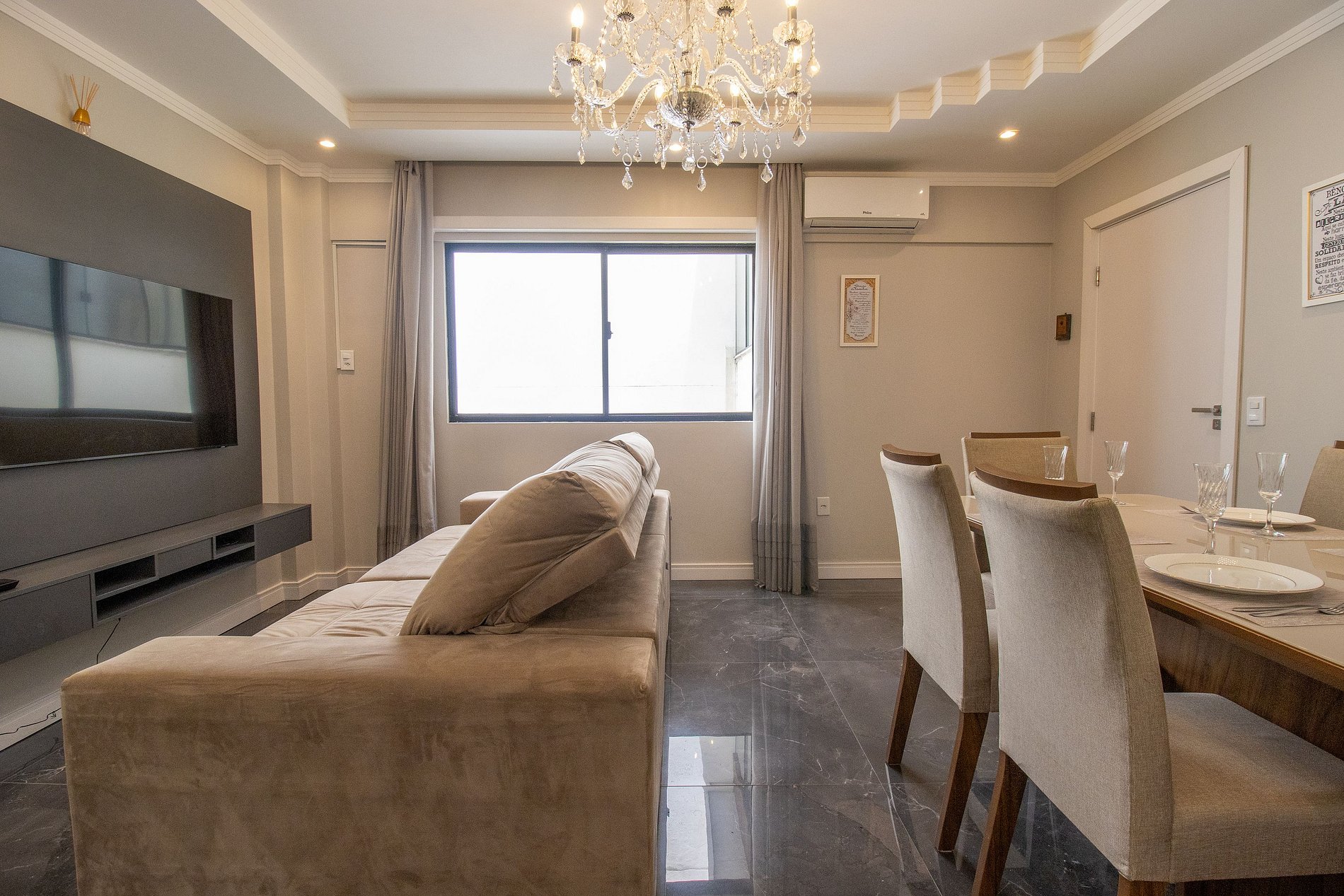 O apartamento conta com três dormitórios, sendo uma suíte e dois dormitórios, dois banheiros. Ao total temos uma cama queen e duas camas de casal.