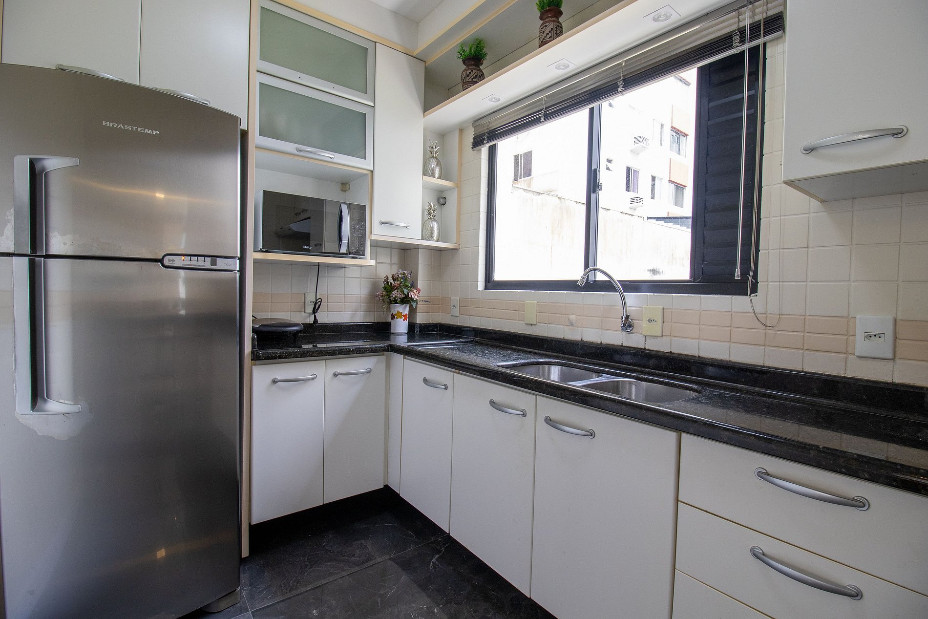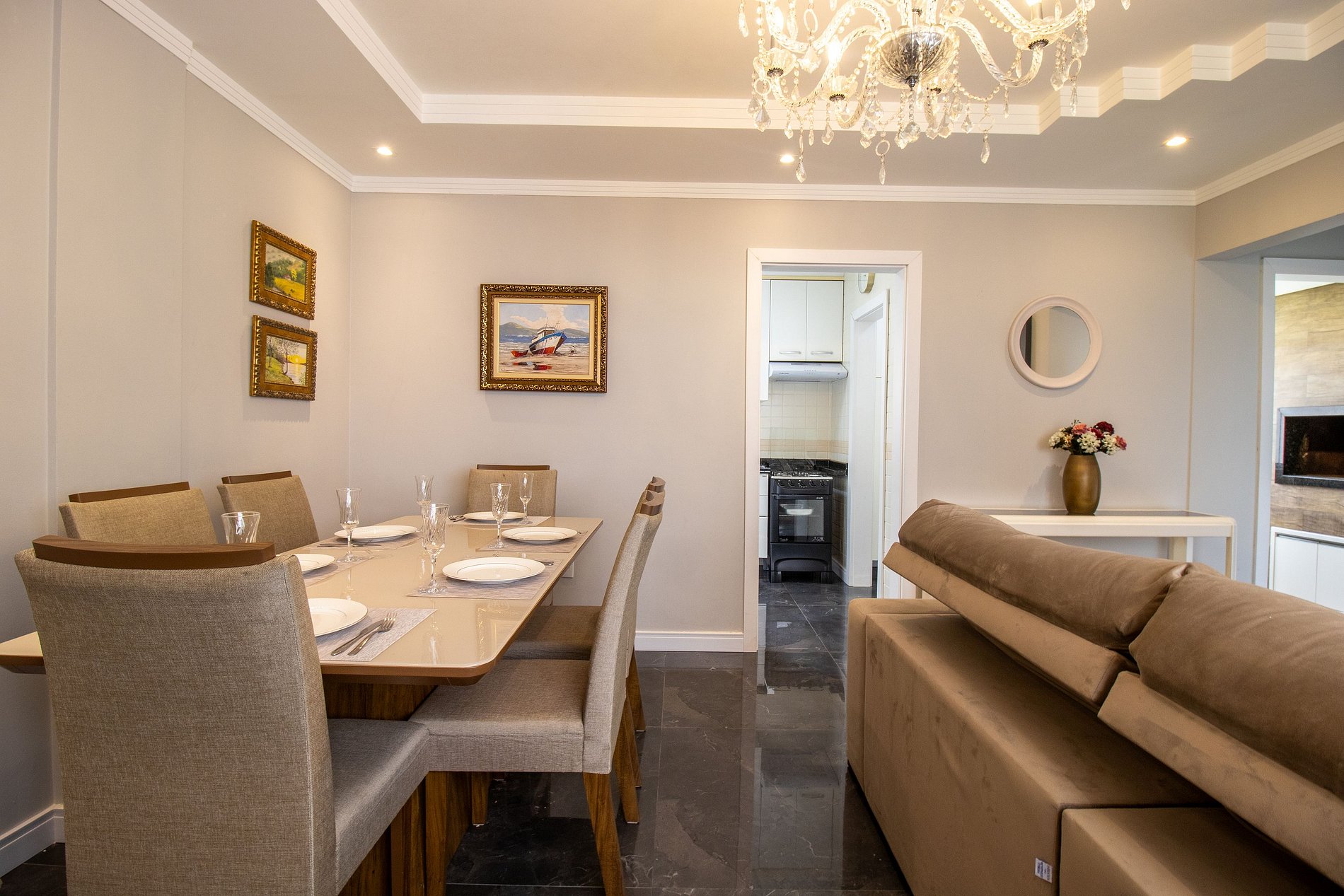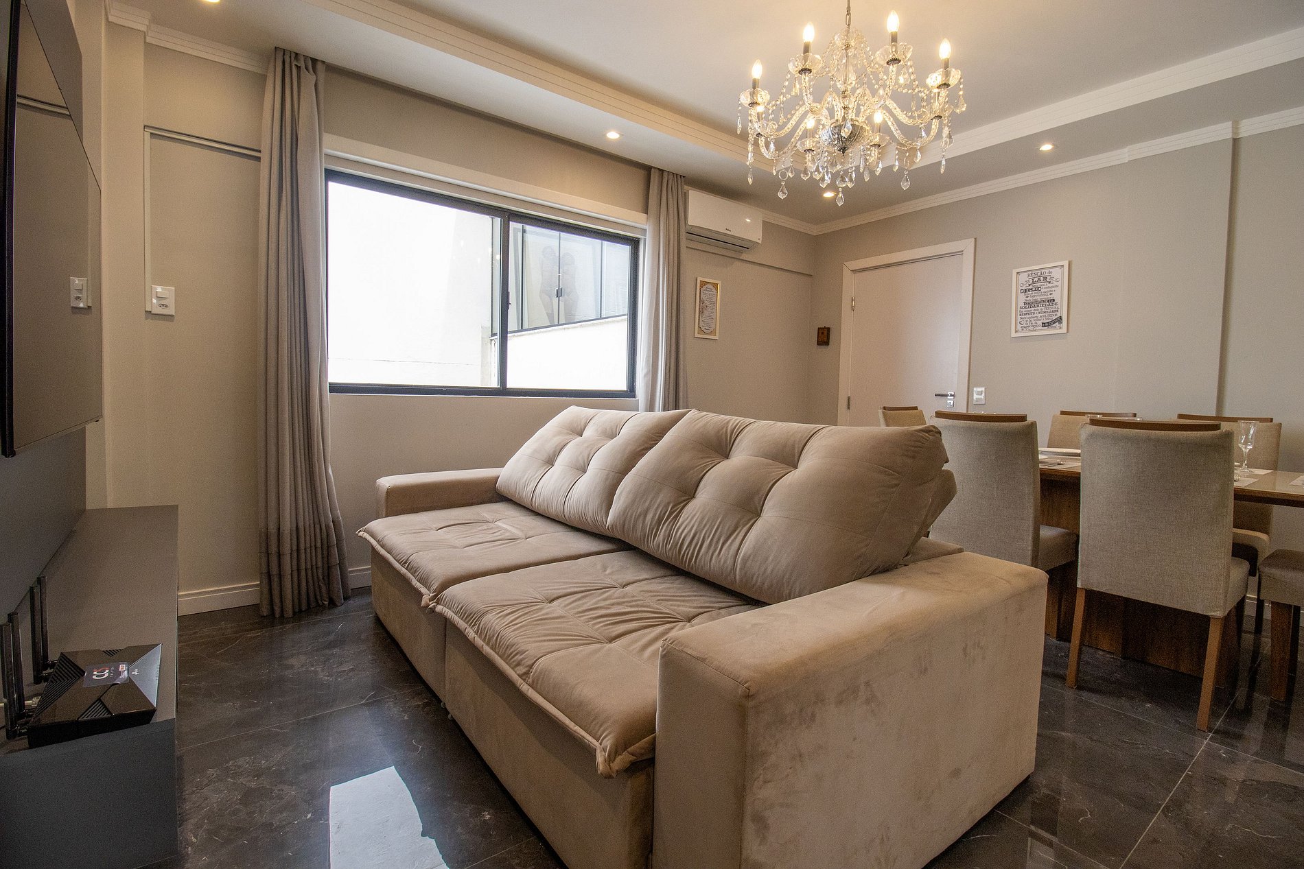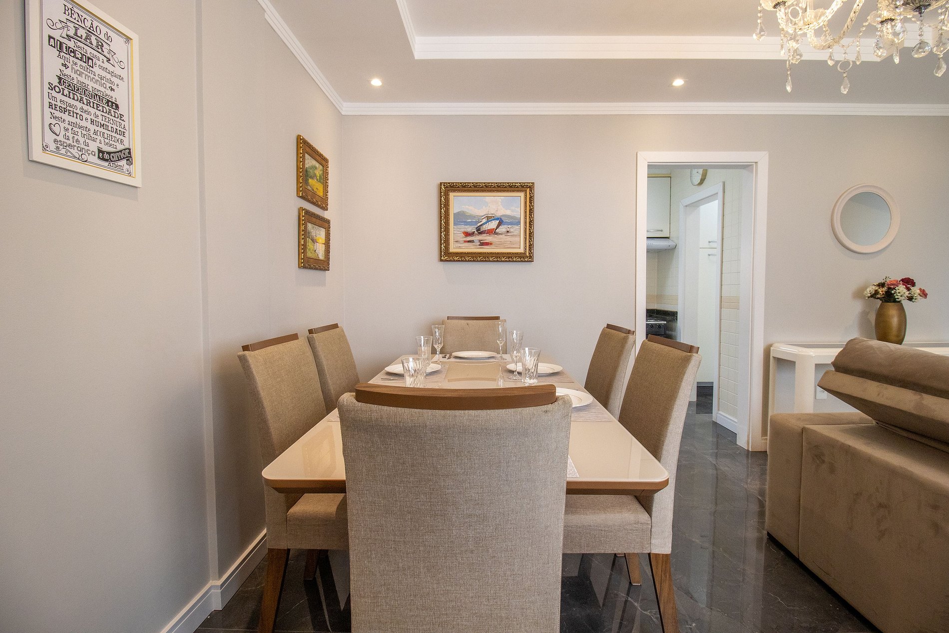 O apartamento conta com uma sala de estar com TV Smart, uma sala de jantar conjugada, área de churrasqueira com vista parcial para o mar (e ótima para um café da manhã), cozinha equipada para refeições básicas.