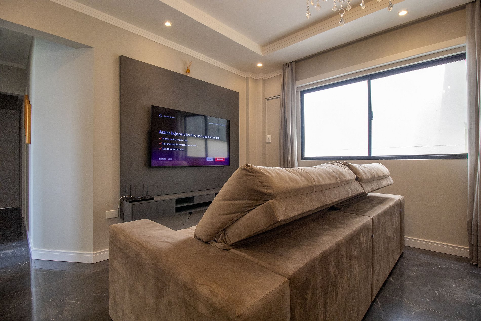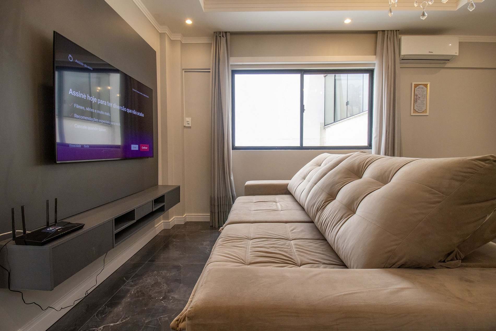 Internet WI-FI de boa velocidade própria do apartamento e TV Smart na sala.